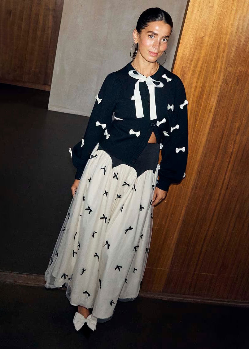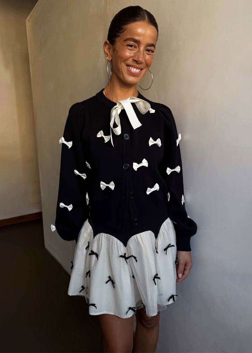 A super soft, heavy knit base that feels super luxe and premium. The 3D bows ina contrast cream add an element of texture to the simple silhouette and feel so chic! With a tie neck fastening that adds to the femininity of the details, it's the perfect example of how we elevate our basics to create iconic pieces.