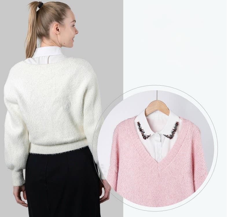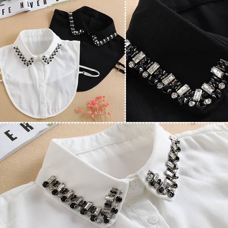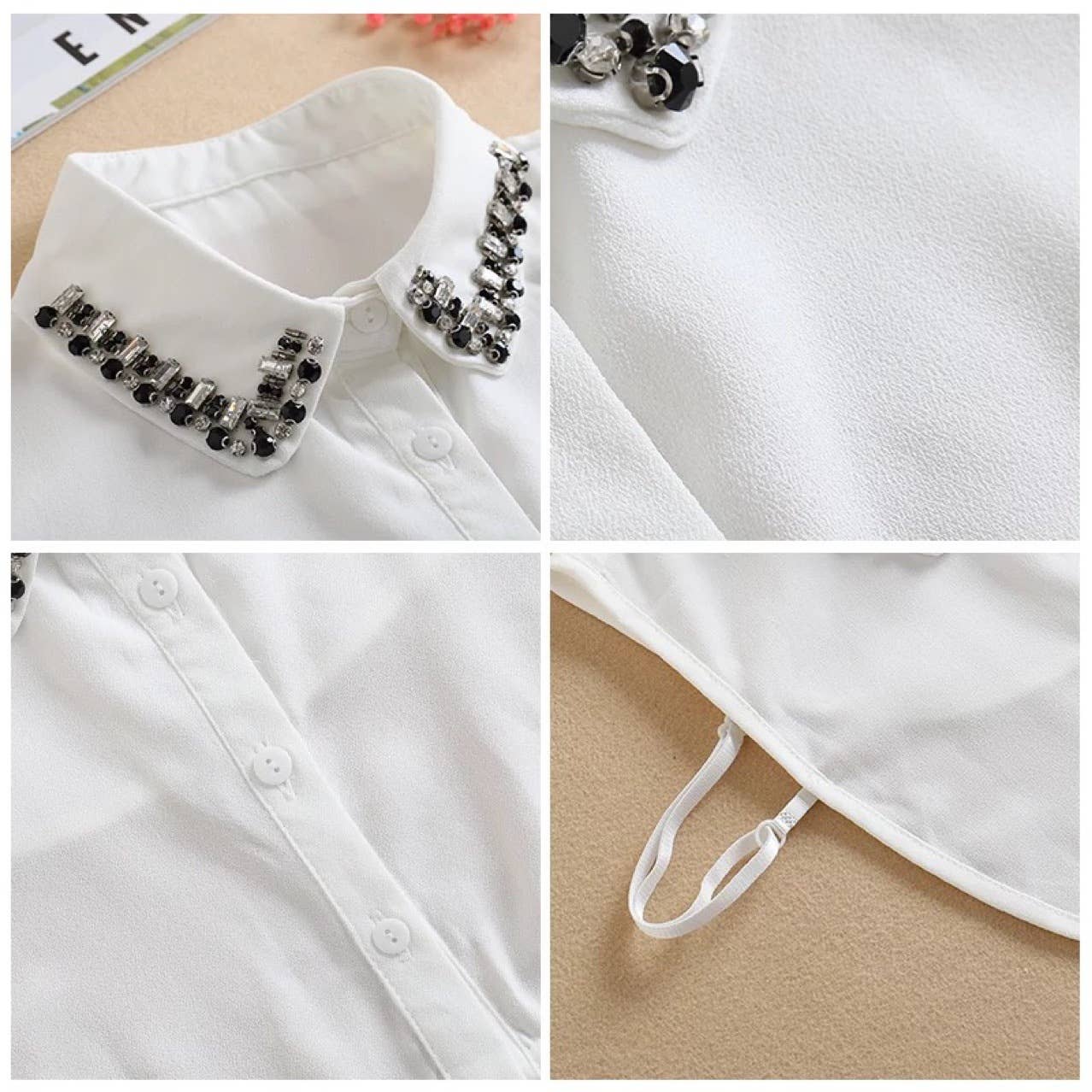 Elevate your wardrobe instantly with this sophisticated detachable shirt collar. Featuring a classic white base and sparkling rhinestone embellishments, this collar adds a touch of glamour to any outfit. Perfect for layering under sweaters, dresses, or tops, it creates the illusion of a crisp collared shirt without the bulk. The adjustable straps ensure a comfortable and secure fit. Collar, cotton collar, fake collar, detachable shirt collar.