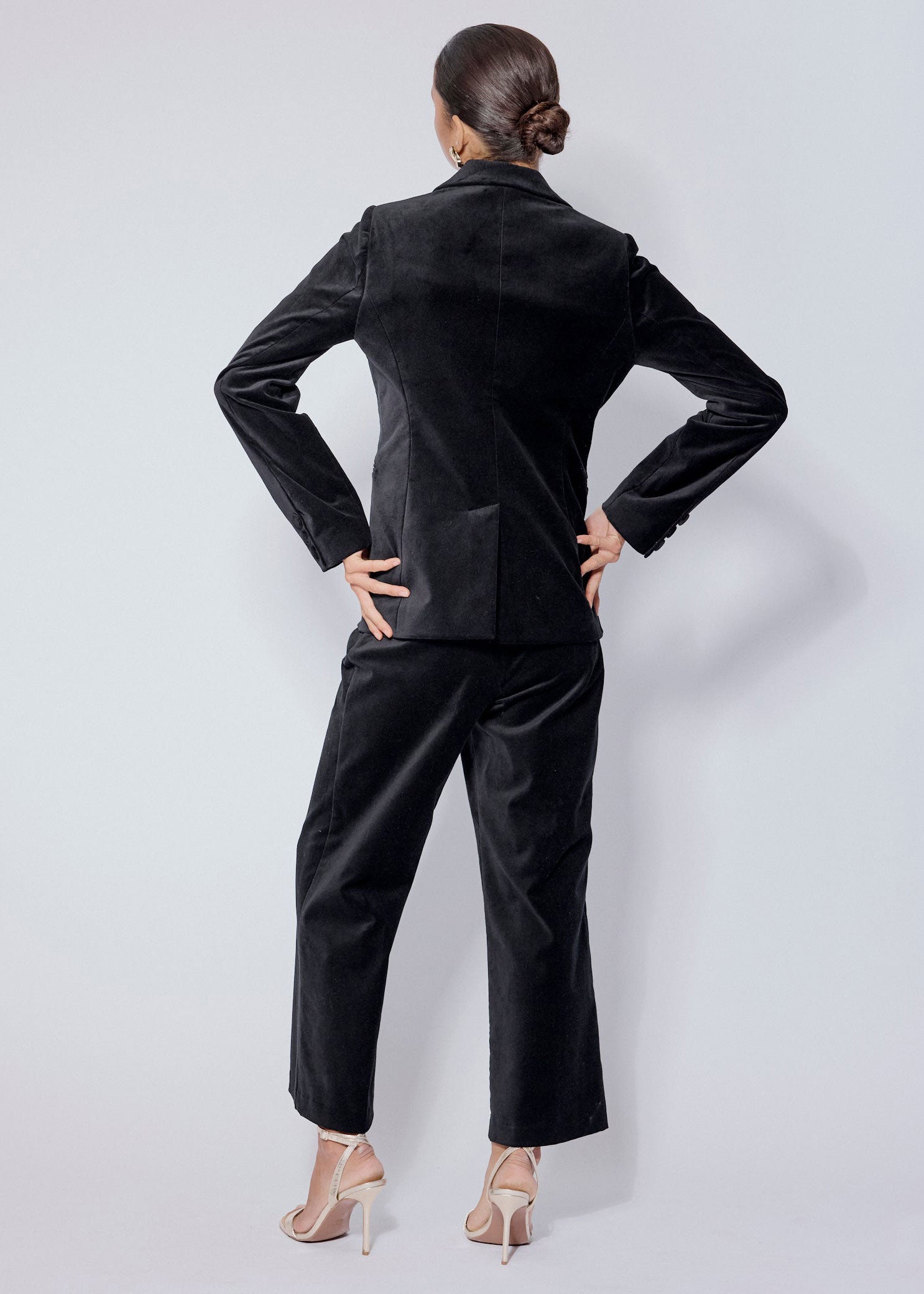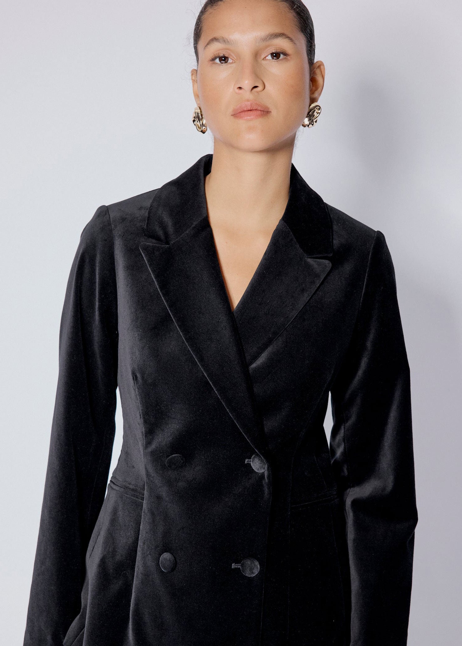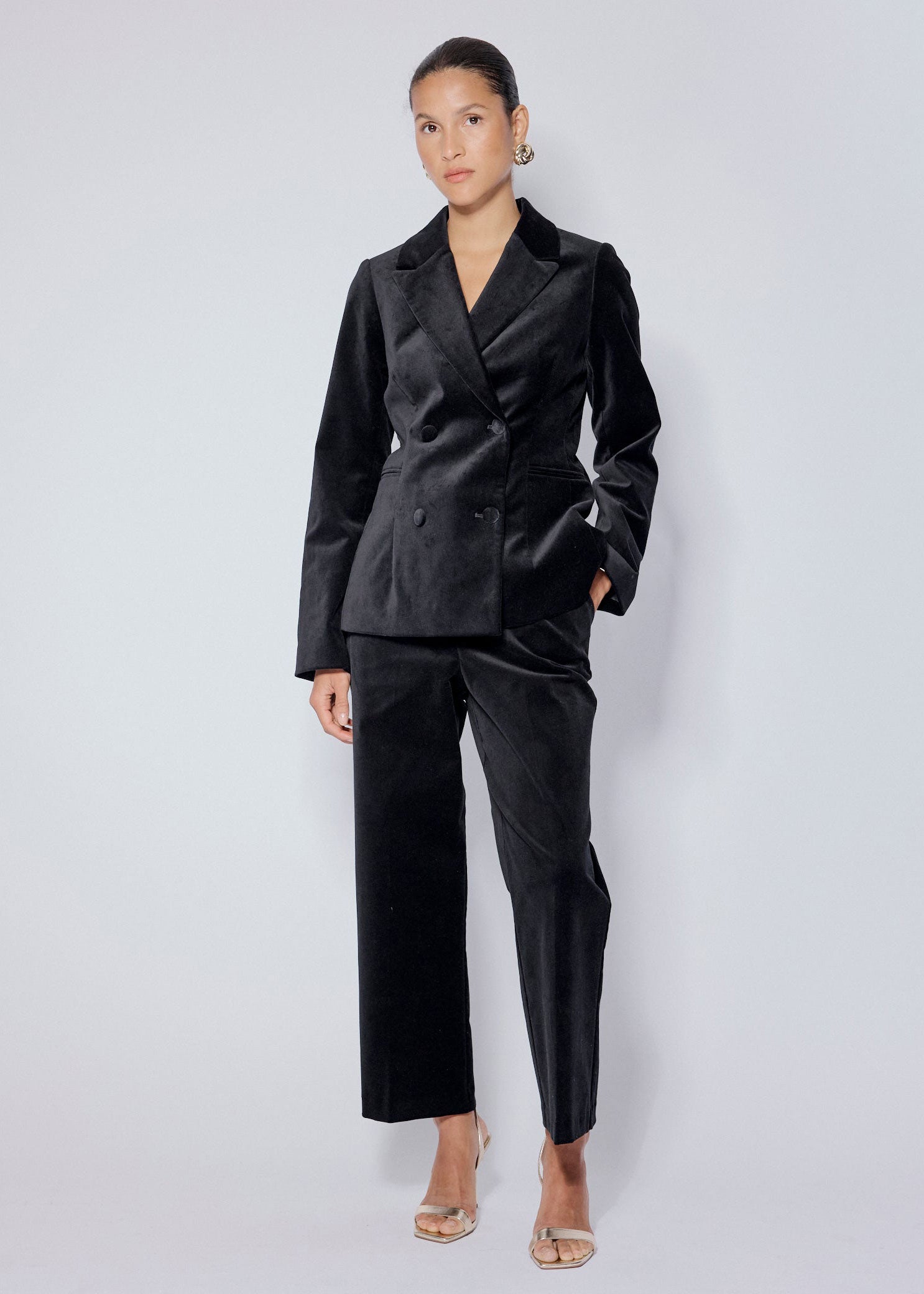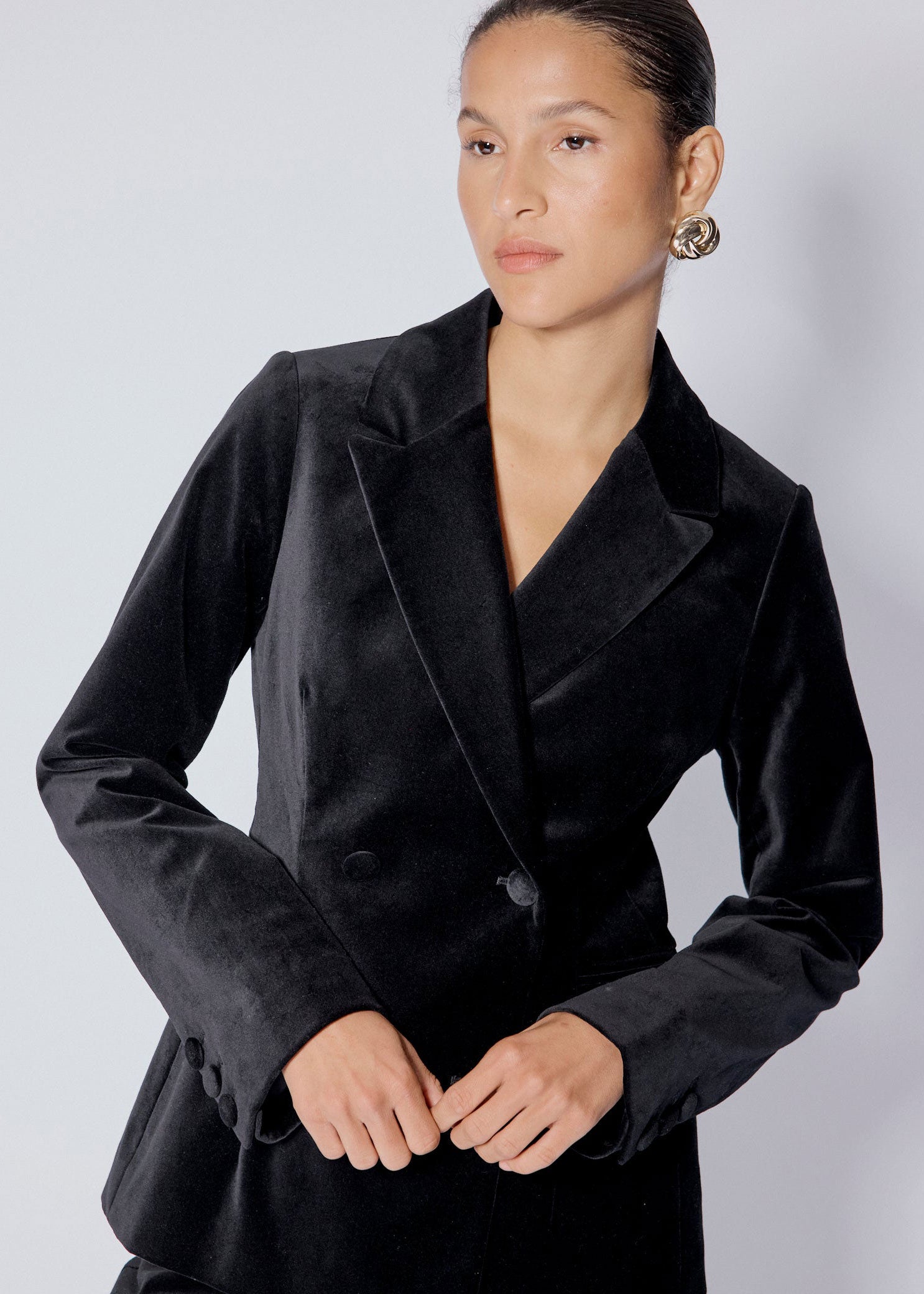 Post-work drinks incoming. Coming in soft black velvet, this fitted blazer features a collar and a double-breasted button front. It nips in at the waist for a flattering, feminine take on tailoring.