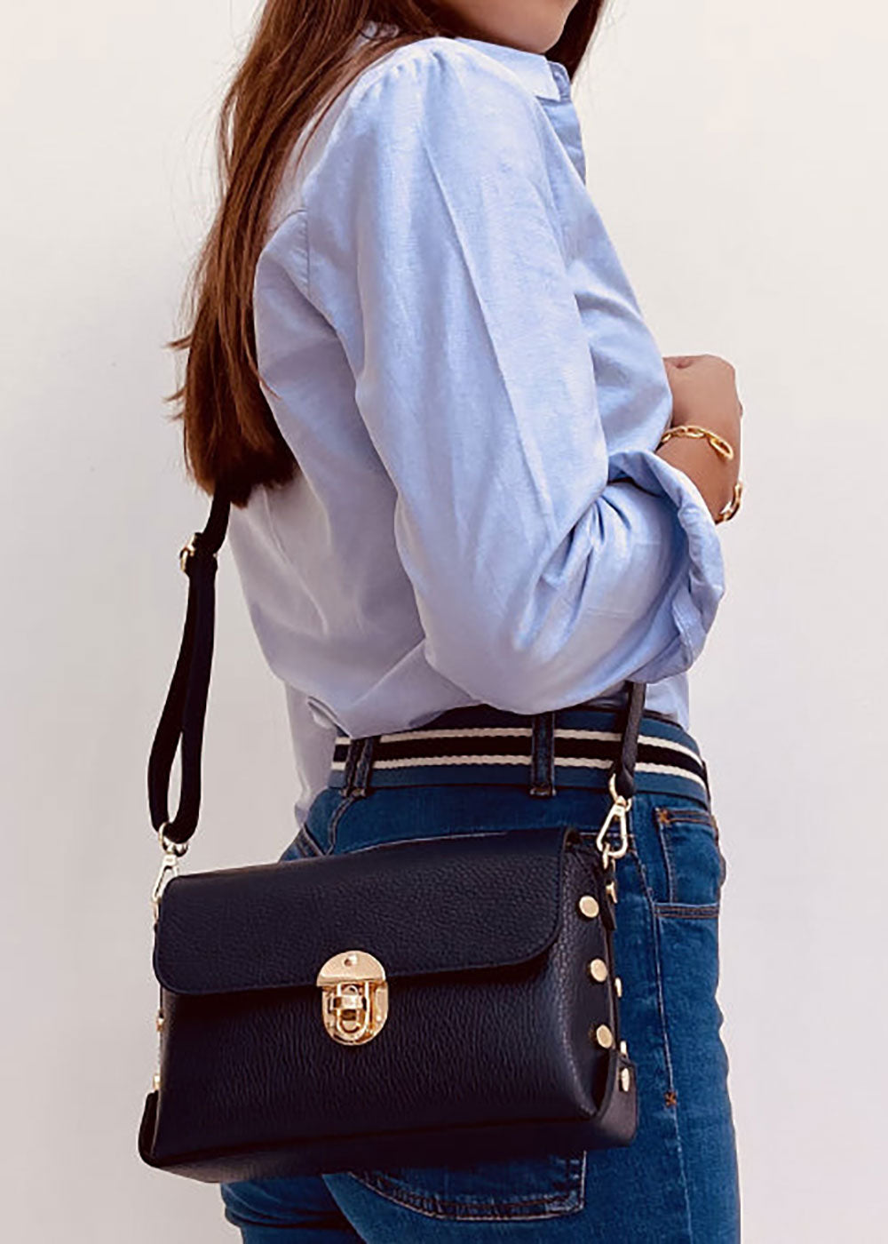 Embellished with stylish stud detailing on the sides of the handbag. Designed with a practical zipped interior pocket.