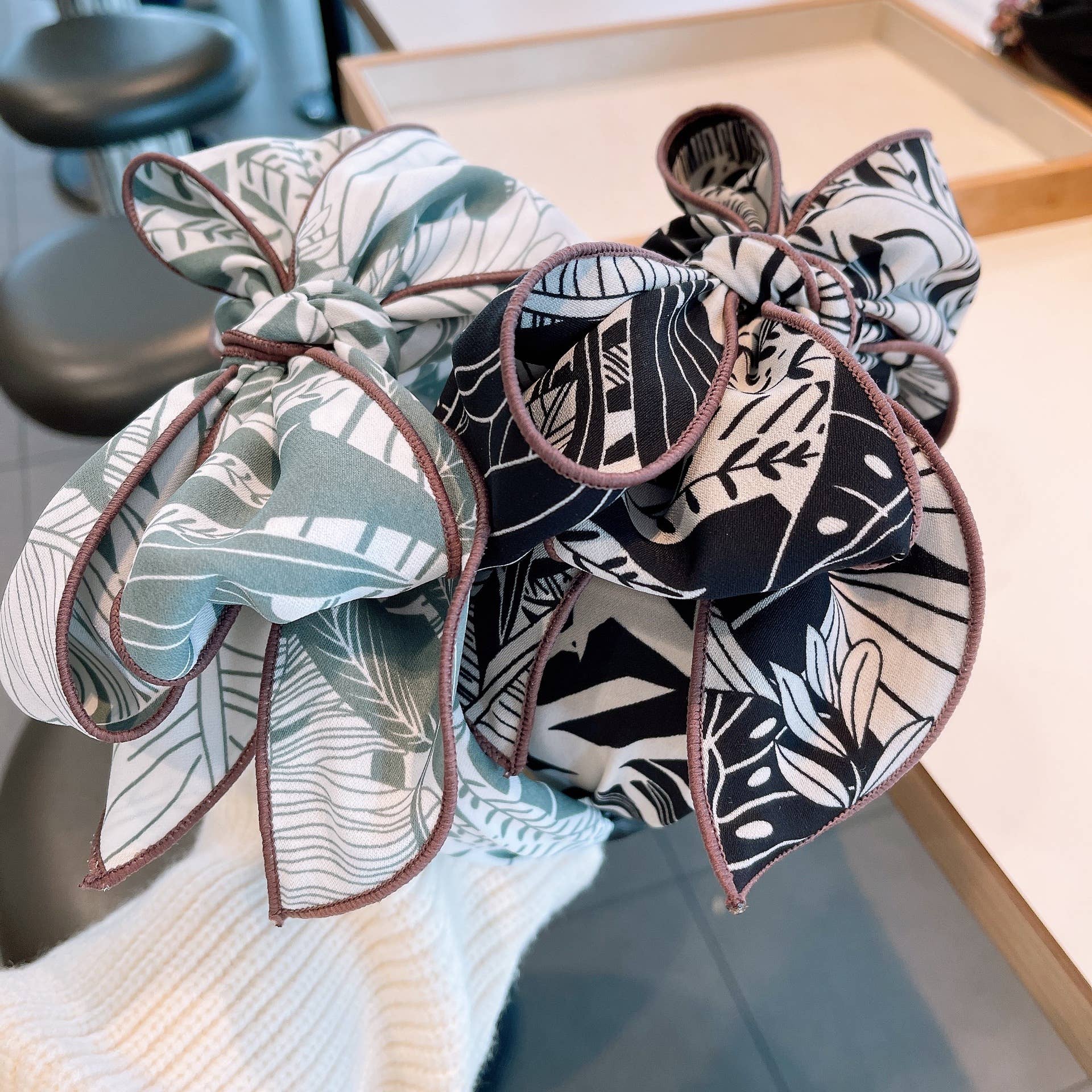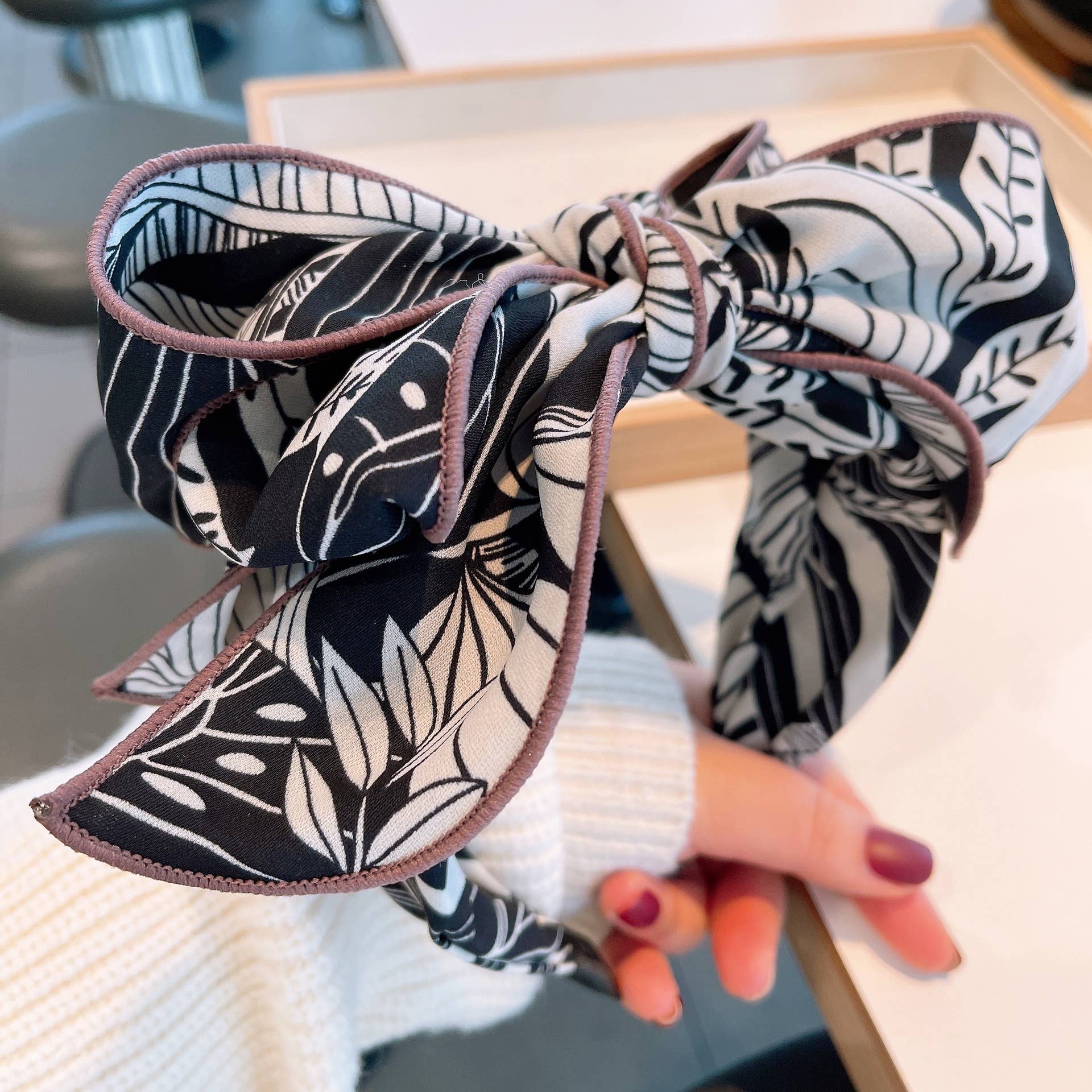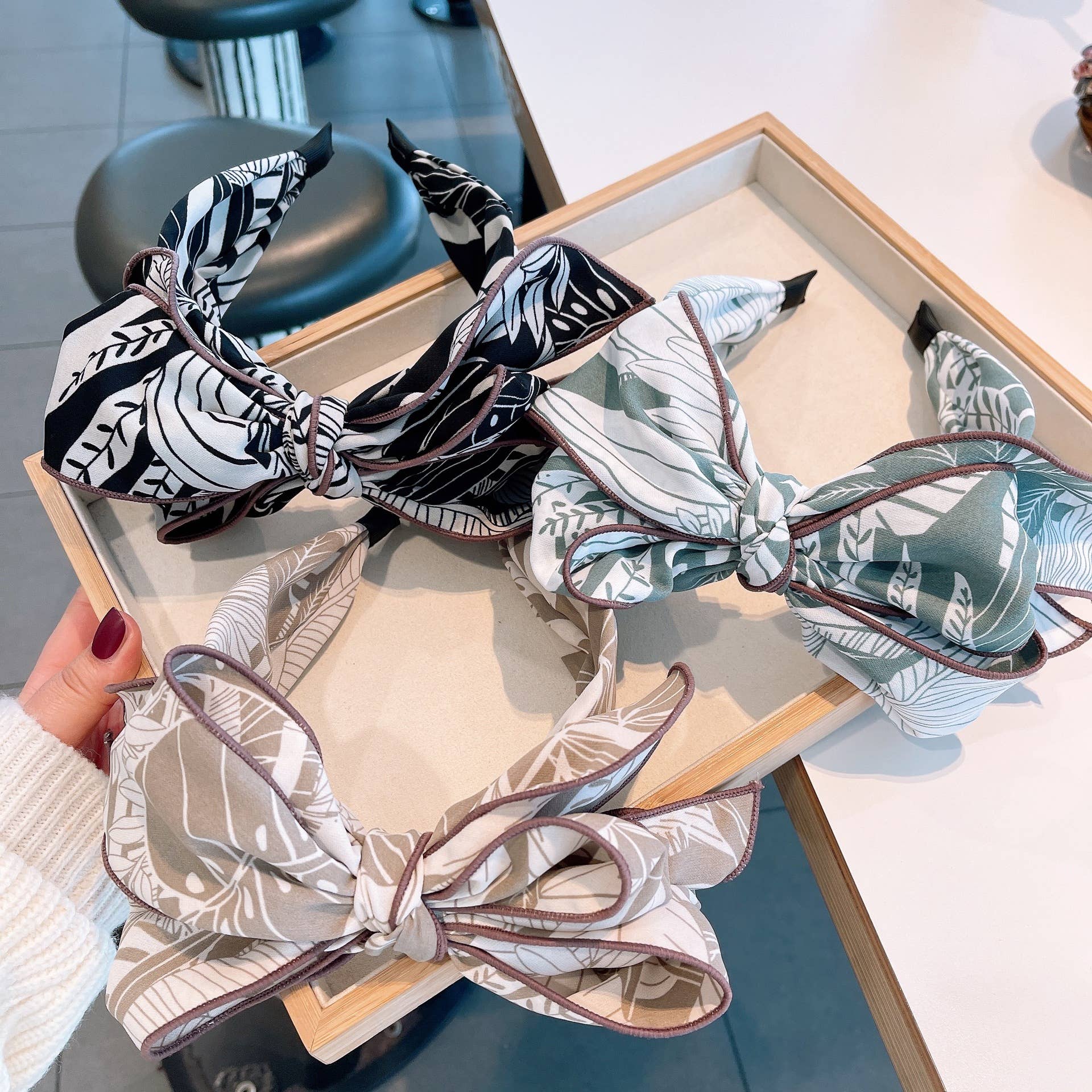 Adorn your hair with this chic headband featuring a beautiful leaf print and a stylish bow. Perfect for adding a touch of nature-inspired elegance to any outfit. The comfortable fit makes it ideal for all-day wear. Head bands, headwear, bow style headbands