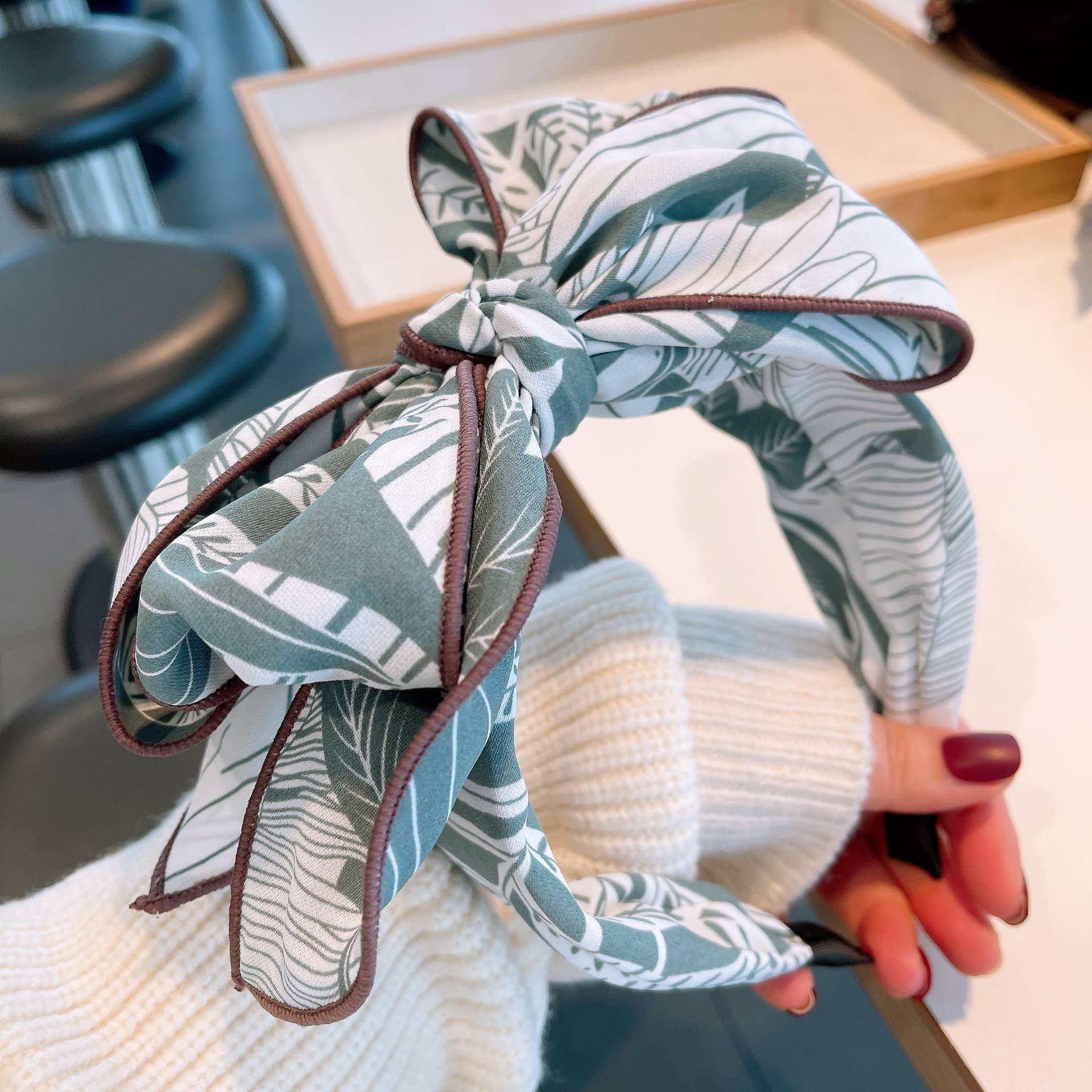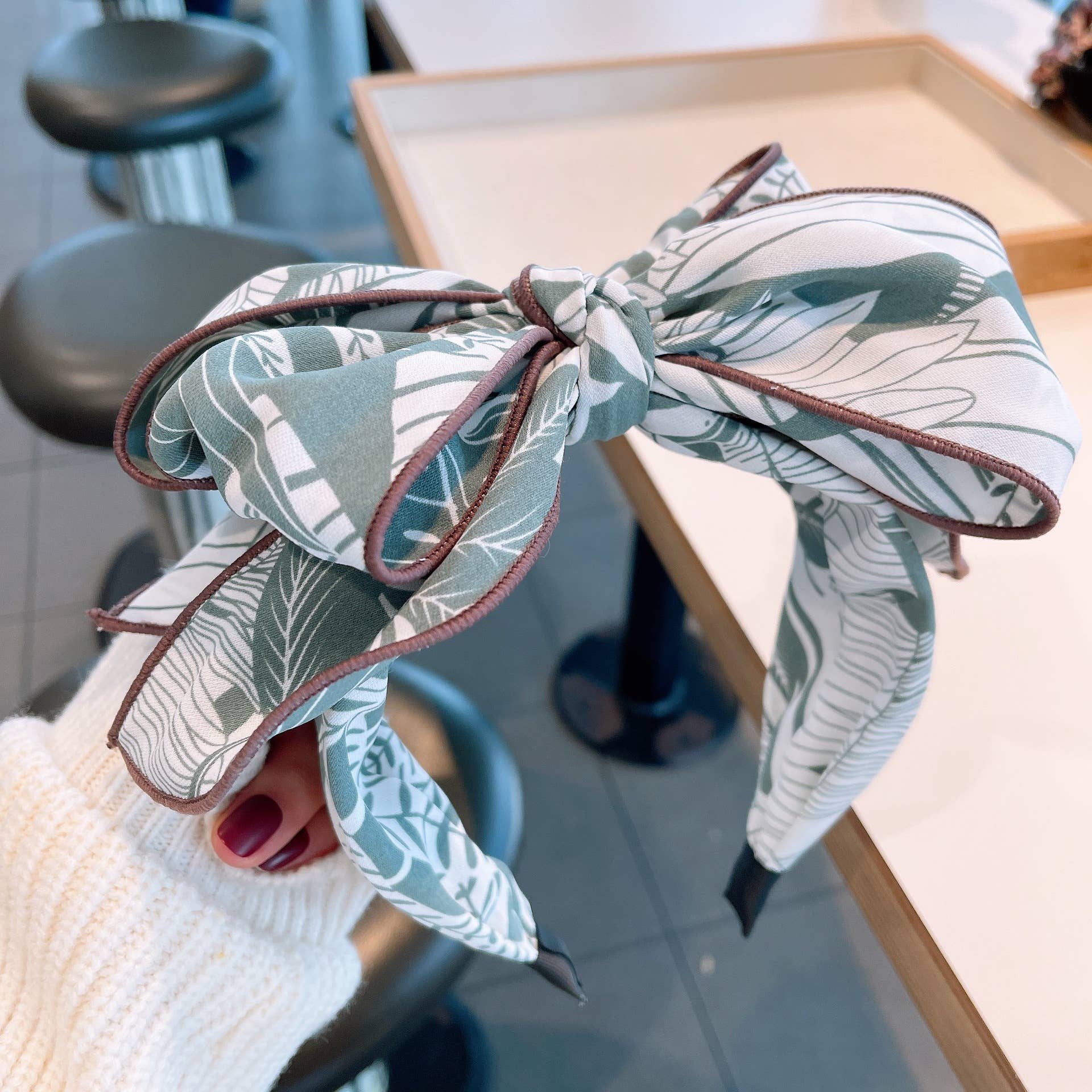 Adorn your hair with this chic headband featuring a beautiful leaf print and a stylish bow. Perfect for adding a touch of nature-inspired elegance to any outfit. The comfortable fit makes it ideal for all-day wear. Head bands, headwear, bow style headbands