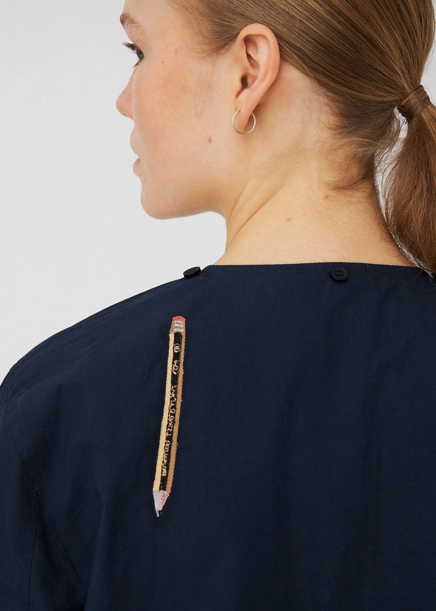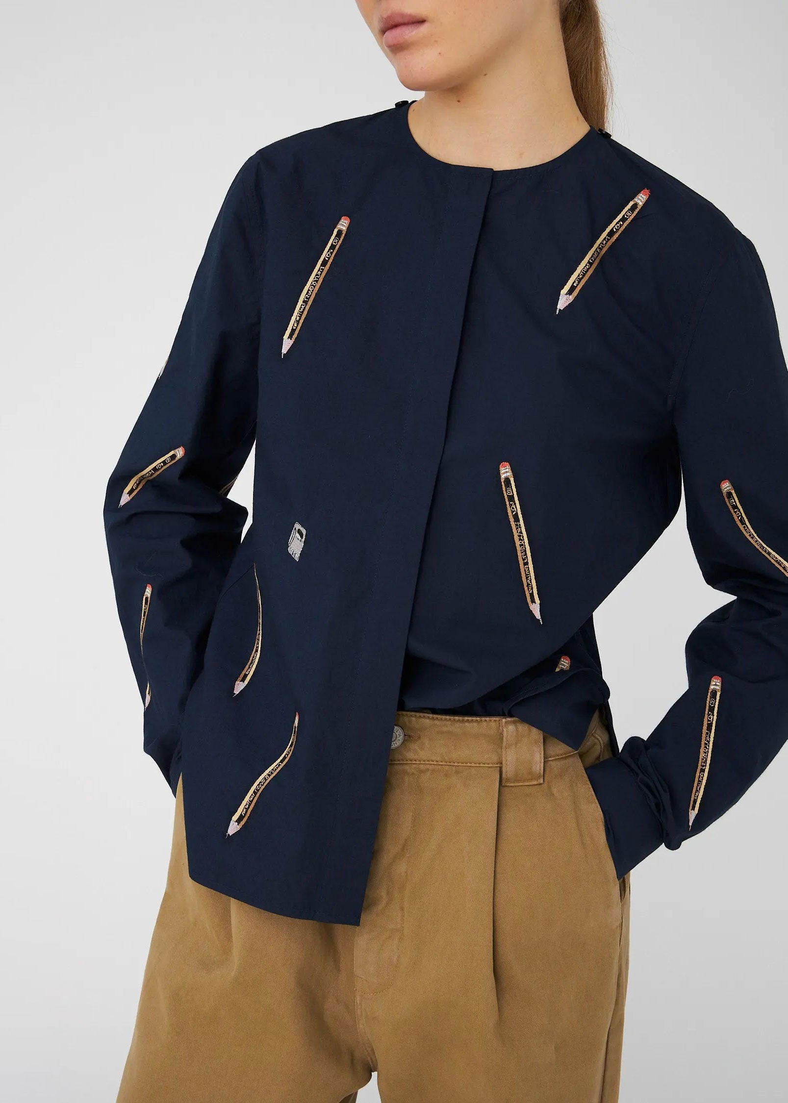 Light cotton shirt with a neck tie bow and embroidered pencils. The shirt features buttons down the center front and has long sleeves and cuffs with buttons.