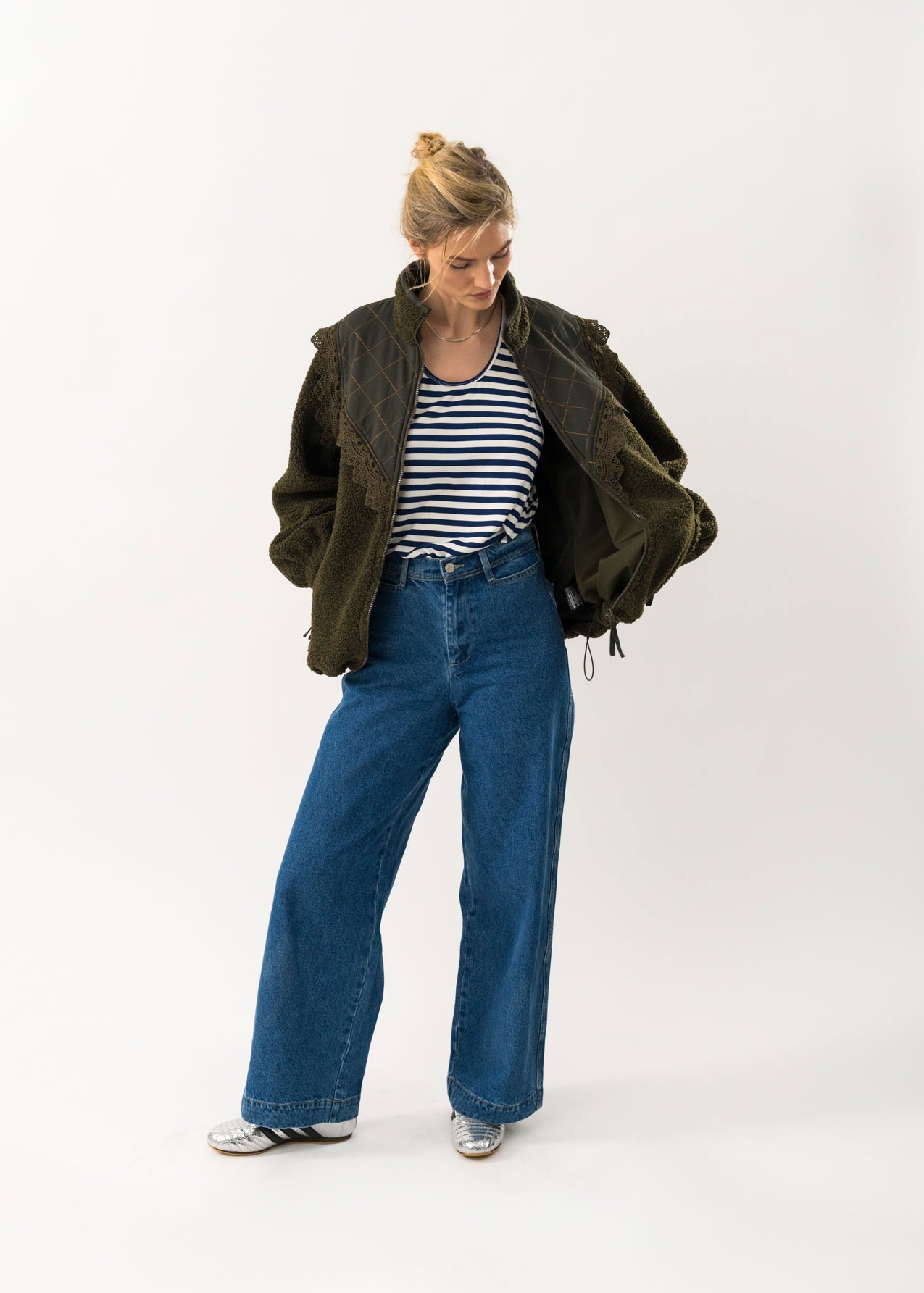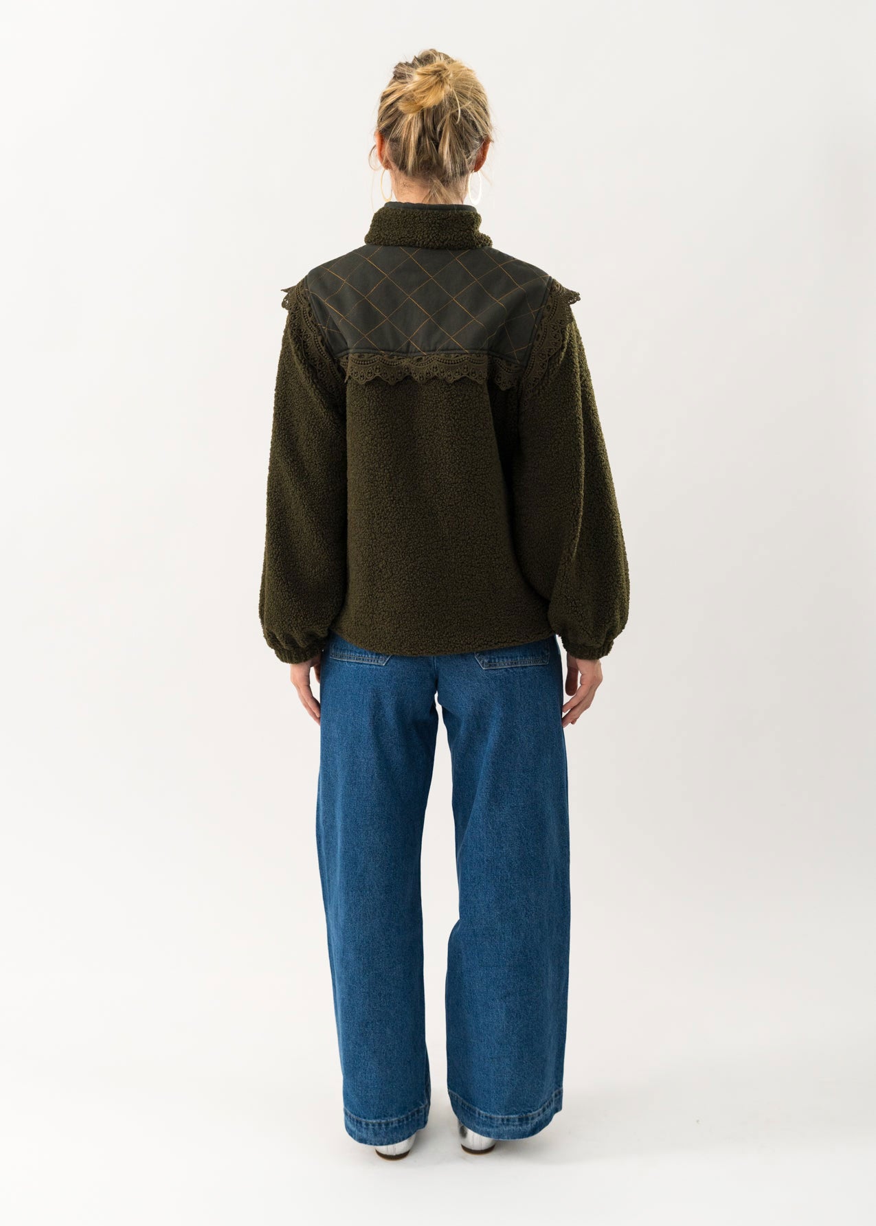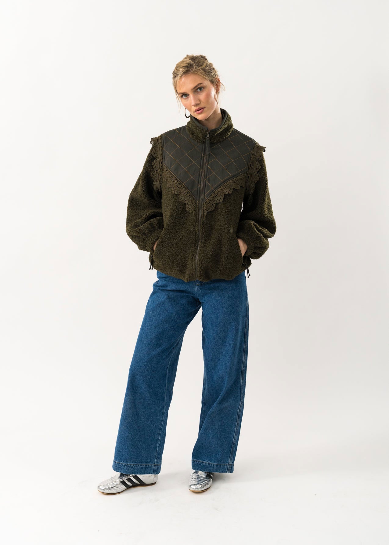 The FallLL jacket is a statement piece that combines soft teddy fabric with delicate lace details and quilted panels.
