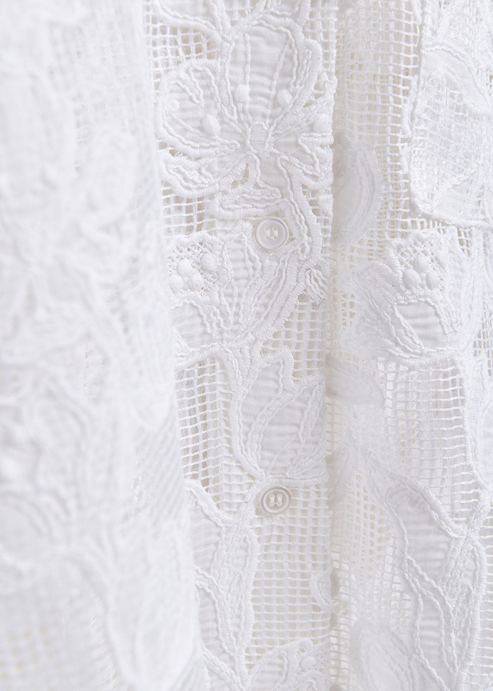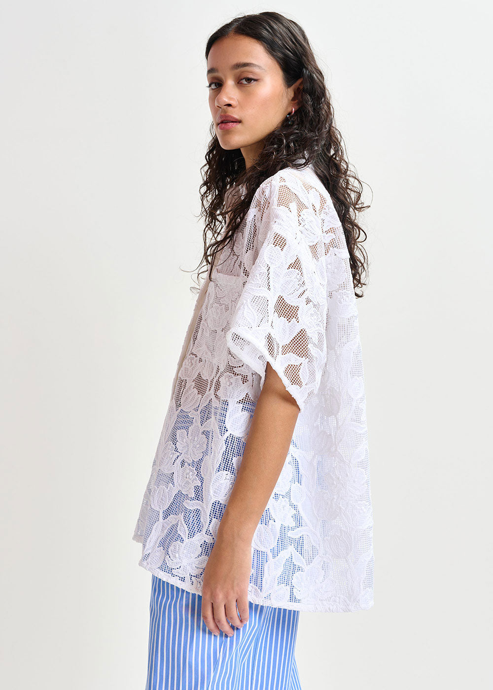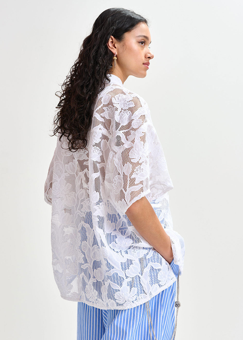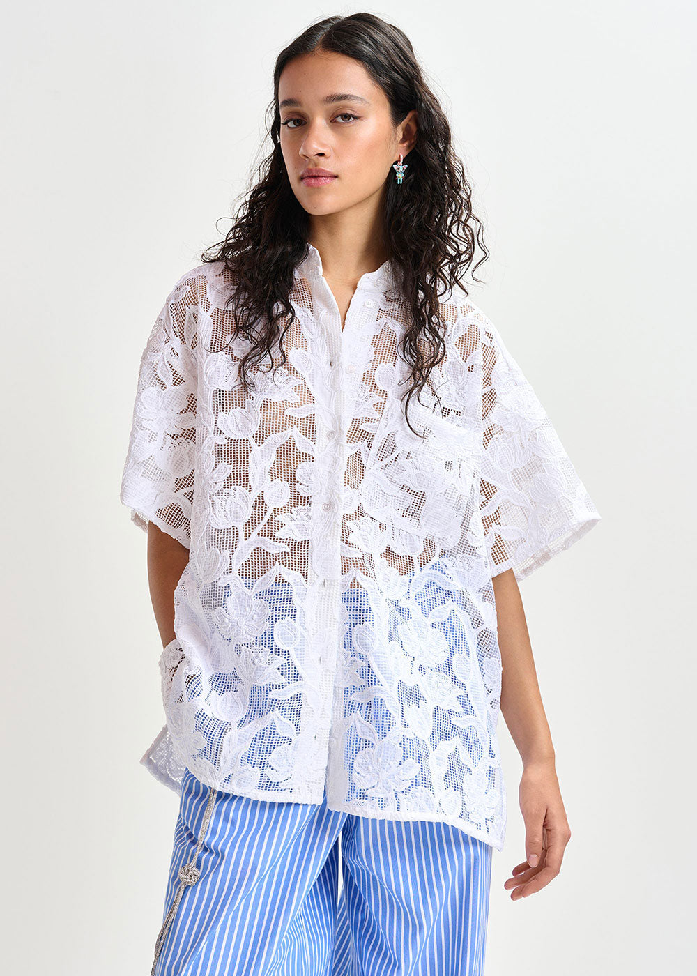 Shirt is designed for an effortlessly oversized fit, offering a perfect balance of sophistication and comfort. The silhouette is enhanced by a mandarin collar and a button-front closure. Delicate lace-embellished embroideries add a touch of elegance, while thoughtful details such as a side seam slit and a chest pocket complete the design.