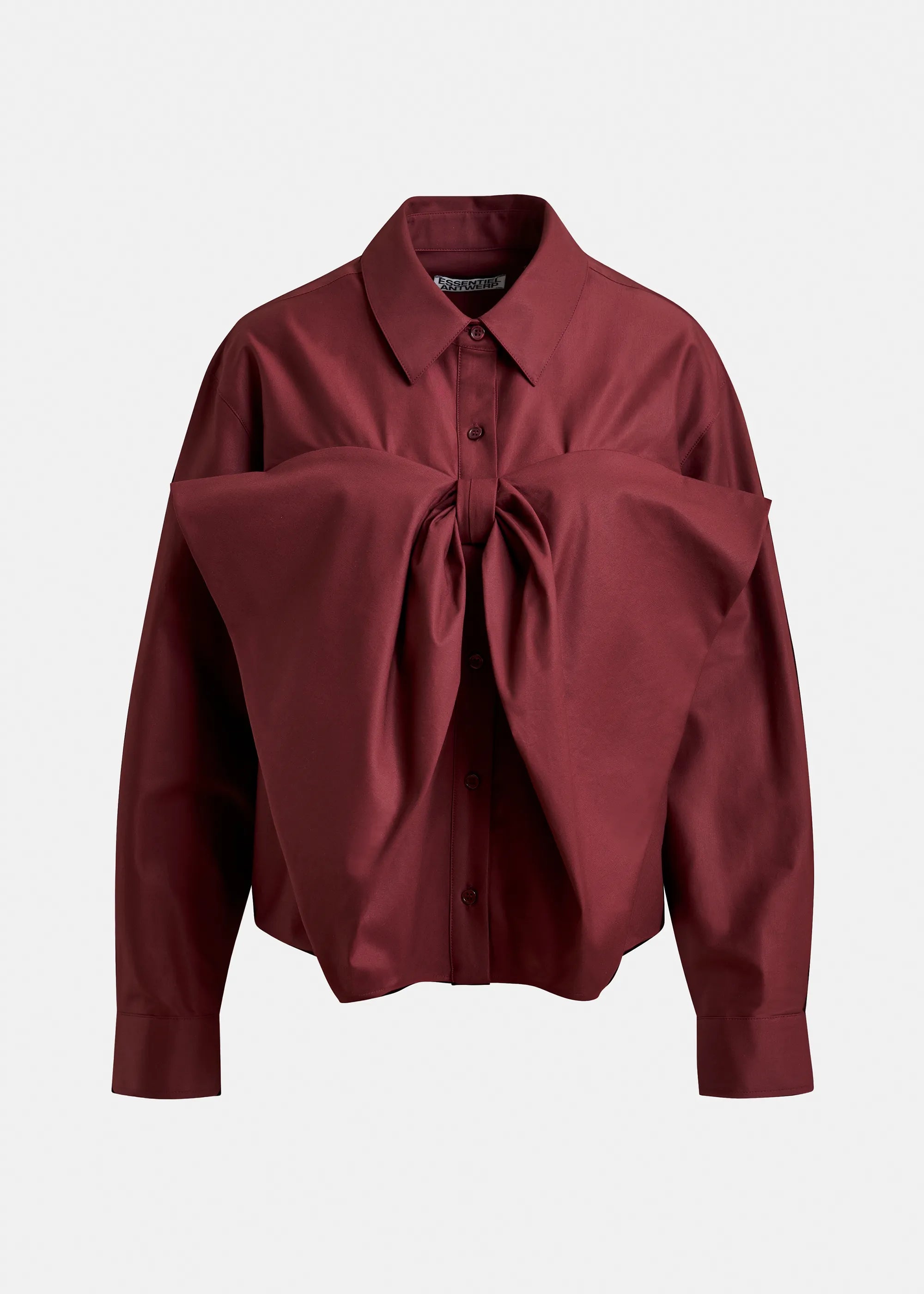 Cotton-blend shirt reimagines classic tailoring with a bold twist. It features a sharp collar and button fastening through the front. The defining detail is a dramatic self-fabric bow at the chest, adding playful elegance.