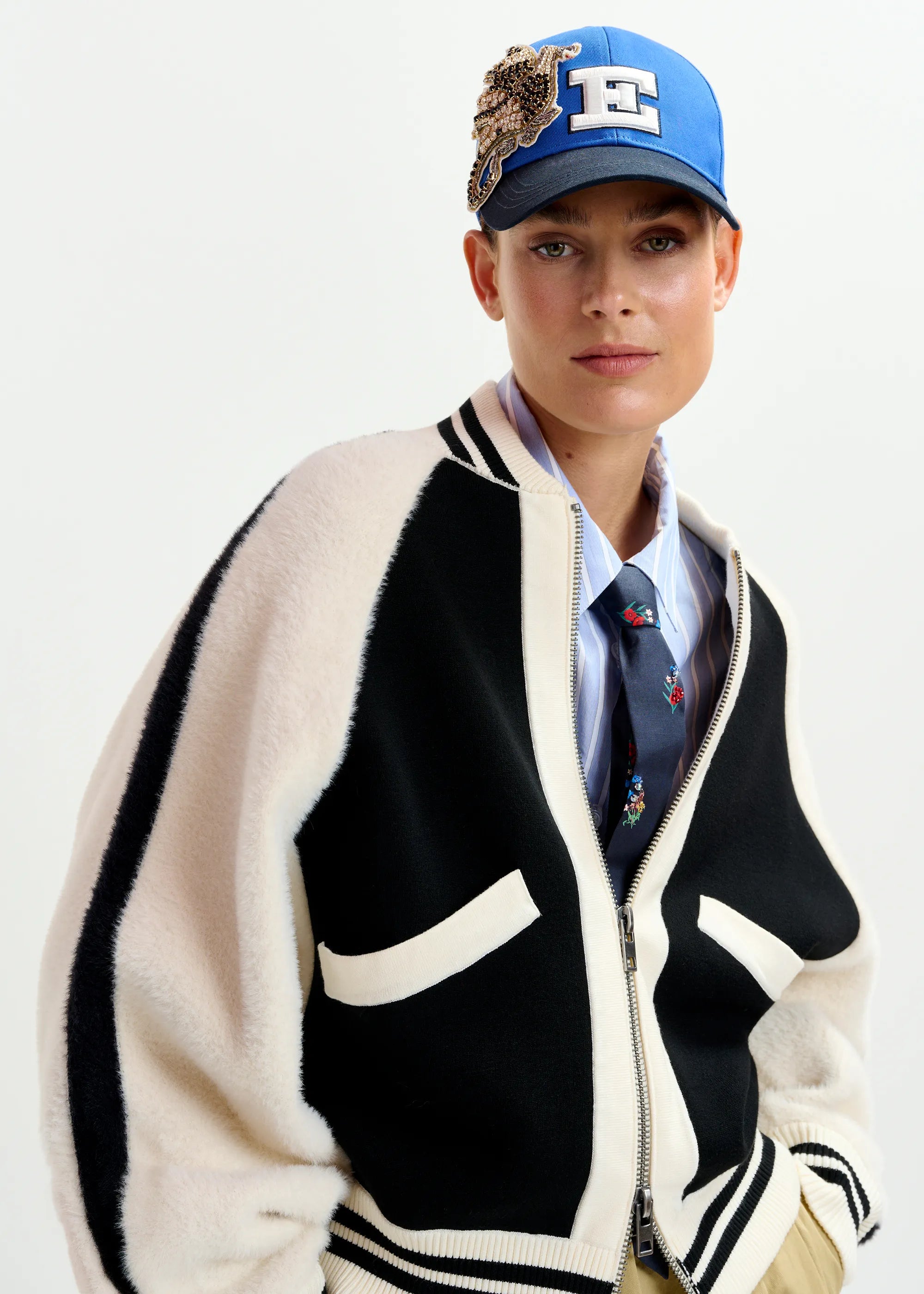 Bomber jacket is finely knitted for a soft handle and detailed with plush faux fur panels that run along the sleeves and body. Designed for a relaxed fit, it features raglan shoulders for ease of movement and a chunky zip fastening through the front. Striped ribbed trims are keeping the silhouette neat.