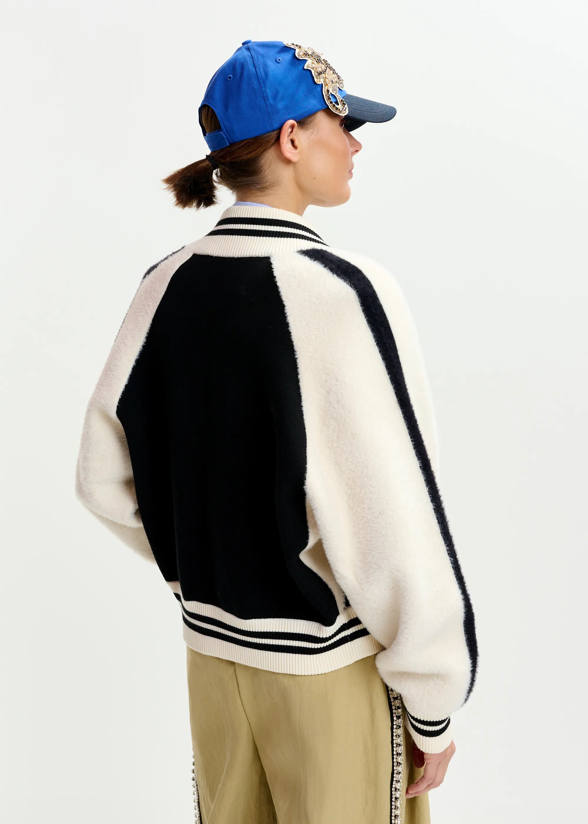 ESSENTIEL ANTWERP Idol Black and White Faux Fur-Panelled Knitted Bomber Jacket