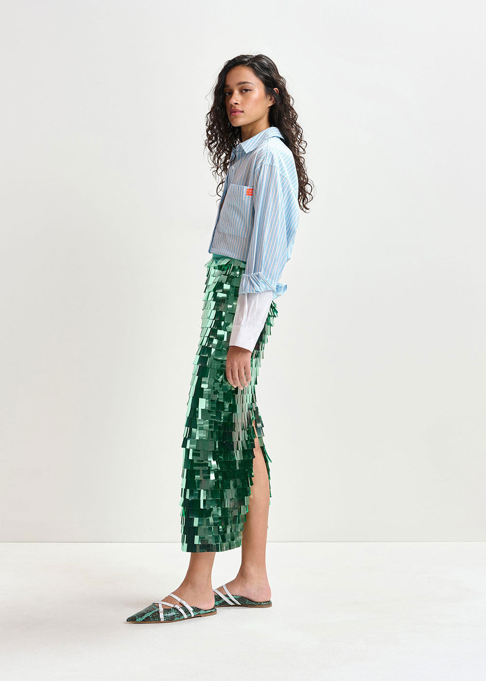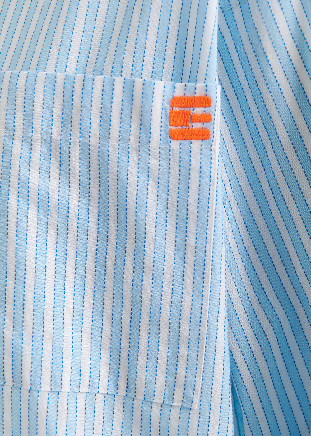 100% cotton oversized shirt features a classic collar, button fastening, and dropped shoulders. Designed with double cuffs, and a chest pocket with "E" embroidered detail; a versatile staple with playful touches.