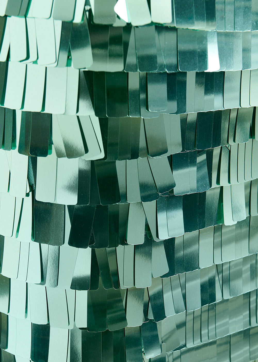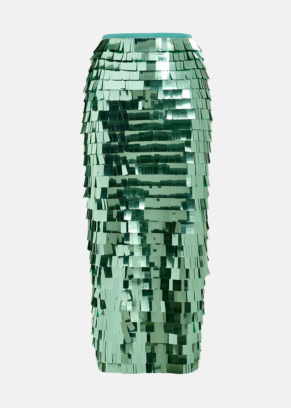 Designed for a sleek, pencil silhouette, this over-the-knee skirt is fully covered in bold square sequin embellishments that catch the light from every angle. It features a hidden zip fastening for a seamless finish. A slit detail at the back ensures ease of movement, while the lined interior offers comfort without compromising on shine.