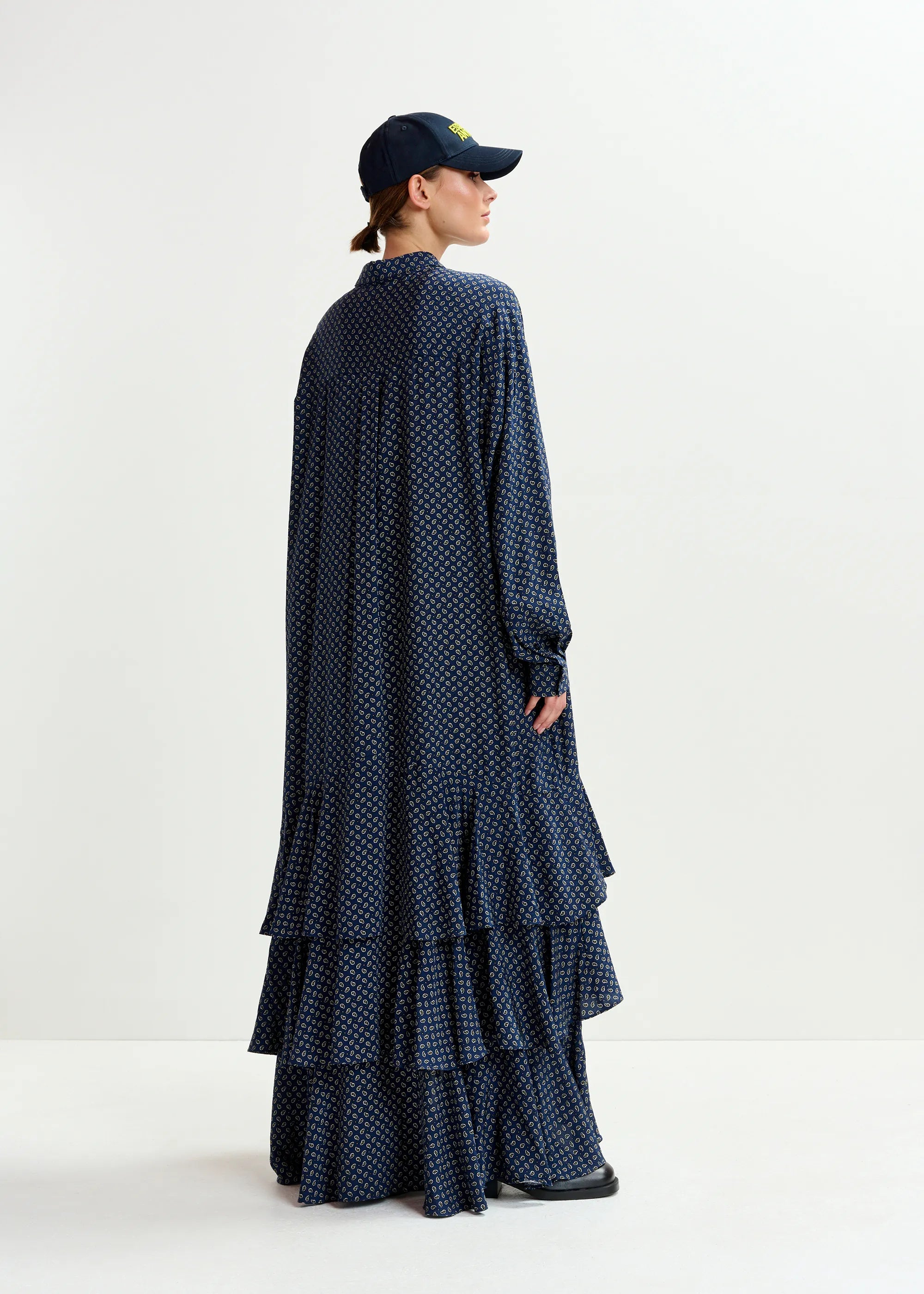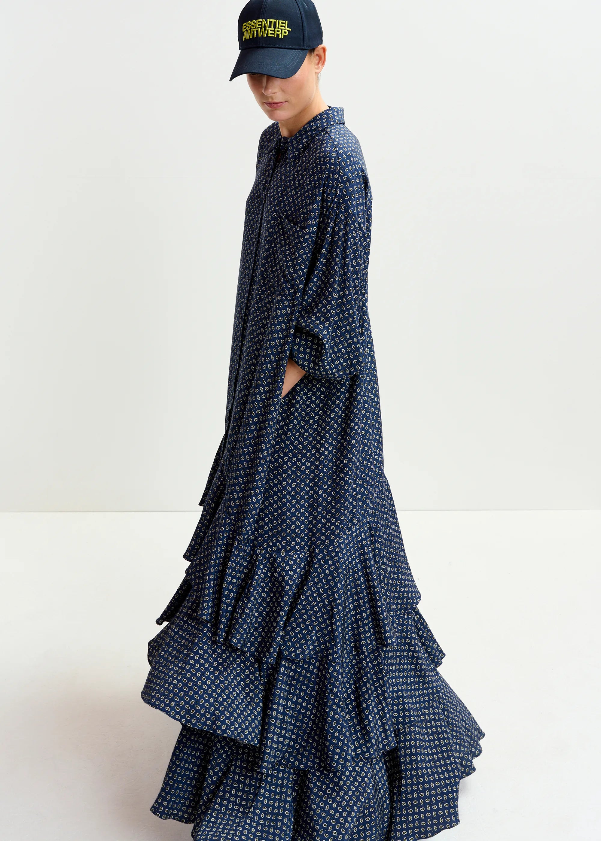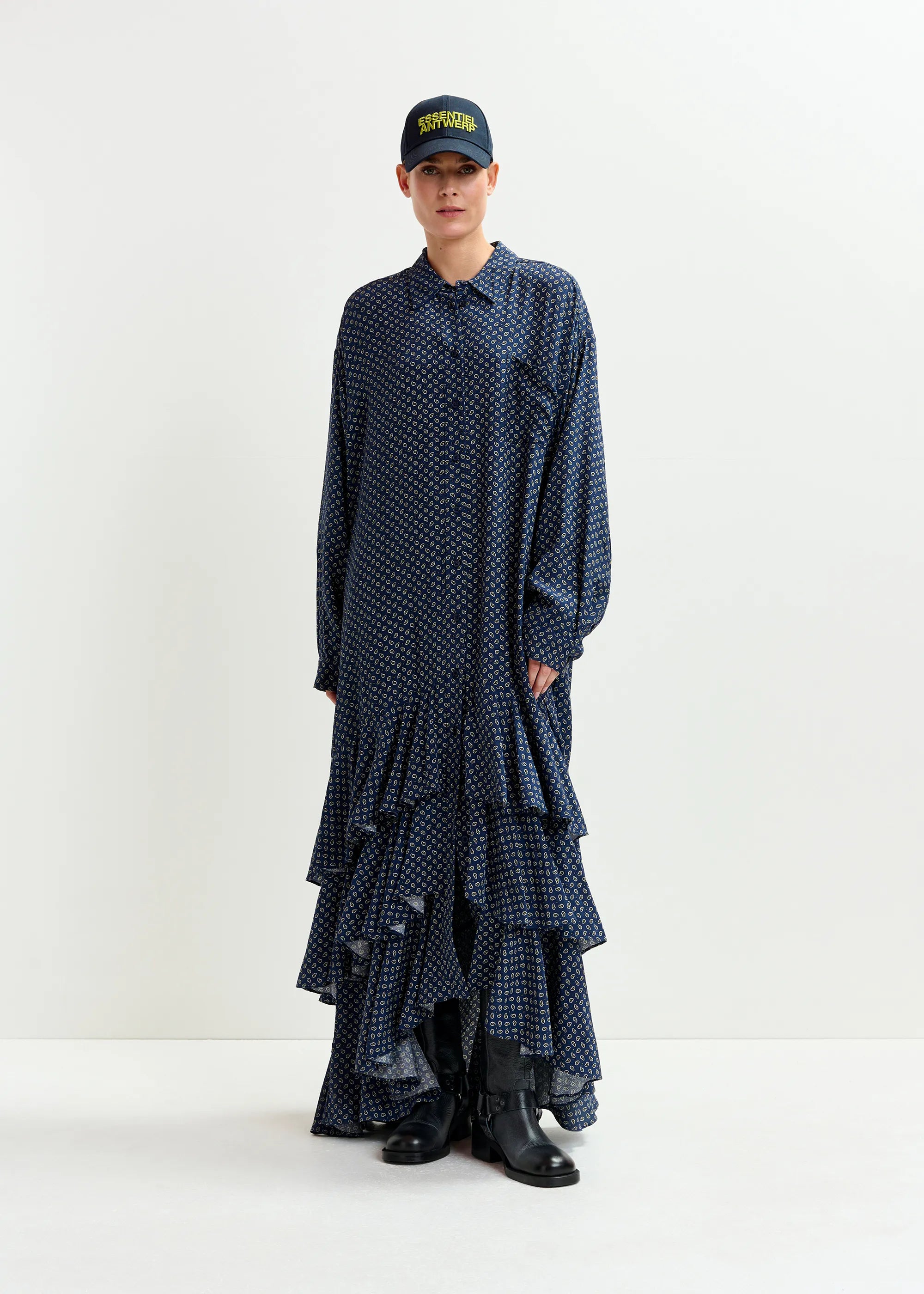 ESSENTIEL ANTWERP Navy, off-white and green oversized printed maxi shirt dress with ruffled hemline