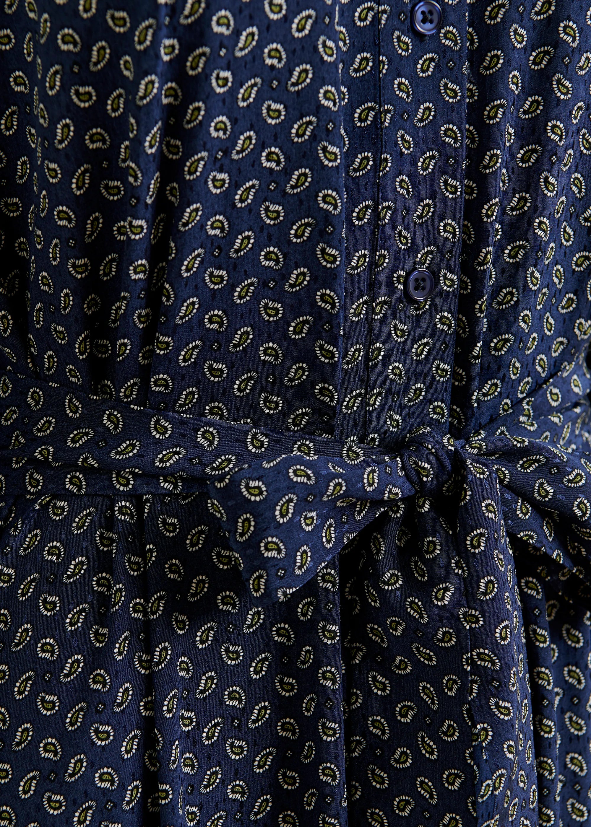 Printed maxi dress blends the ease of a shirt dress with feminine ruffle detailing. Designed for an oversized fit, it features dropped shoulders, a chest pocket, and functional slit pockets for a utilitarian touch. The button fastening and classic collar nod to traditional shirting, while the asymmetrical hemline and tiered ruffle layers at the bottom add soft movement and dimension. A self-fabric belt allows you to cinch the waist or wear it loose for a relaxed look.
