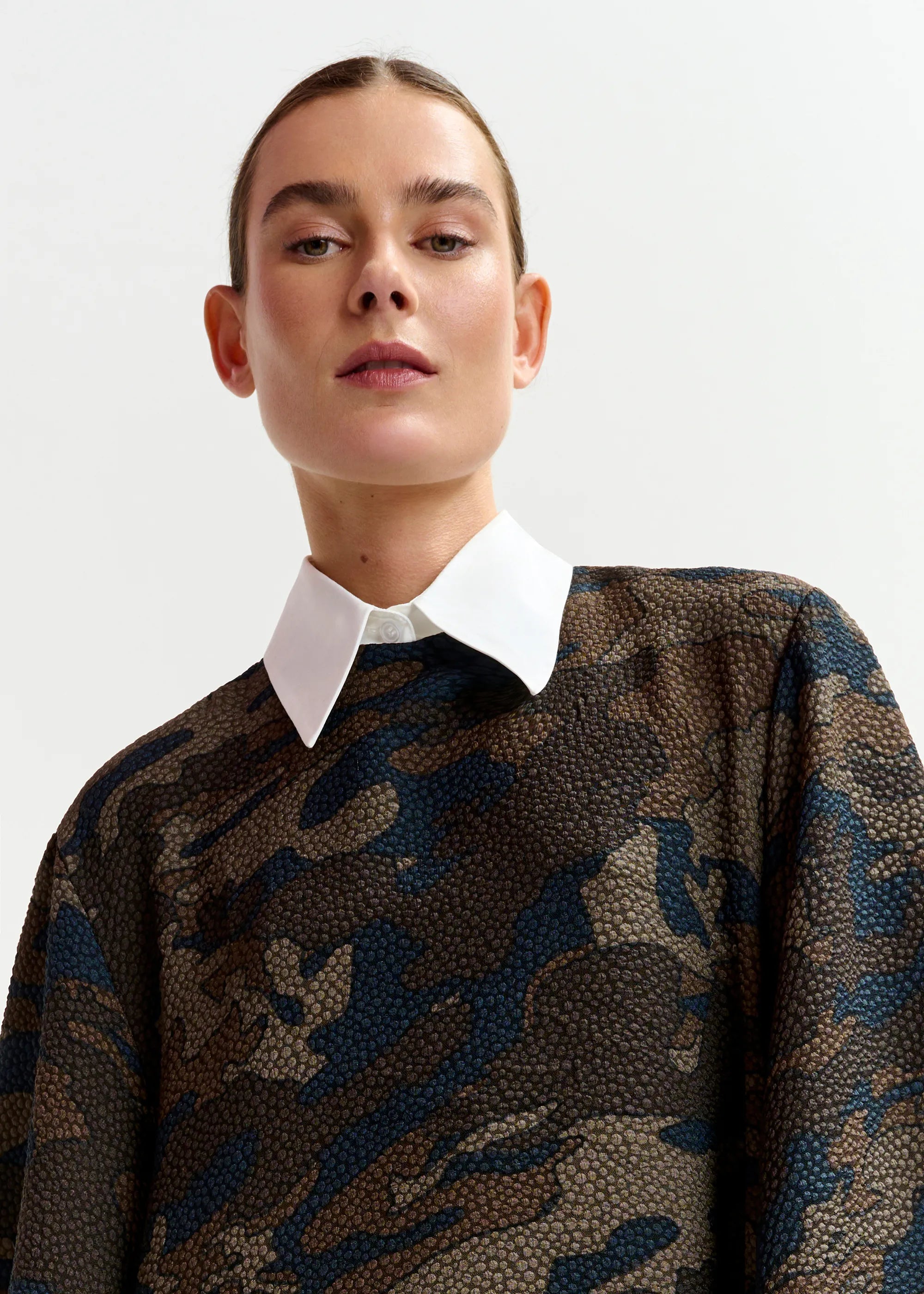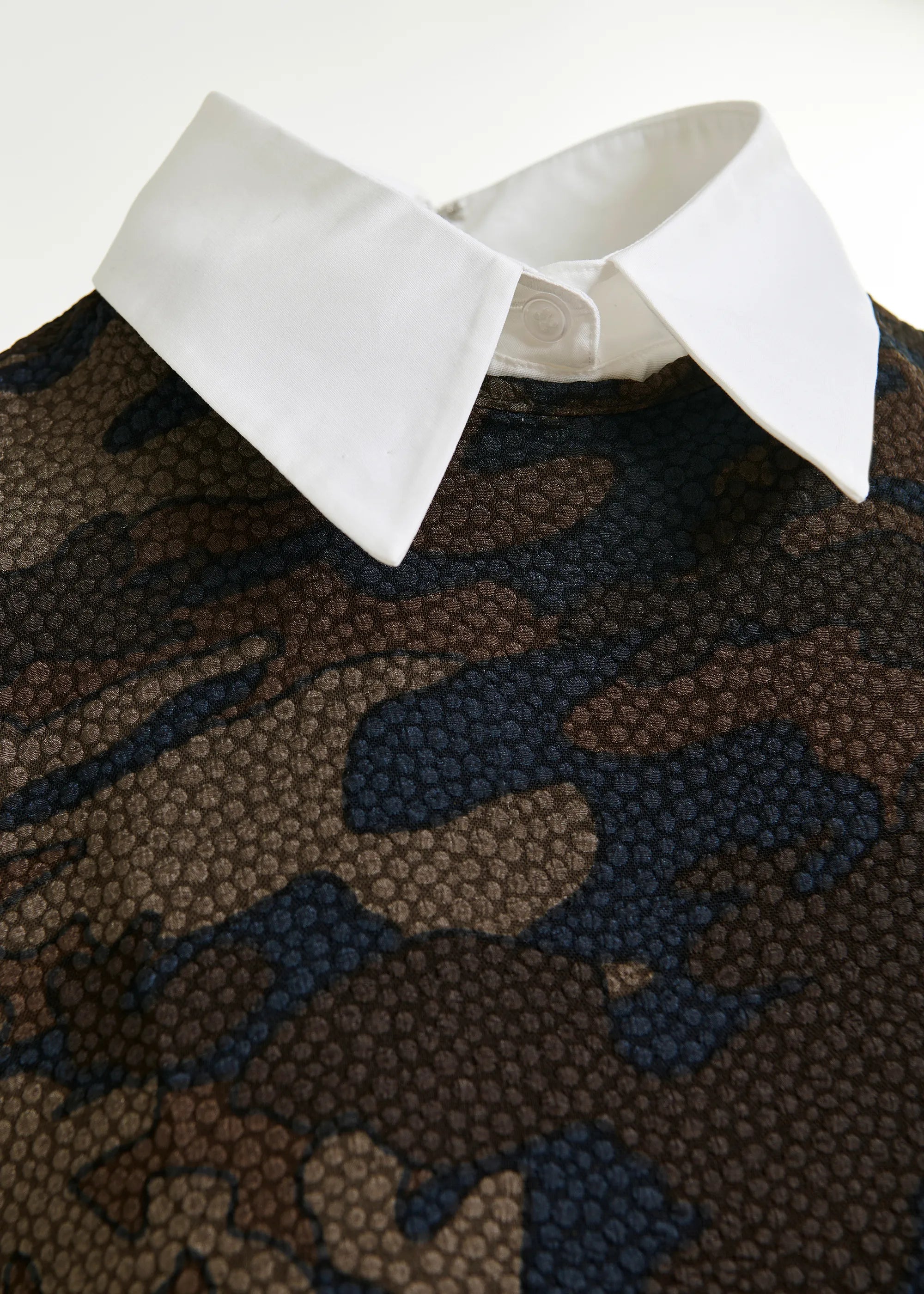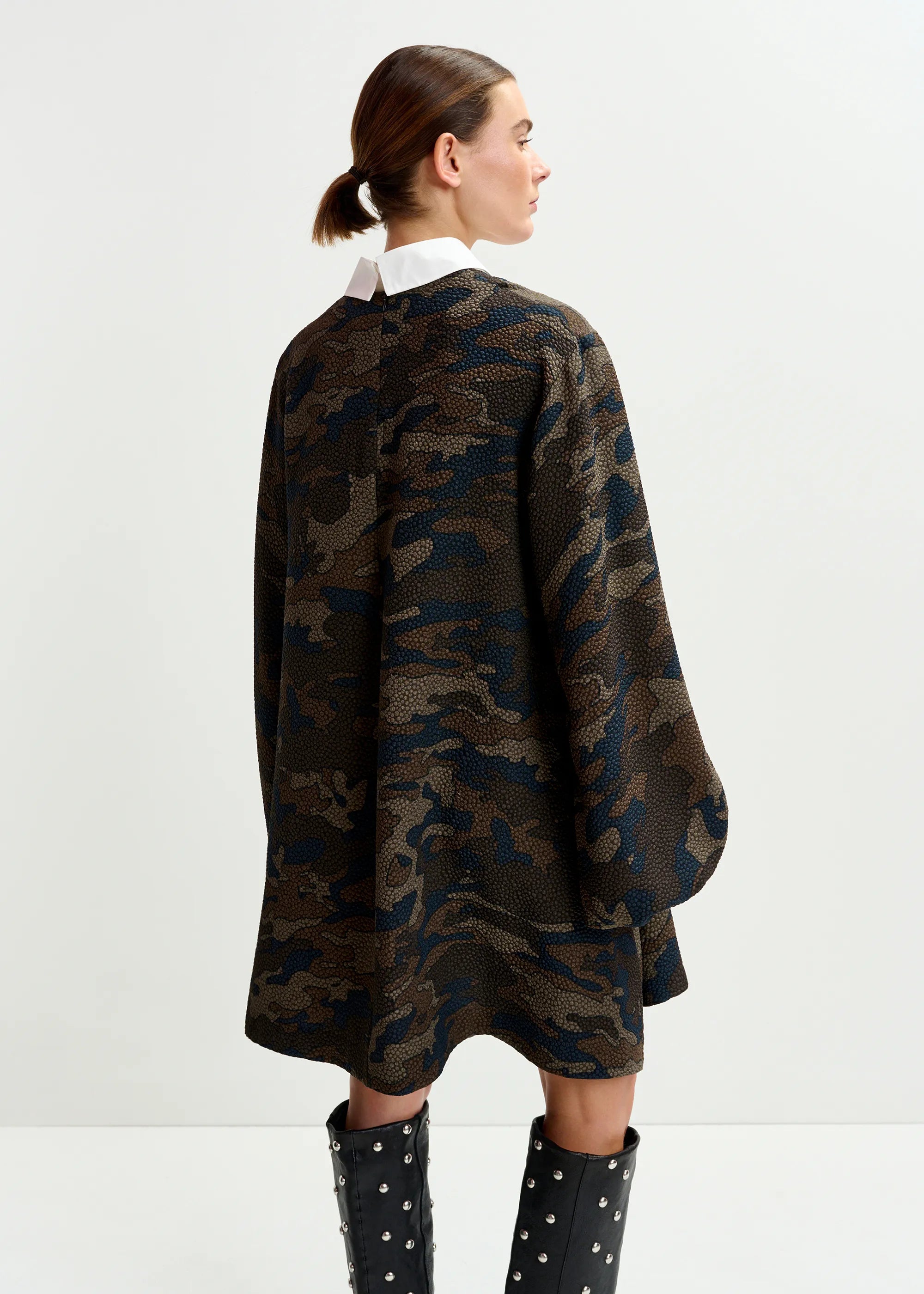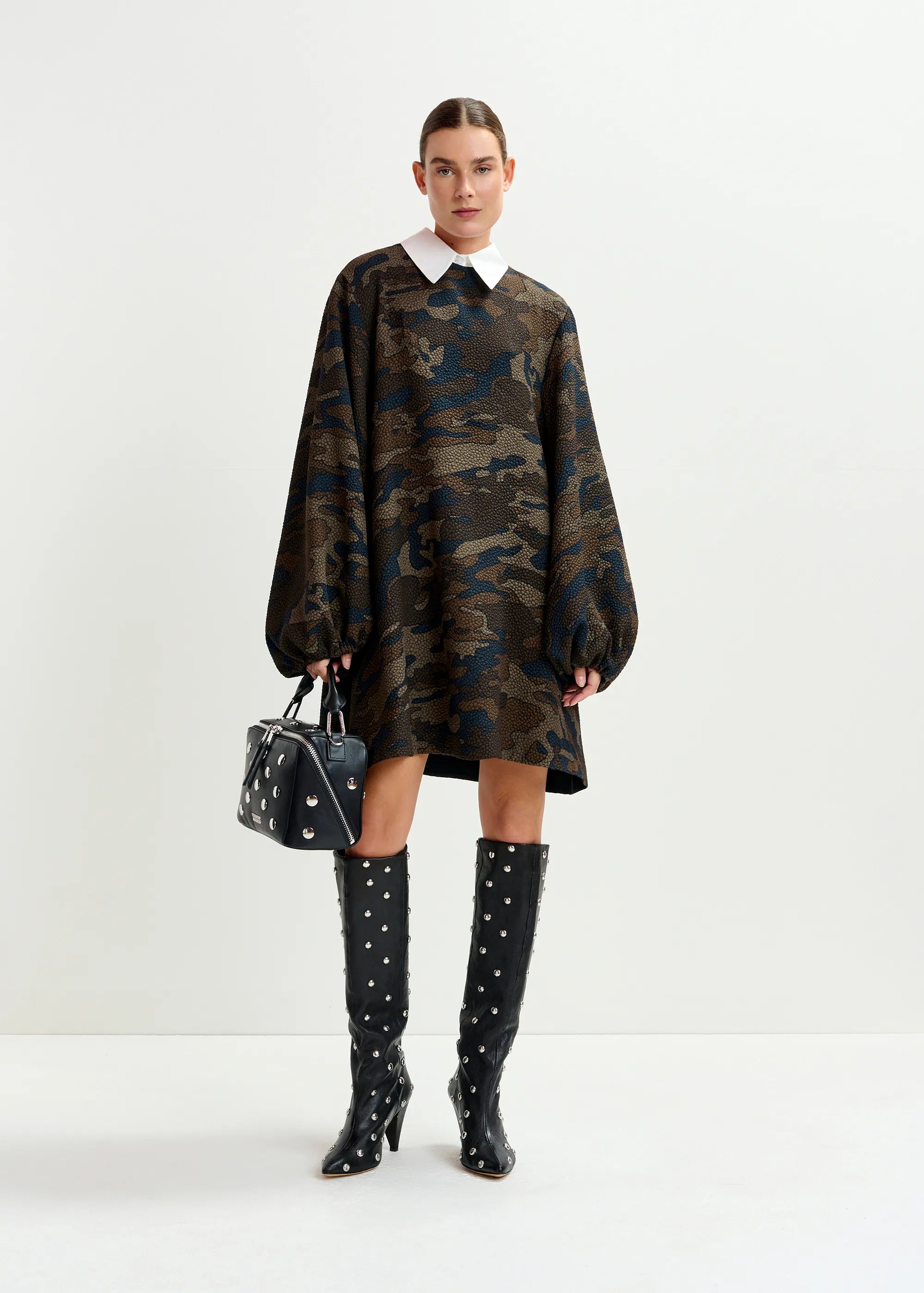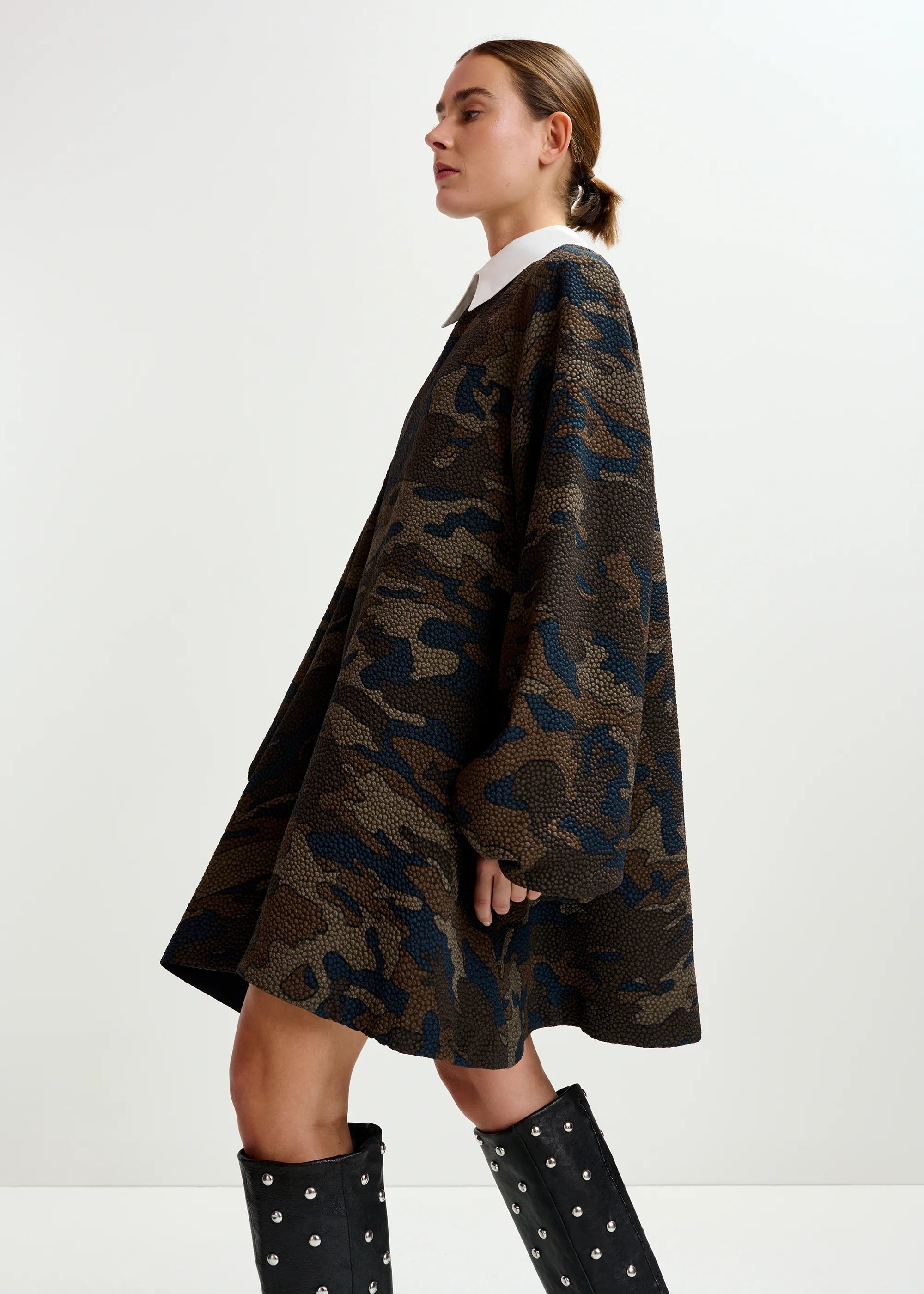 Oversized A-line mini dress, crafted from a recycled polyester blend is designed with dropped shoulders and voluminous sleeves. The hidden zip fastening ensures a smooth finish, and the removable white collar adds a versatile, polished touch—perfect for switching up your look from edgy to refined. Finished in a camouflage print, this piece balances structure and softness with a contemporary edge.