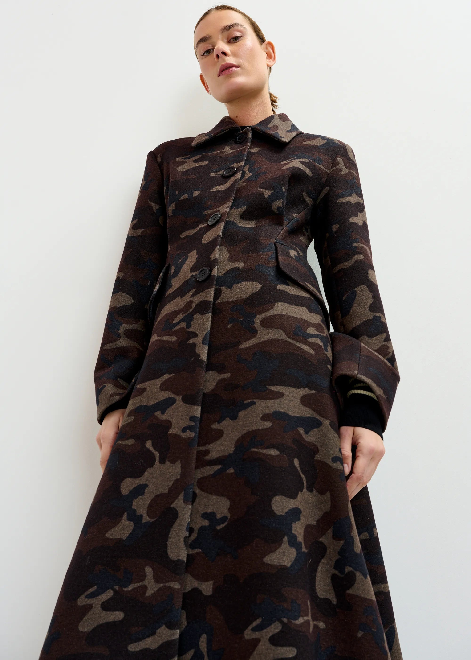 Tailored from a wool-blend, this coat is designed for an oversized fit. It features wide notched lapels and a self-fabric collar for a structured look, while the dropped shoulders and wide sleeves add a modern, laid-back feel. Finished with oversized patch pockets for added practicality, this piece is a refined cold-weather essential.