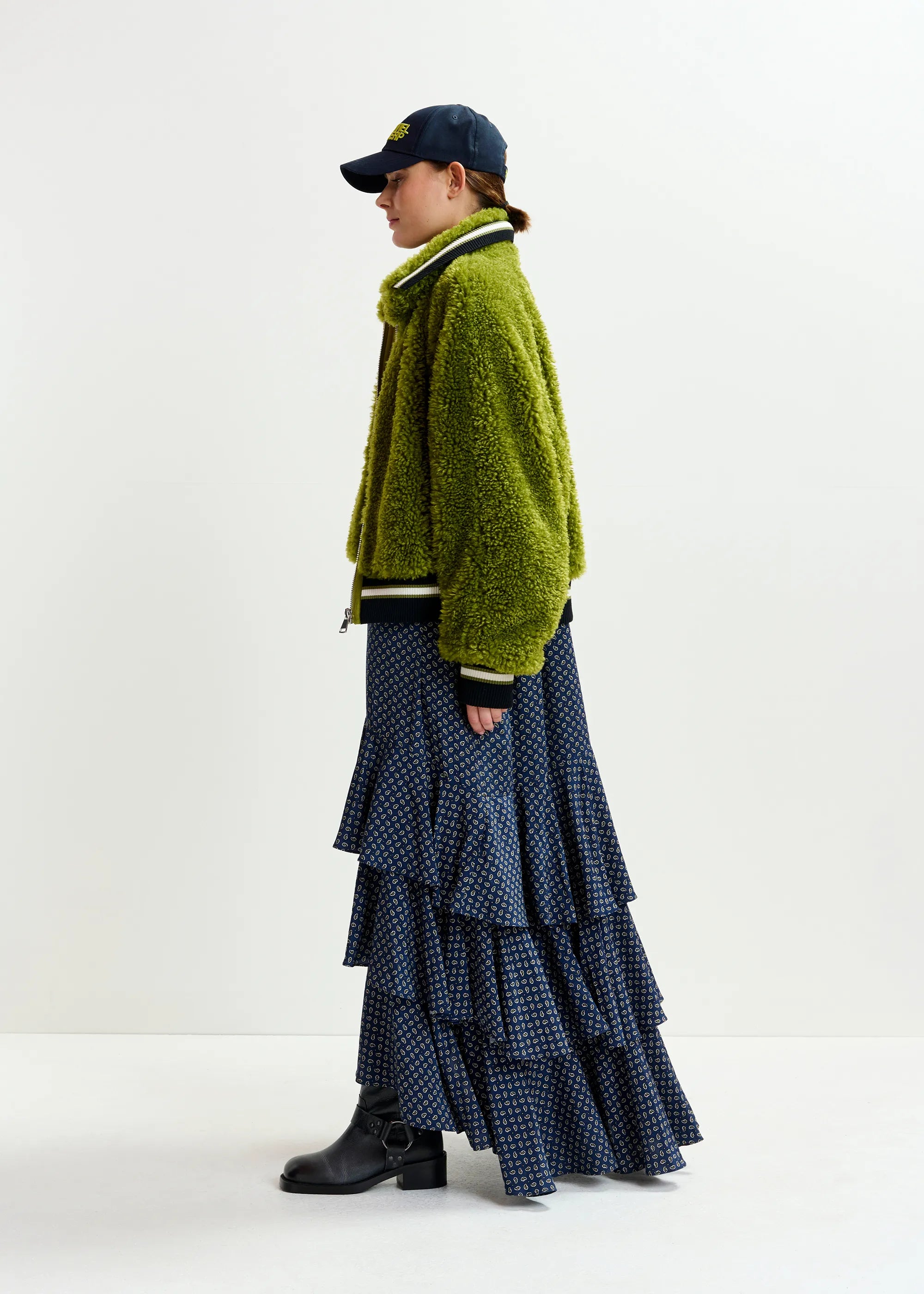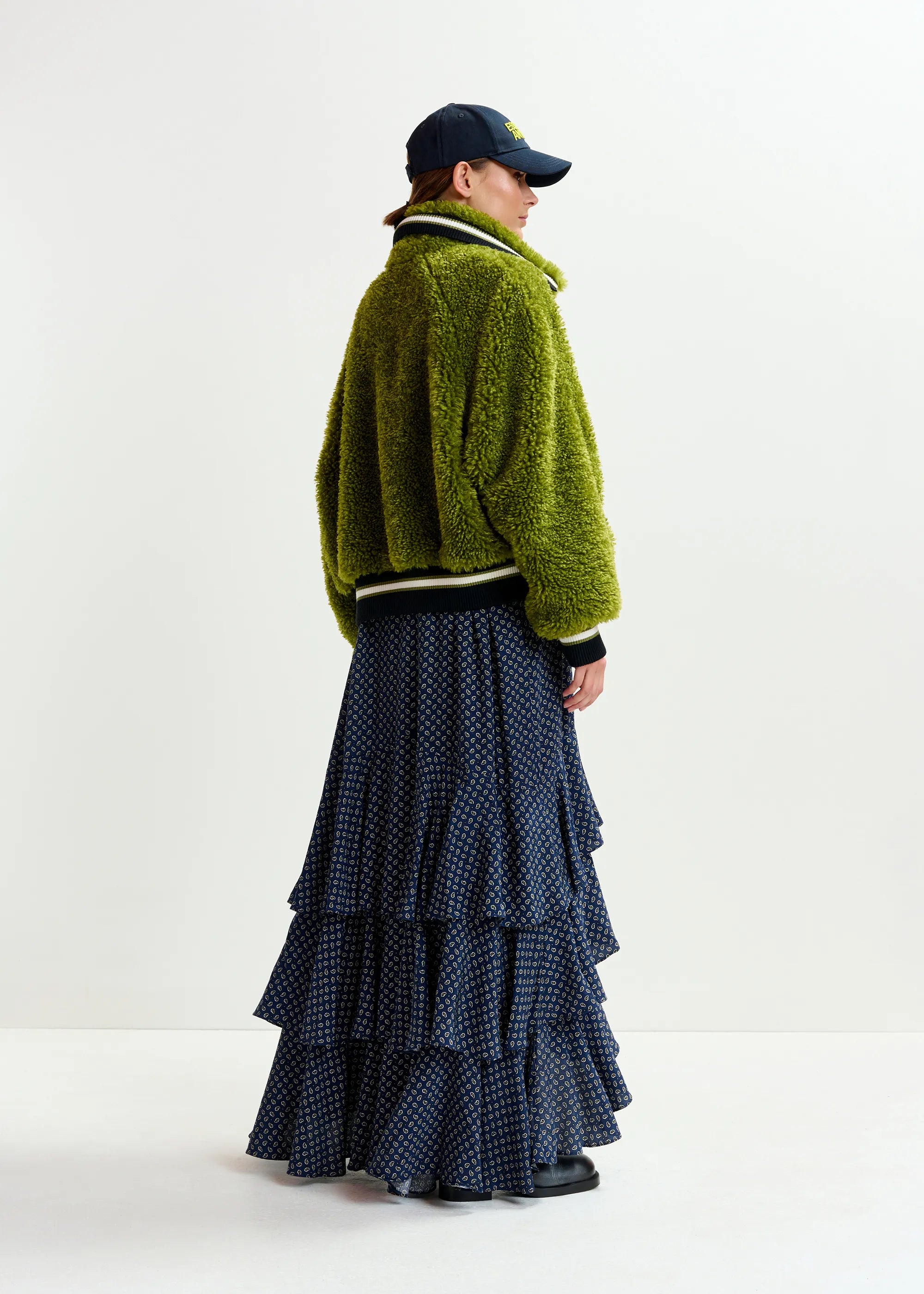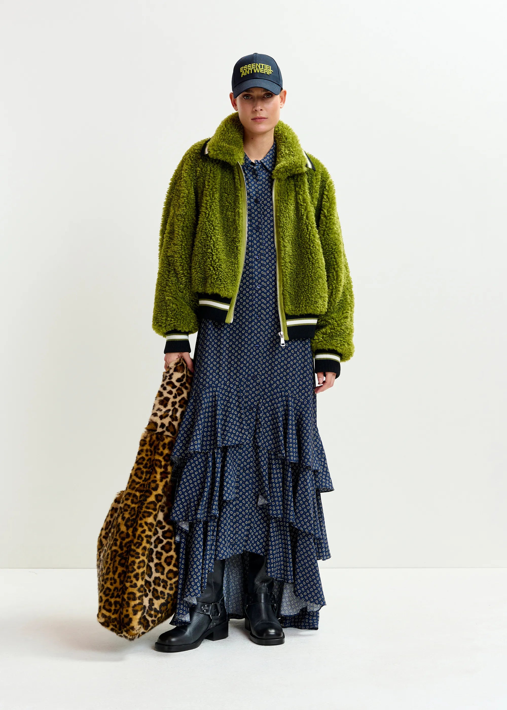 ESSENTIEL ANTWERP Green, black and white oversized faux shearling bomber jacket