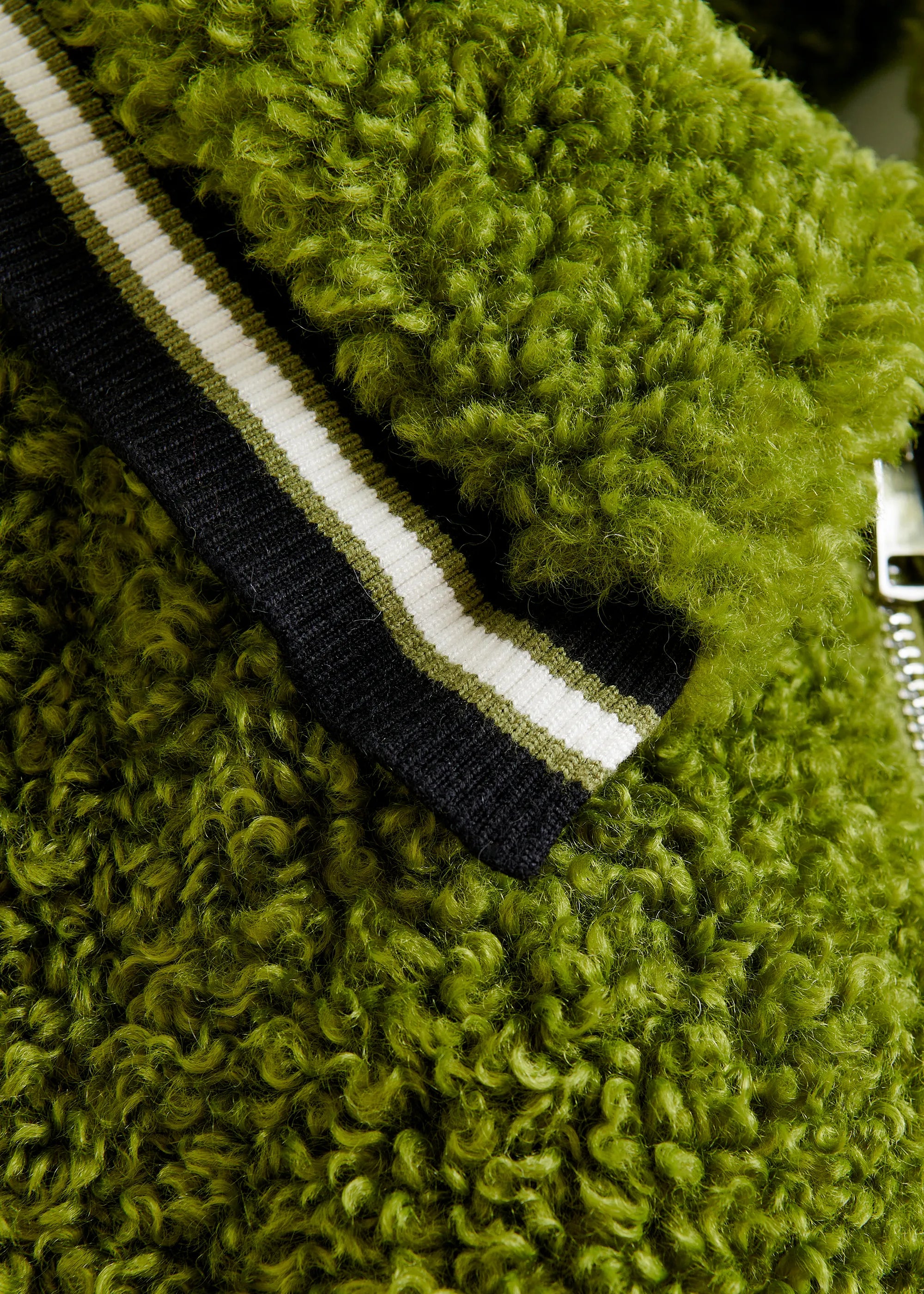 Bomber-style jacket is crafted with a high-pile faux shearling texture. Designed for an oversized fit, it features a full zip fastening and is fully lined for easy layering. Ribbed knit trims at the hem, cuffs, and collar add a sporty edge, while contrasting stripe details provide a graphic finish. Functional side pockets complete the look, making this jacket both stylish and practical for cooler days.