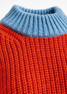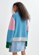 Oversized jumper with wide crew neck and long, loose sleeves. Block patterned in red, blue, pink, green and grey,