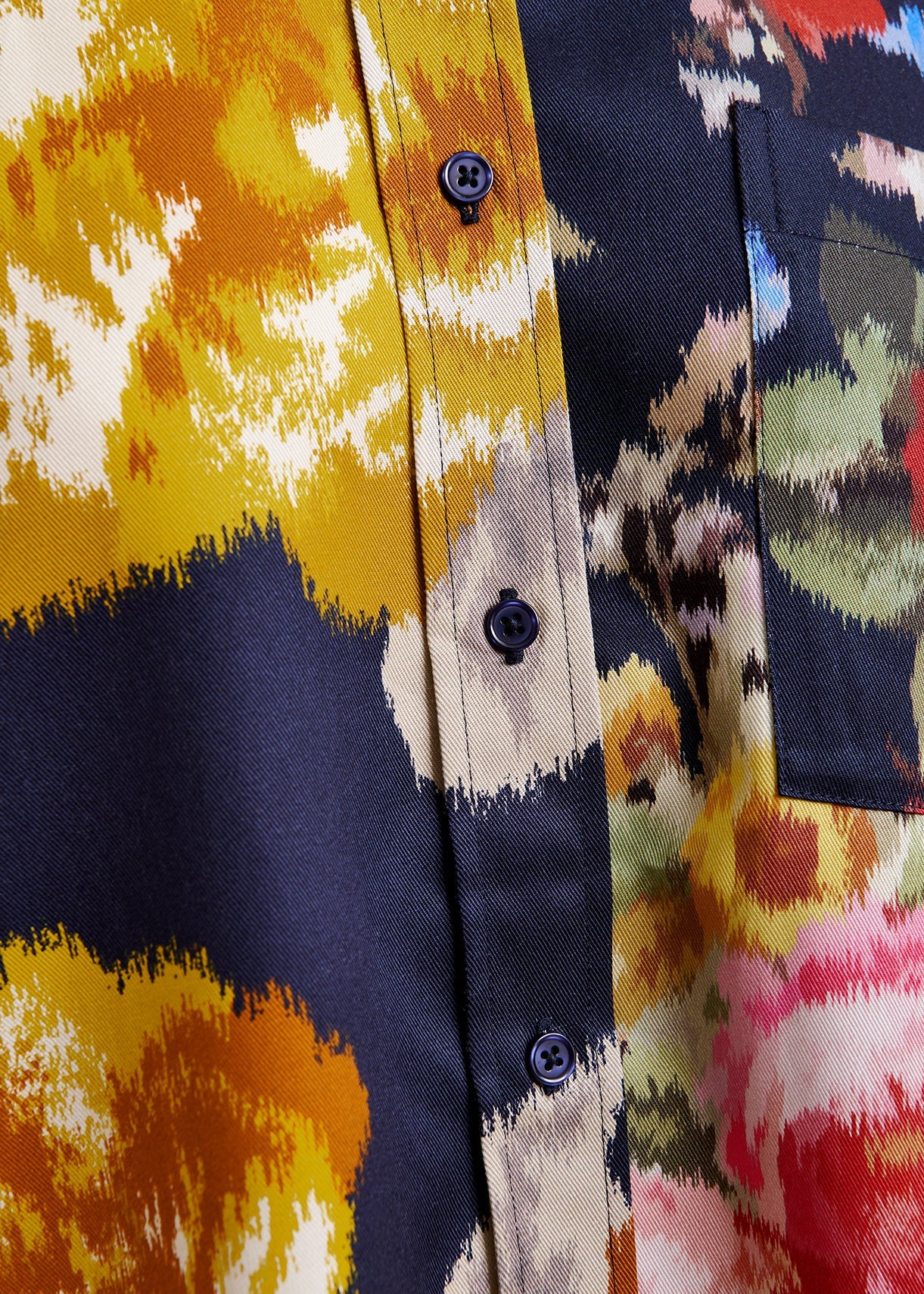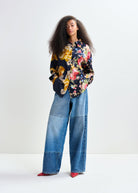 Cut from fluid fabric, this shirt comes cut from two different flower patterned textiles. Designed with one side in navy and mustard and the other in multicolours, you are sure to stand out in the crown.