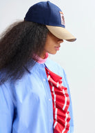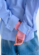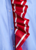 ESSENTIEL ANTWERP Blue and white pinstripe cotton shirt with red ribbon detail