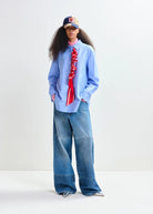 Cut from 100% cotton, this striped shirt is designed for an oversized fit with dropped shoulders and a relaxed silhouette. It features a point collar, button fastening through the front, and a rounded hemline. A contrasting ribbon detail runs along the placket, adding structure and dimension to the design.