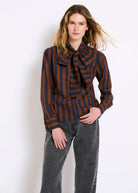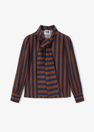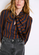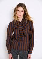 Navy blue and brown striped blouse. It features a large bow at the neck that adds a sophisticated, retro touch. Straight cut, it has long, slightly puffed sleeves with defined cuffs. The flowing fabric and contrasting colours give it an elegant yet distinctive character.