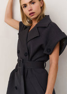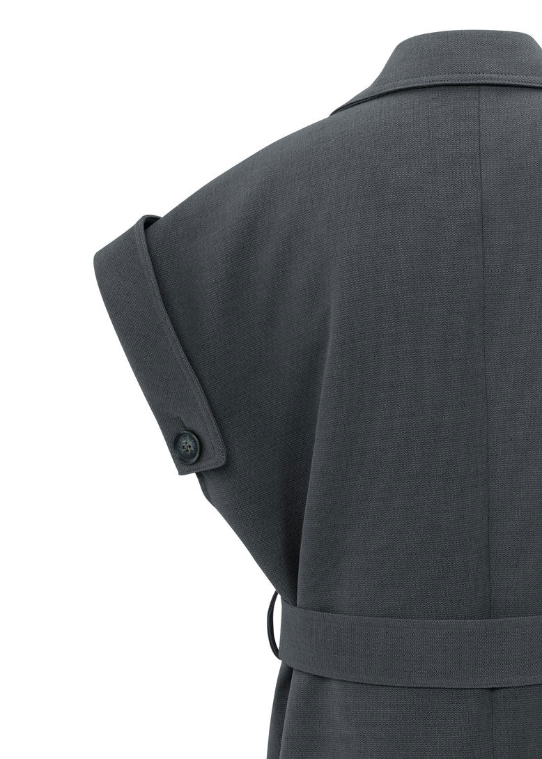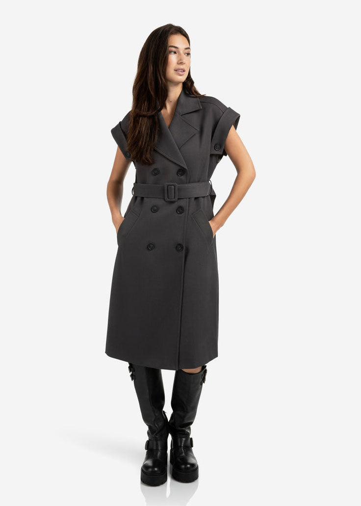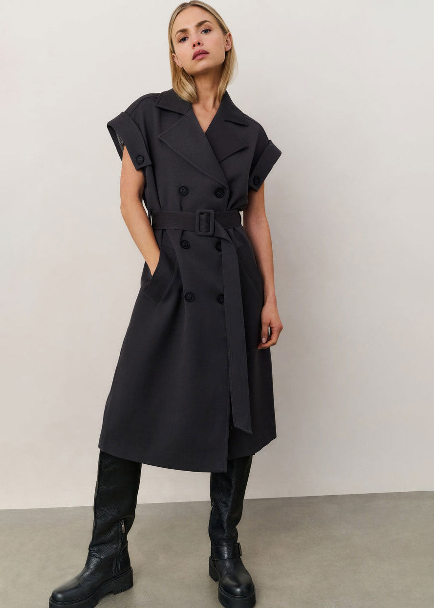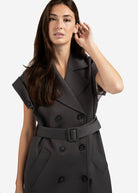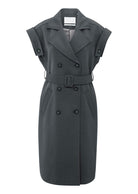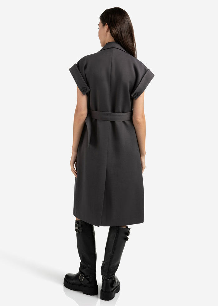 This elegant sleeveless coat features a long, regular fit with a double-breasted button closure, classic lapels and a removable waist belt for a feminine shape. The rolled-up shoulders with button detail add a bold touch. Made from a soft woven fabric, perfect for layered styling or worn on its own as a dress. The model is 175 cm and wears size 36.