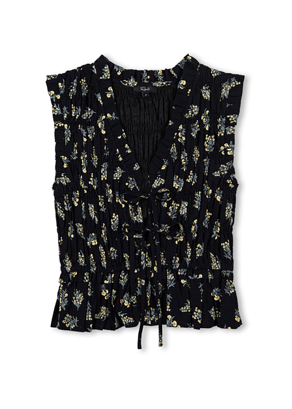 Crafted from 100% lightly textured cotton adorned with dainty bouquets, the Martine does feminine details right with smocking, ruffled edges and front-ties for a customizable fit.