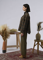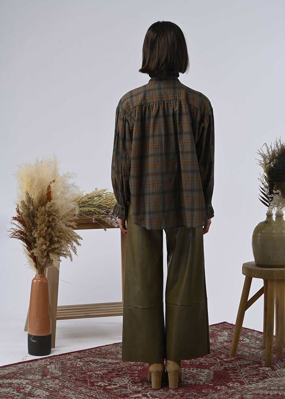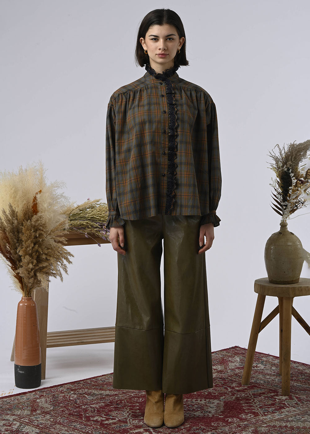 An elegant shirt with a refined twist: a collar and buttoned placket trimmed with lace, for a feminine touch on plaid or graphic prints. Available in celadon check, raspberry check, or wildness pattern.
