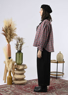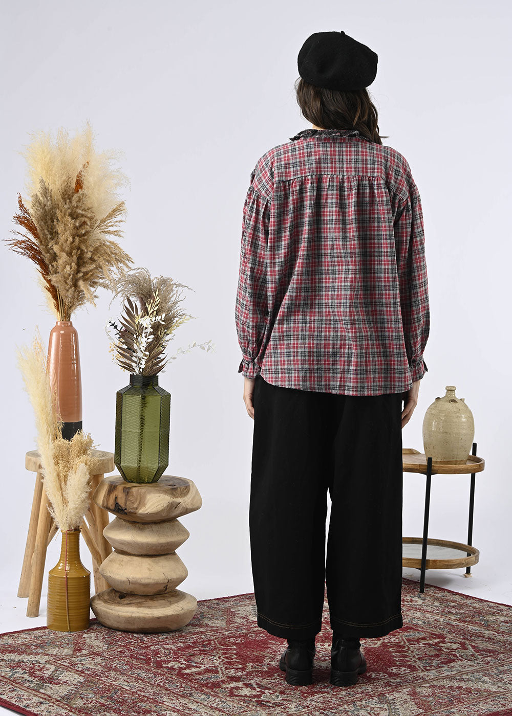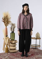 An elegant shirt with a refined twist: a collar and buttoned placket trimmed with lace, for a feminine touch on plaid or graphic prints. Available in celadon check, raspberry check, or wildness pattern.