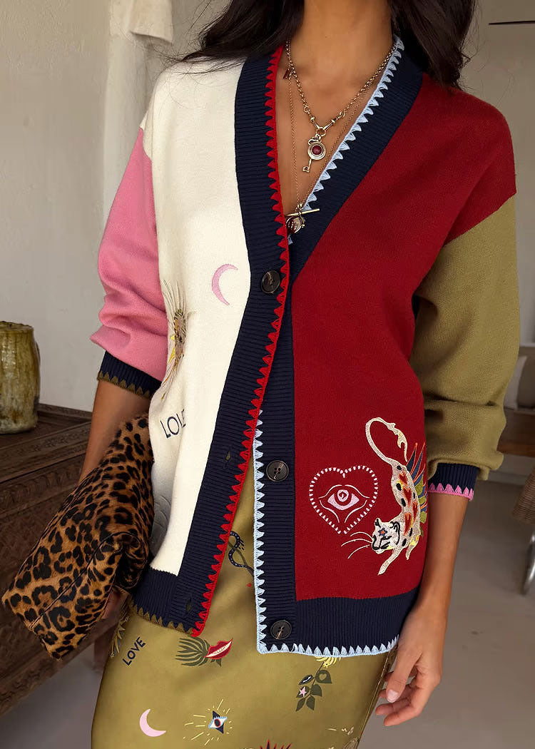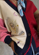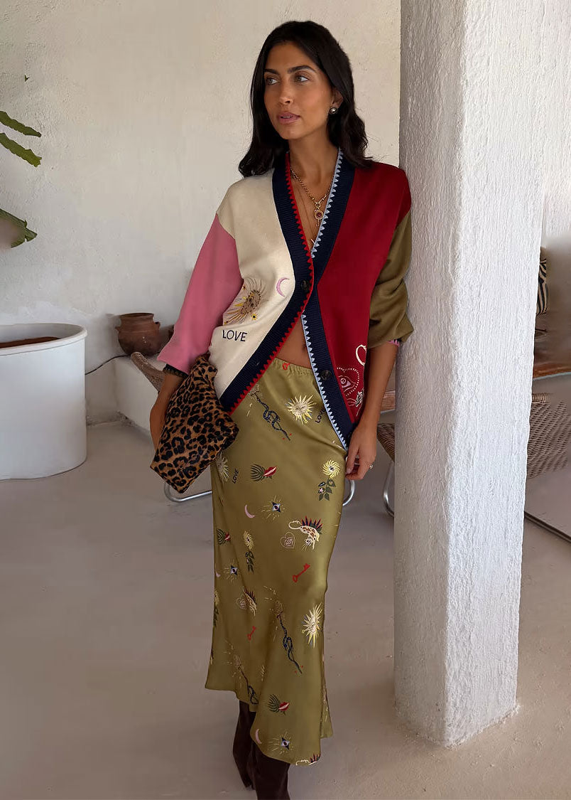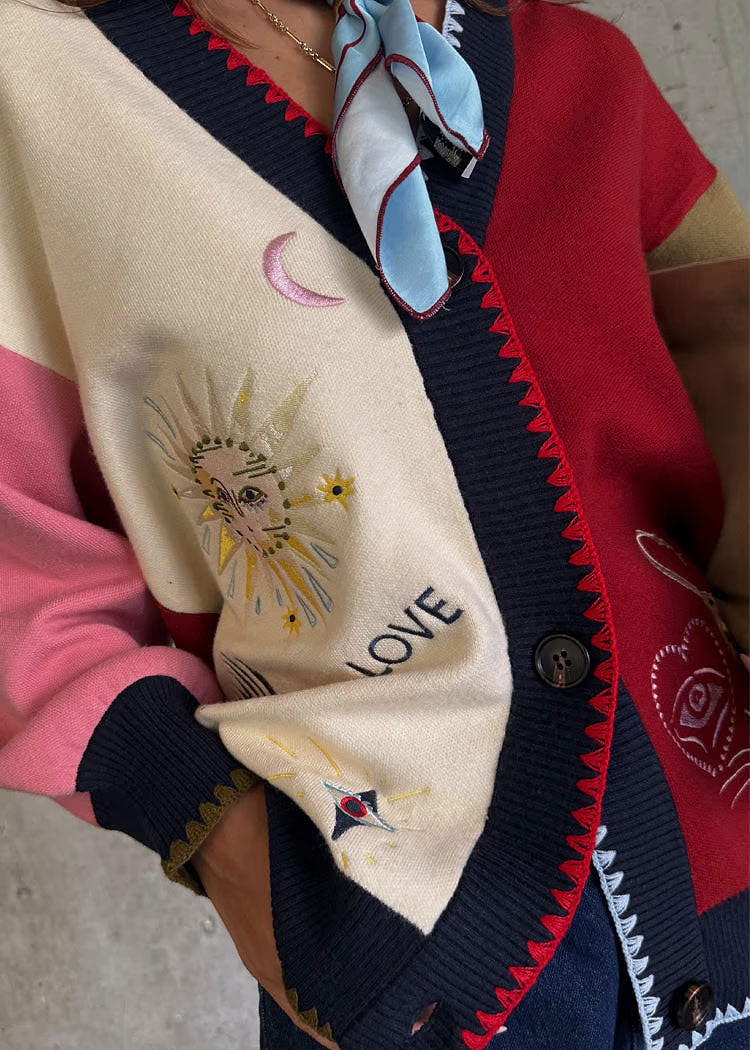 Our bestselling knits are weighty, soft touch and a definite wardrobe staple! We're starting the new year with a new edition of our mystical print, featuring embroidered motifs on a multicoloured base. With contrast blanket stitching on the hems adding an additional touch of texture, it's the perfect feel good throw on!