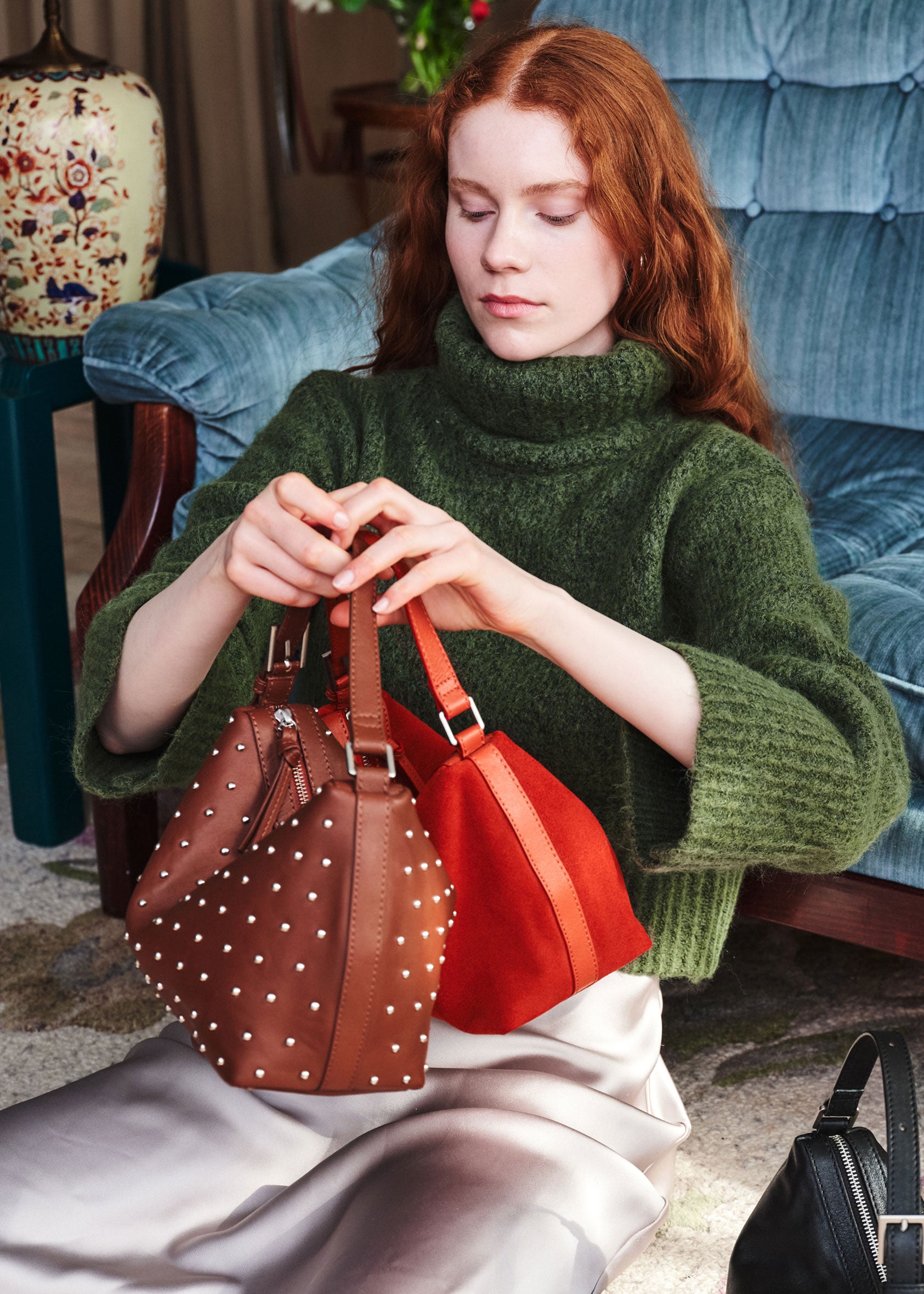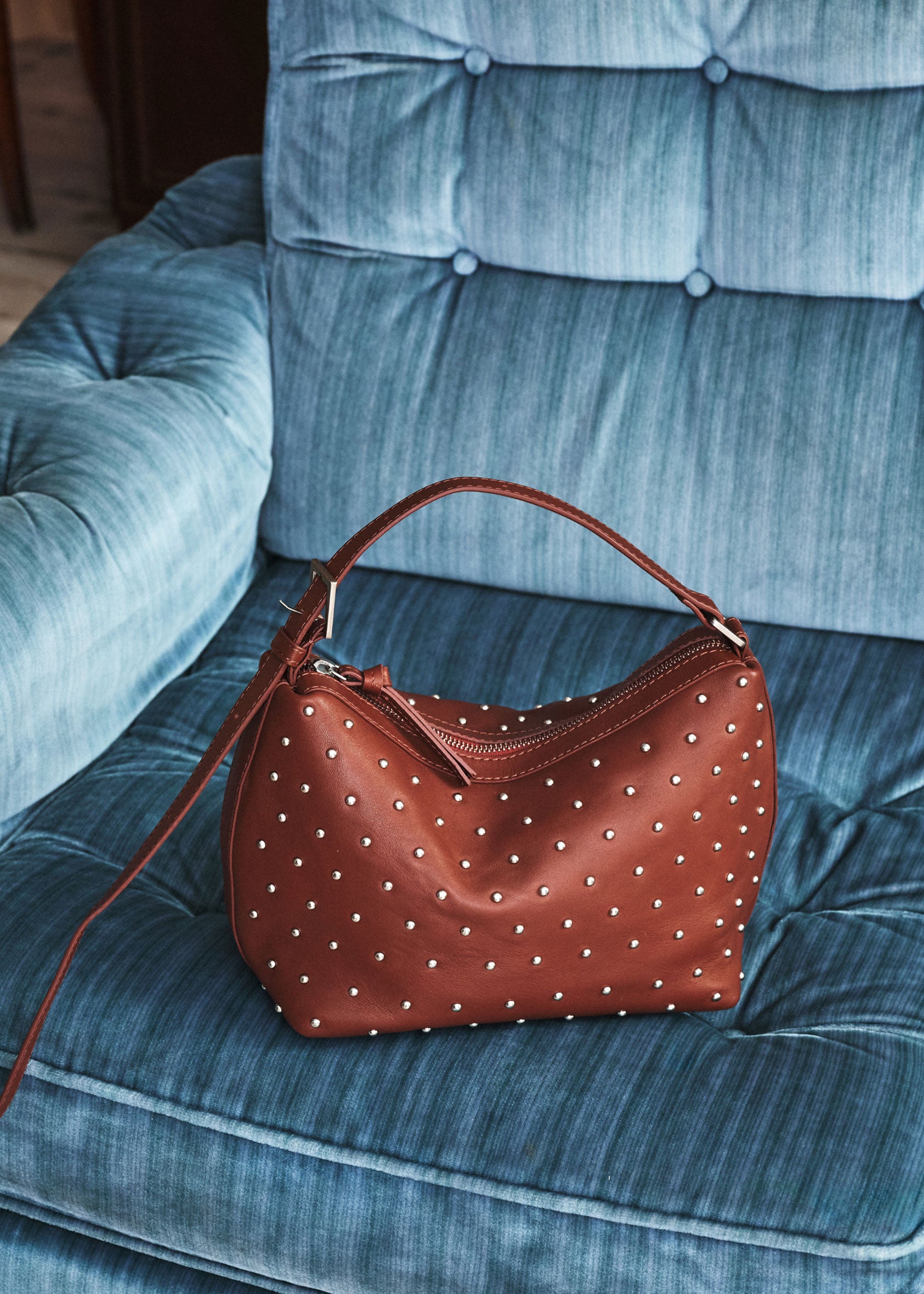 The Nappa Stud Ginni Bag is a bag designed by Becksöndergaard in 100% sheep leather. It features a spacious main compartment with a small inner zip pocket. Measuring 22x18 cm, the bag can be carried on the shoulder or by hand, with its handle adorned with delicate details.