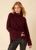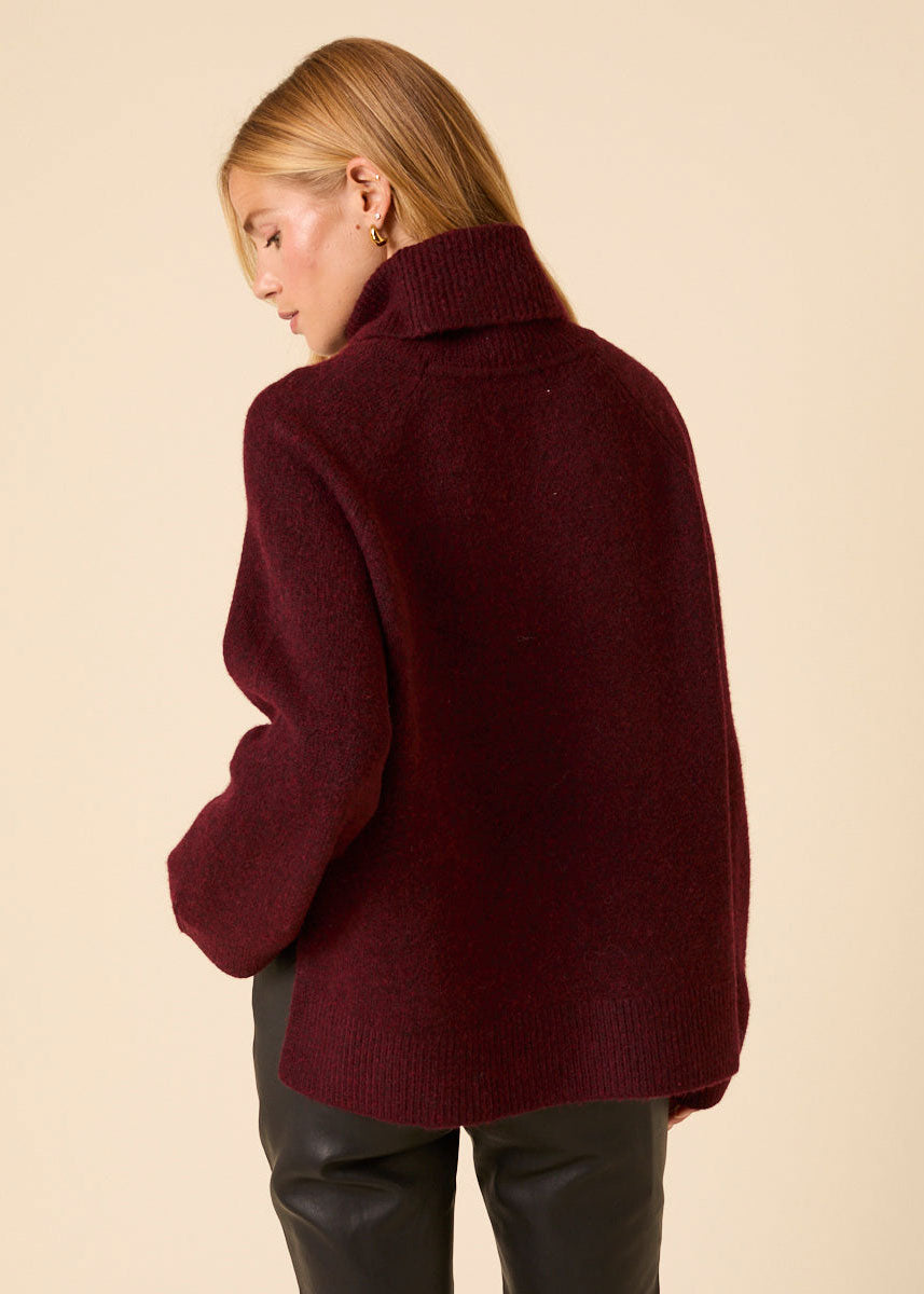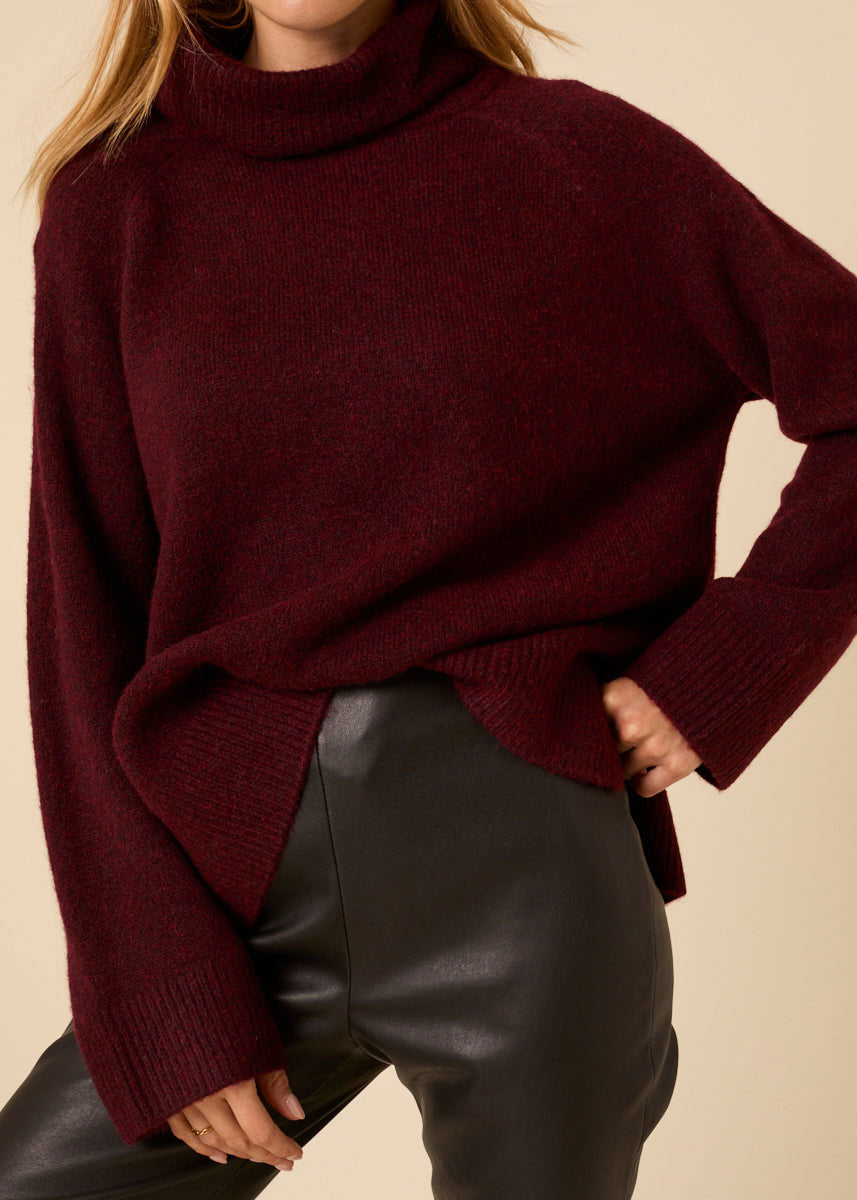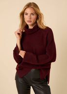 This burgundy roll-neck jumper is knitted with a soft, cosy feel. Designed with long sleeves and ribbed trims, it’s cut to a relaxed fit with subtle side slits.