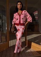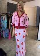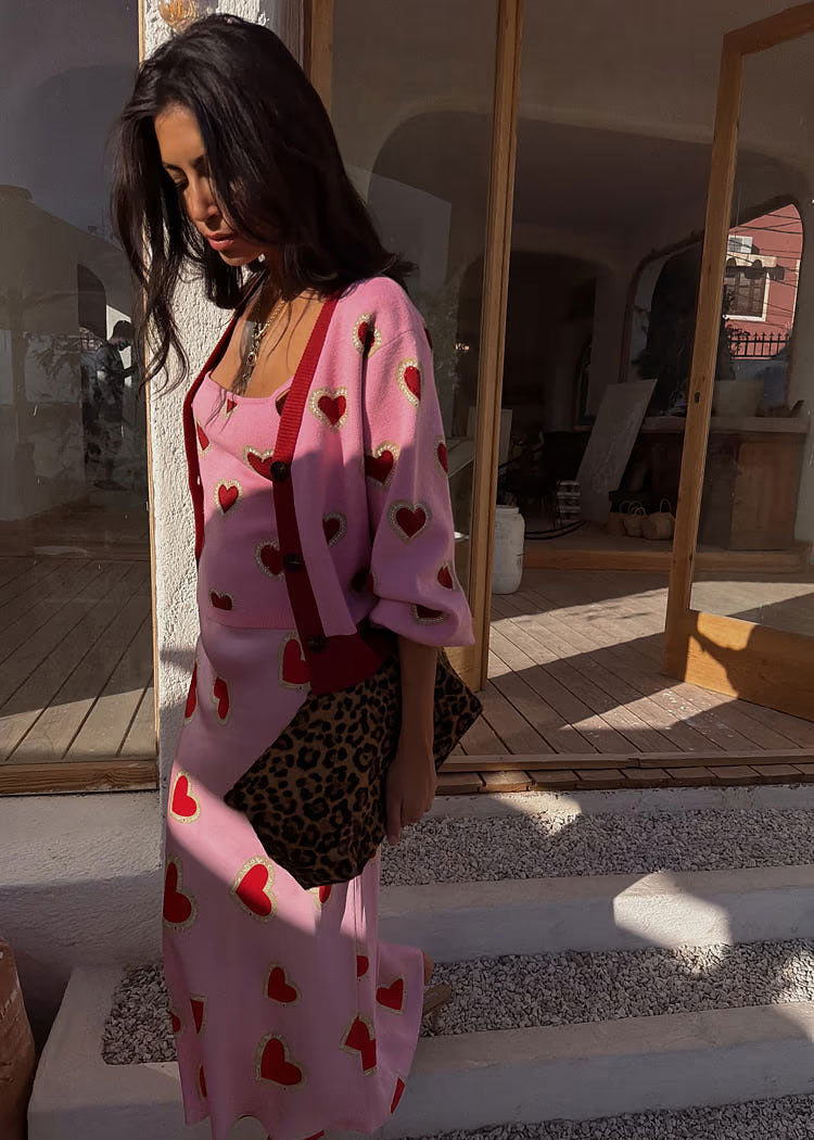 This cardigan is definitely bring a touch of NFD flare to your wardrobe! Ideal for the season, a light throw over for when it gets chilly in the evenings, the knitted fabric is so soft to the touch and feels weighty to drape the frame nicely. Embroidered with our new heart motif print, pair with the matching knit tank or elevated even further with our pink hearts dorris skirt for an effortlessly cut co-ord.