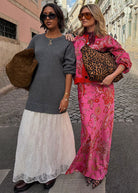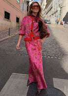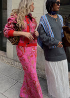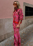 Our classic dorris silhouette in a new subtle paisley print on a bright and bold pink base! The relaxed silhouette allows you to style with ease, whether it's with a casual tee or paired with the matching cardigan and heels for a soft night out look.