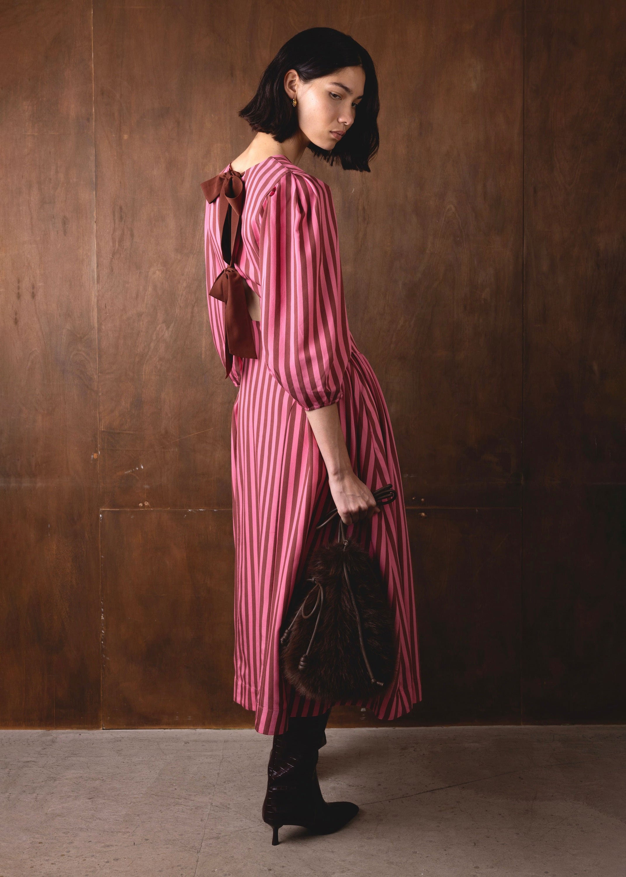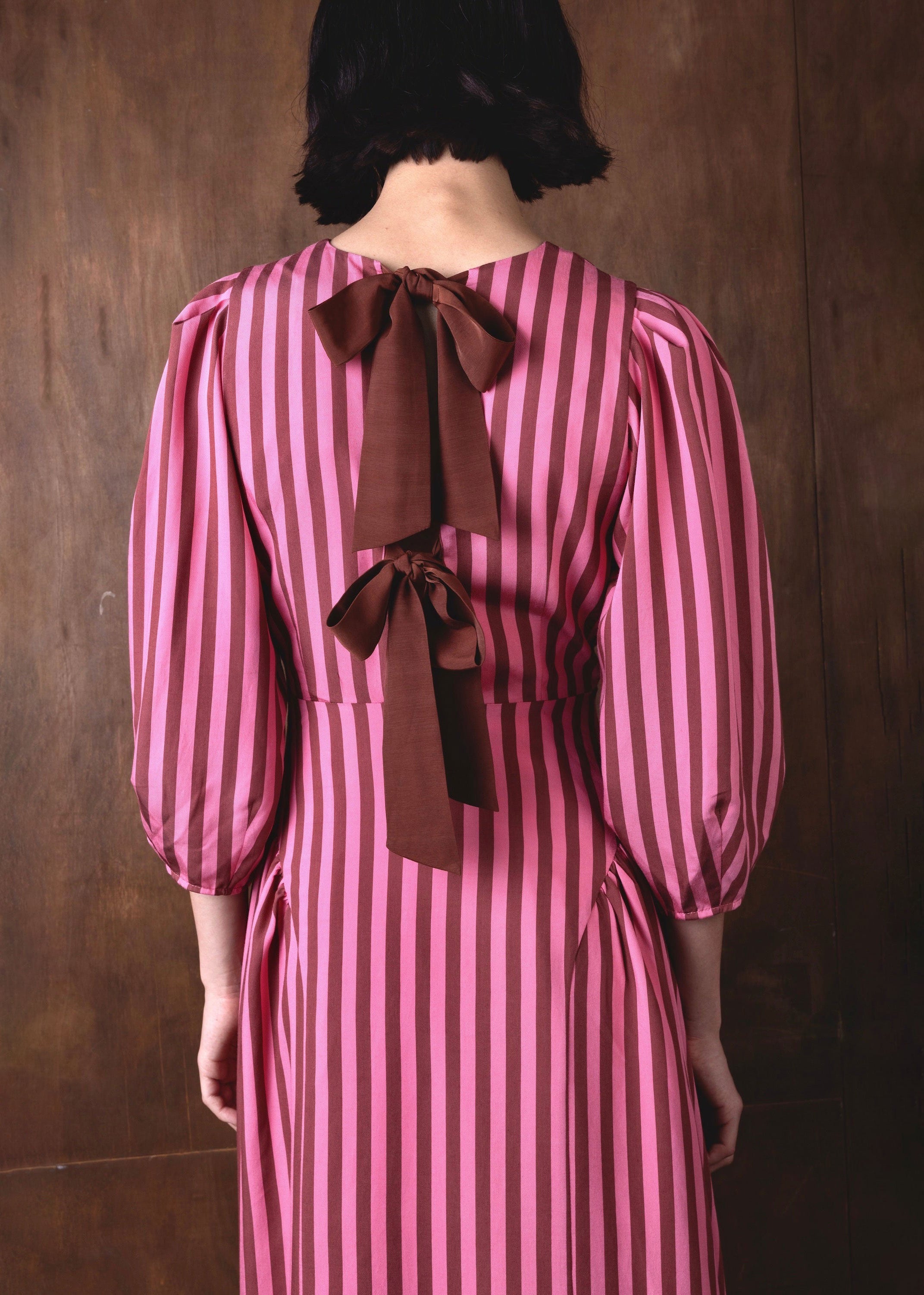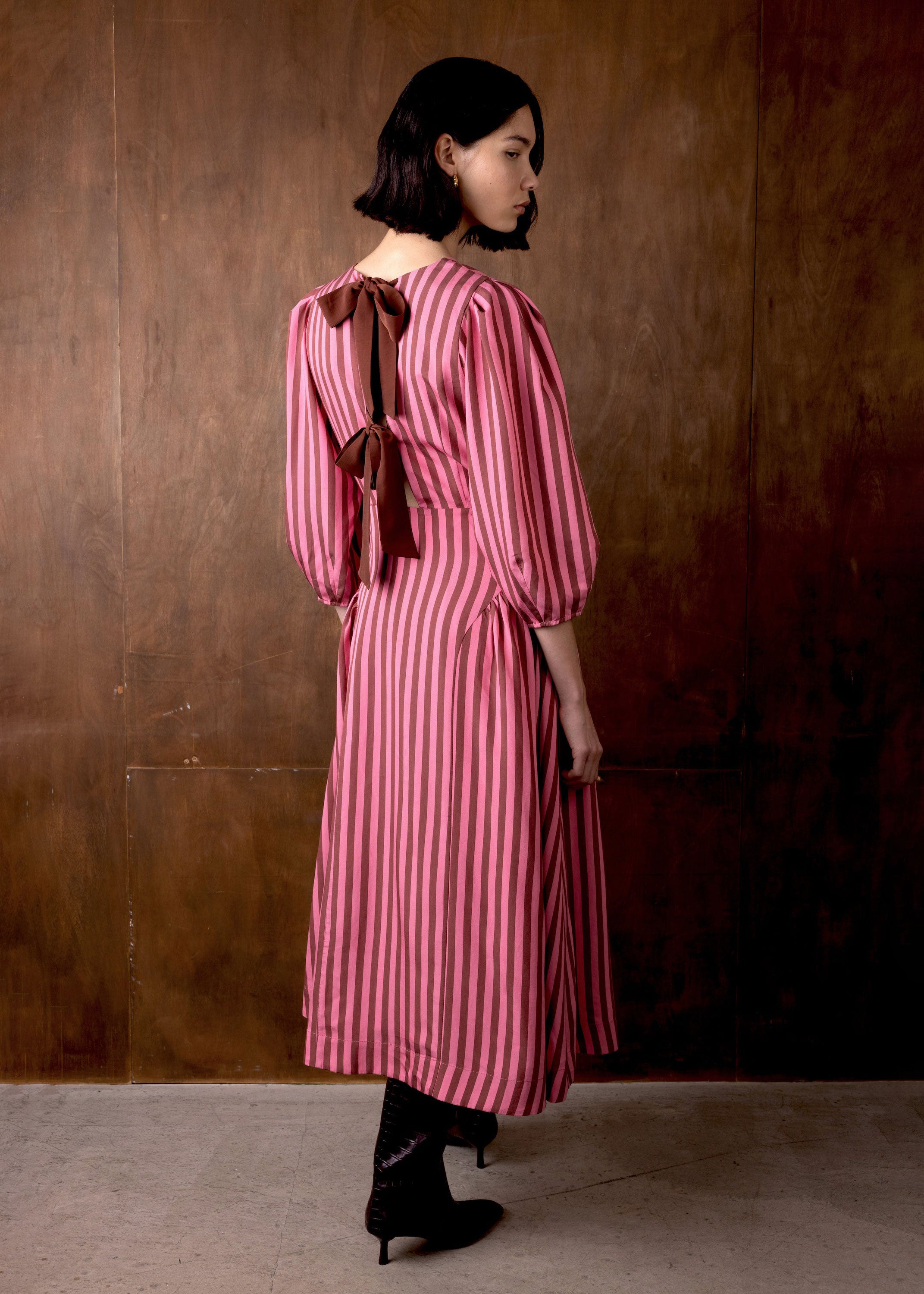 Our bestselling bow back PIPPA reimagined with sleeves for AW in a stunning pink and chocolate stripe. A defined waist frame and flowing midi skirt gives a feminine flair—ideal for garden gatherings or weekend escapes, styled with leather boots or minimal heels.