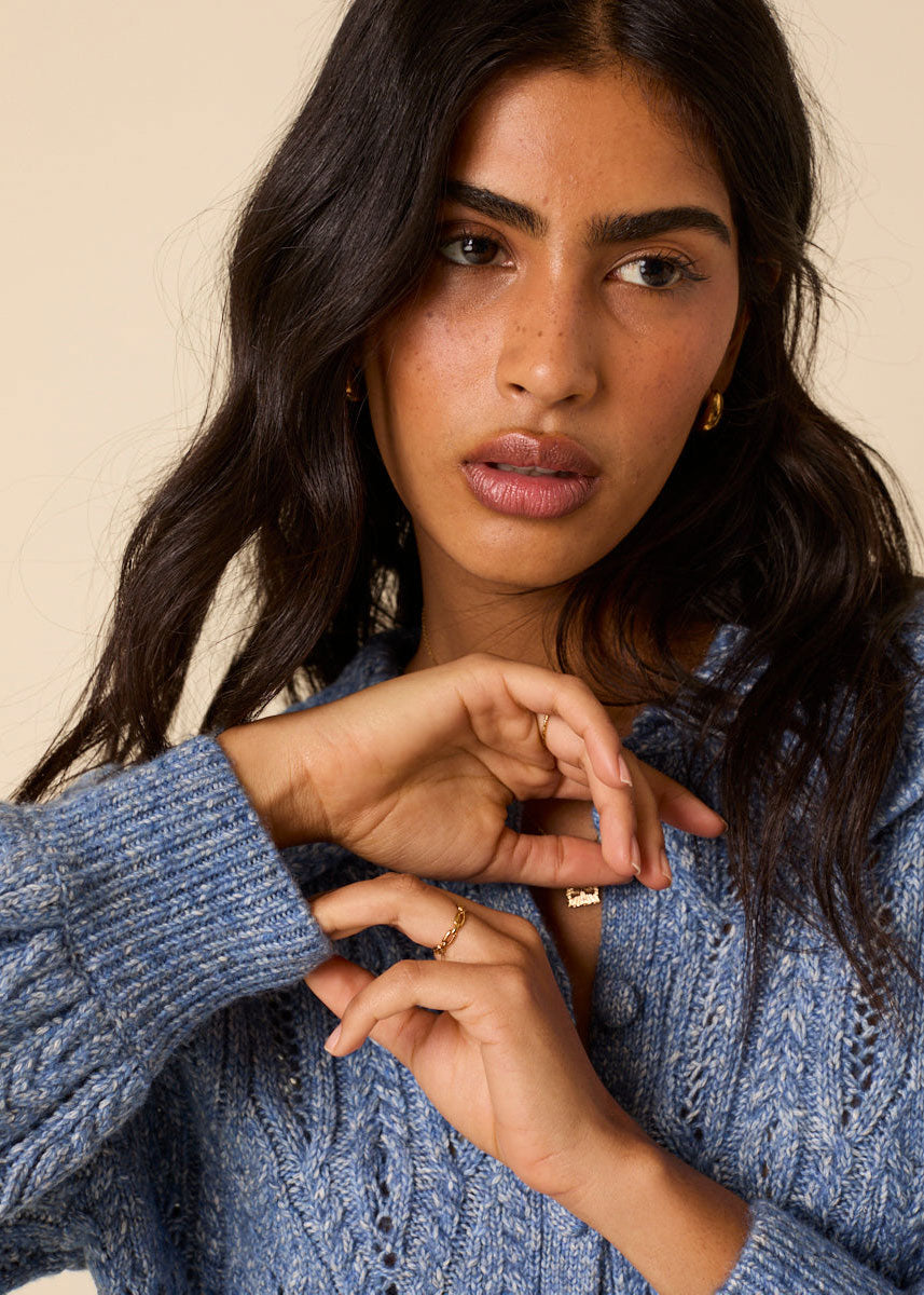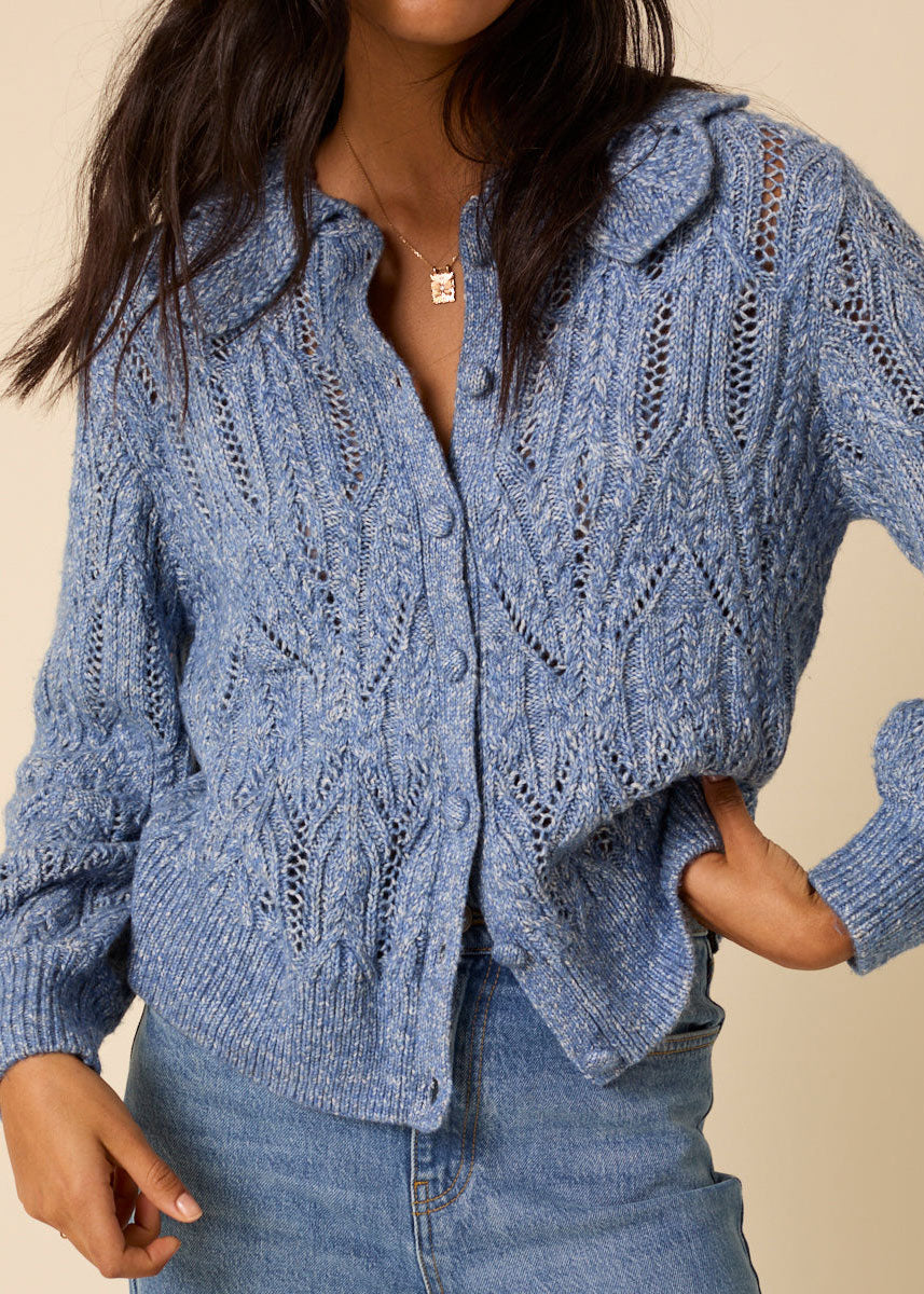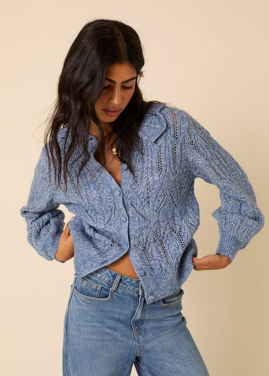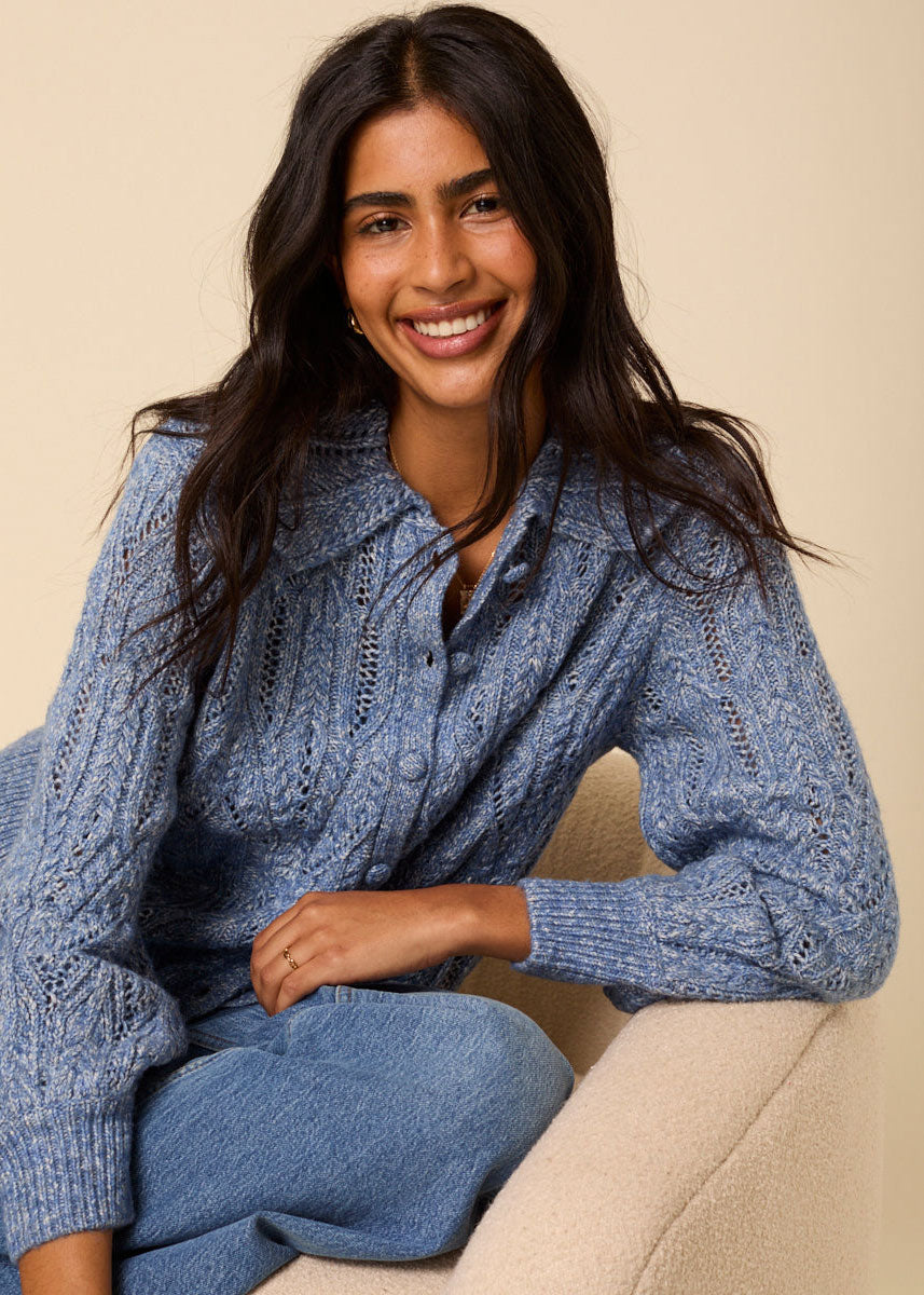 With a soft knit feel, this blue cardigan has a relaxed fit that's perfect for layering. It's finished with a feminine, scalloped collar and textured pointelle detail.