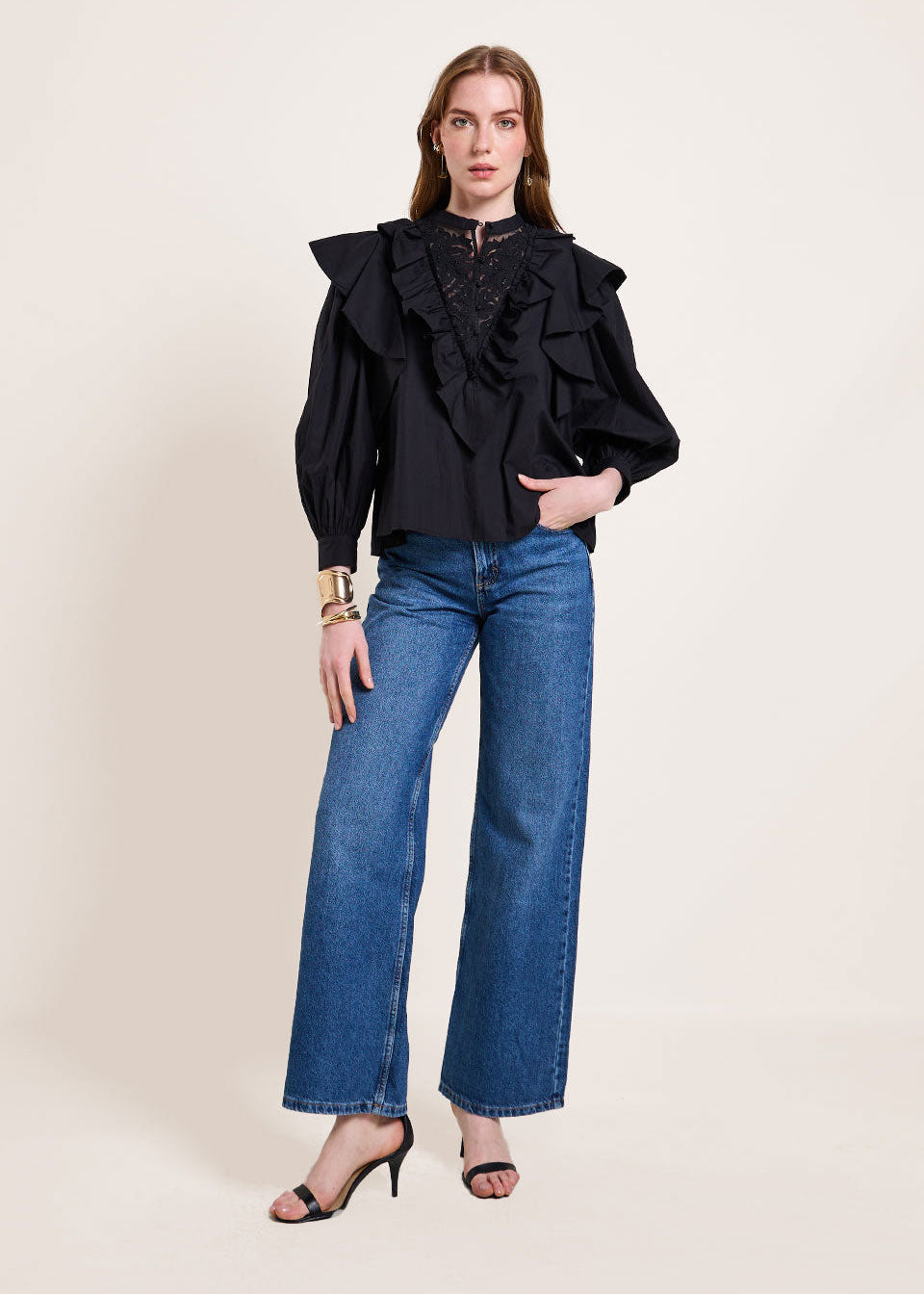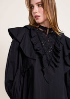 Ruffle inserts at the yoke and a flounce at the armholes infuse femininity, while the soft, voluminous full sleeves with cuffs create a graceful silhouette. With a straight fit, this top is a timeless blend of elegance and contemporary charm.
