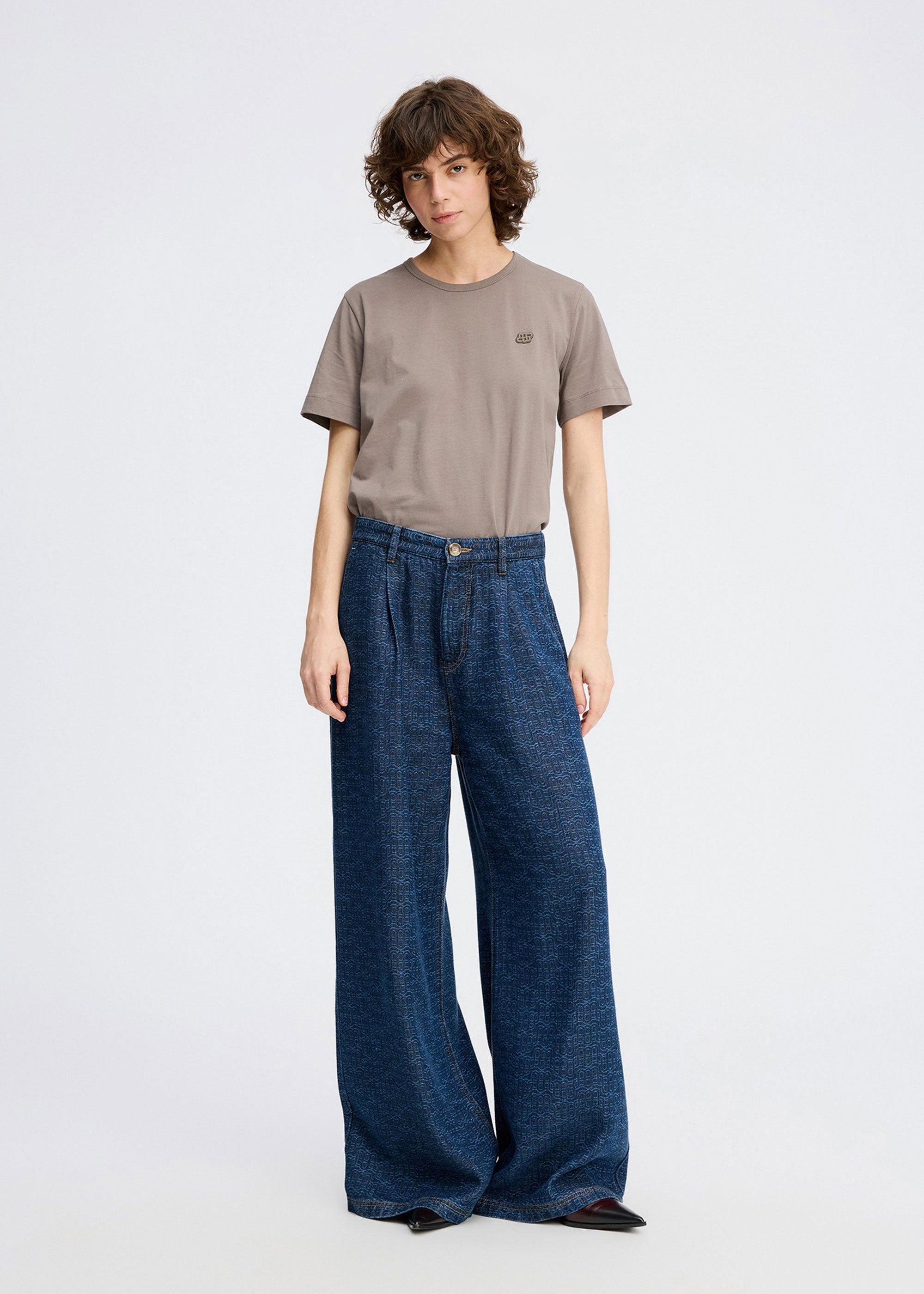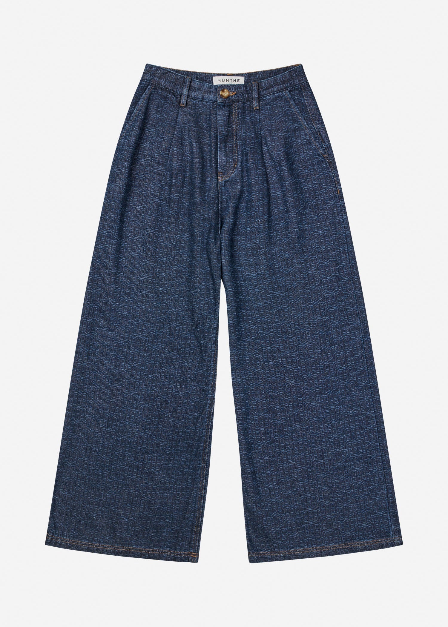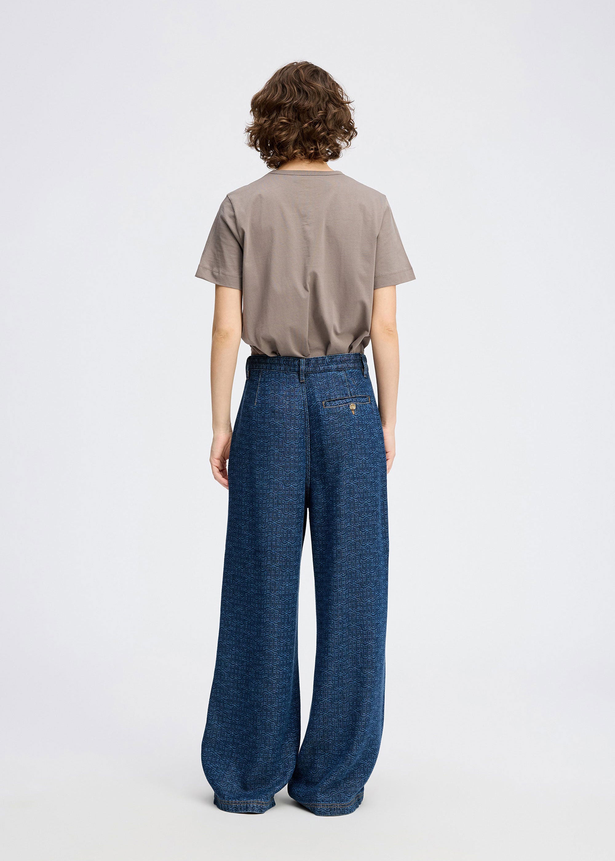 Jeans in soft denim with a subtle, woven MUNTHE emblem in matching blue tones. Designed with wide legs, a high waist, slanted pockets, and a classic button and zip closure.