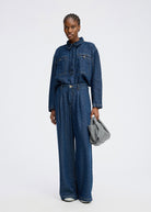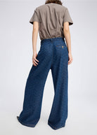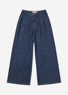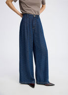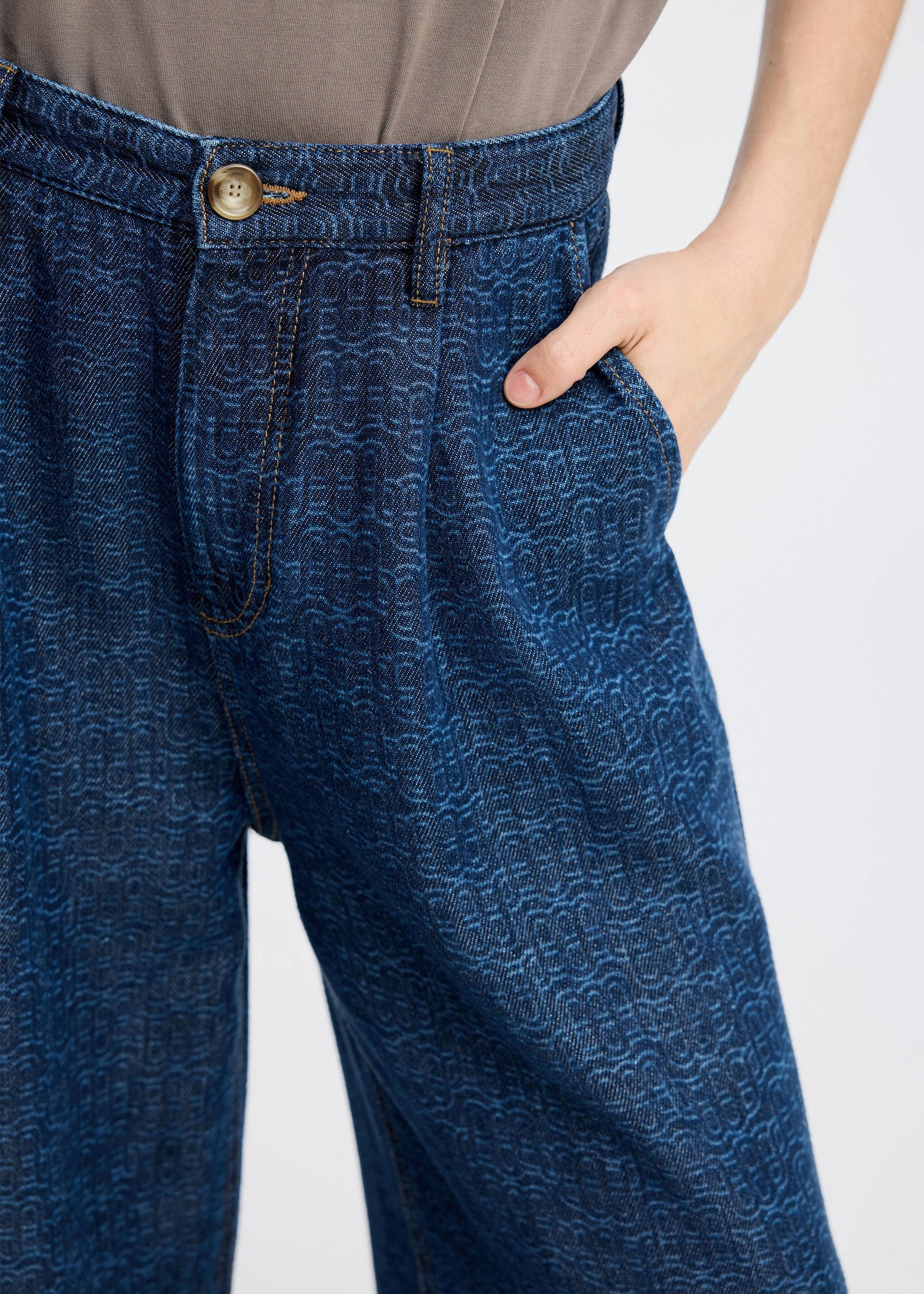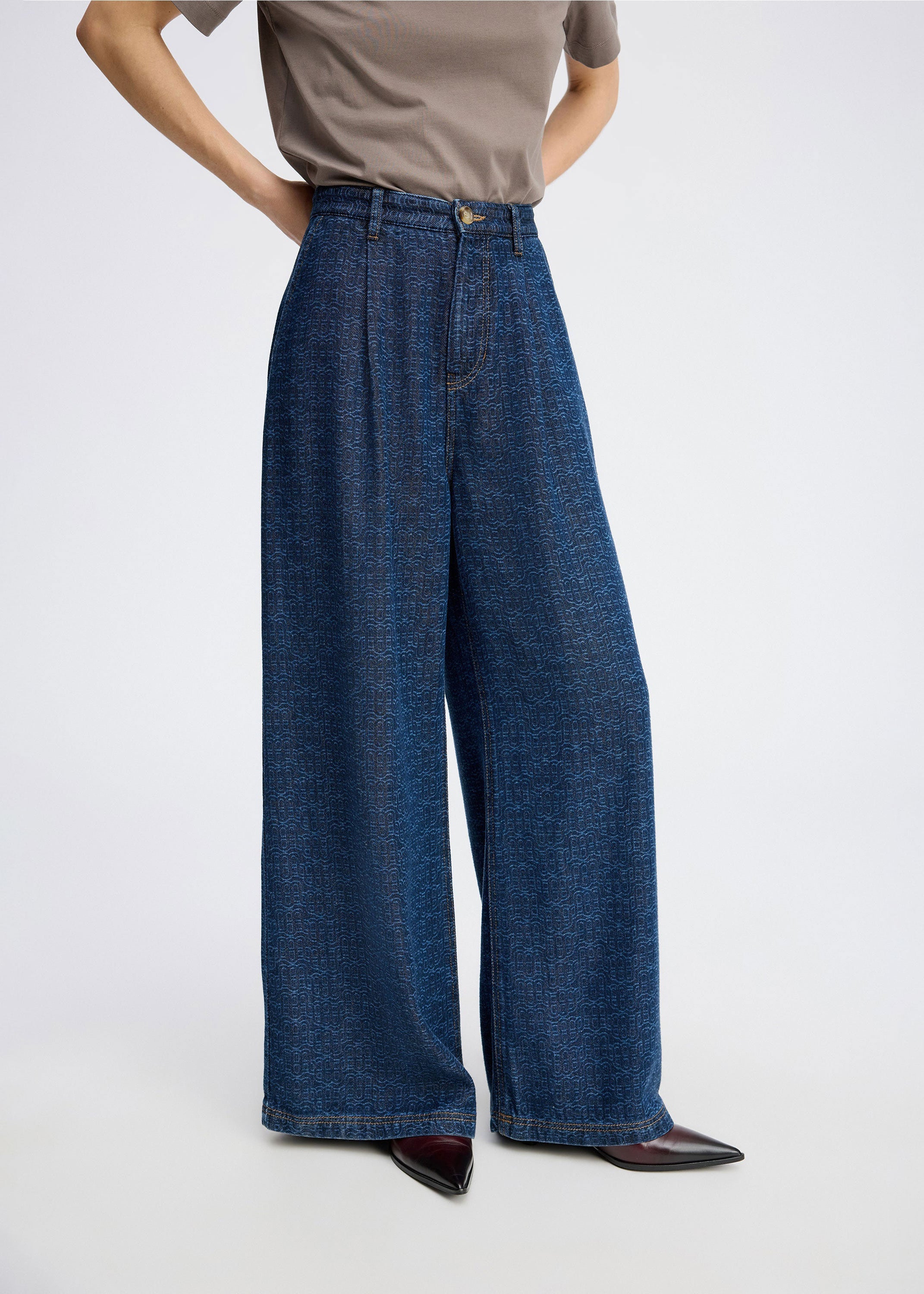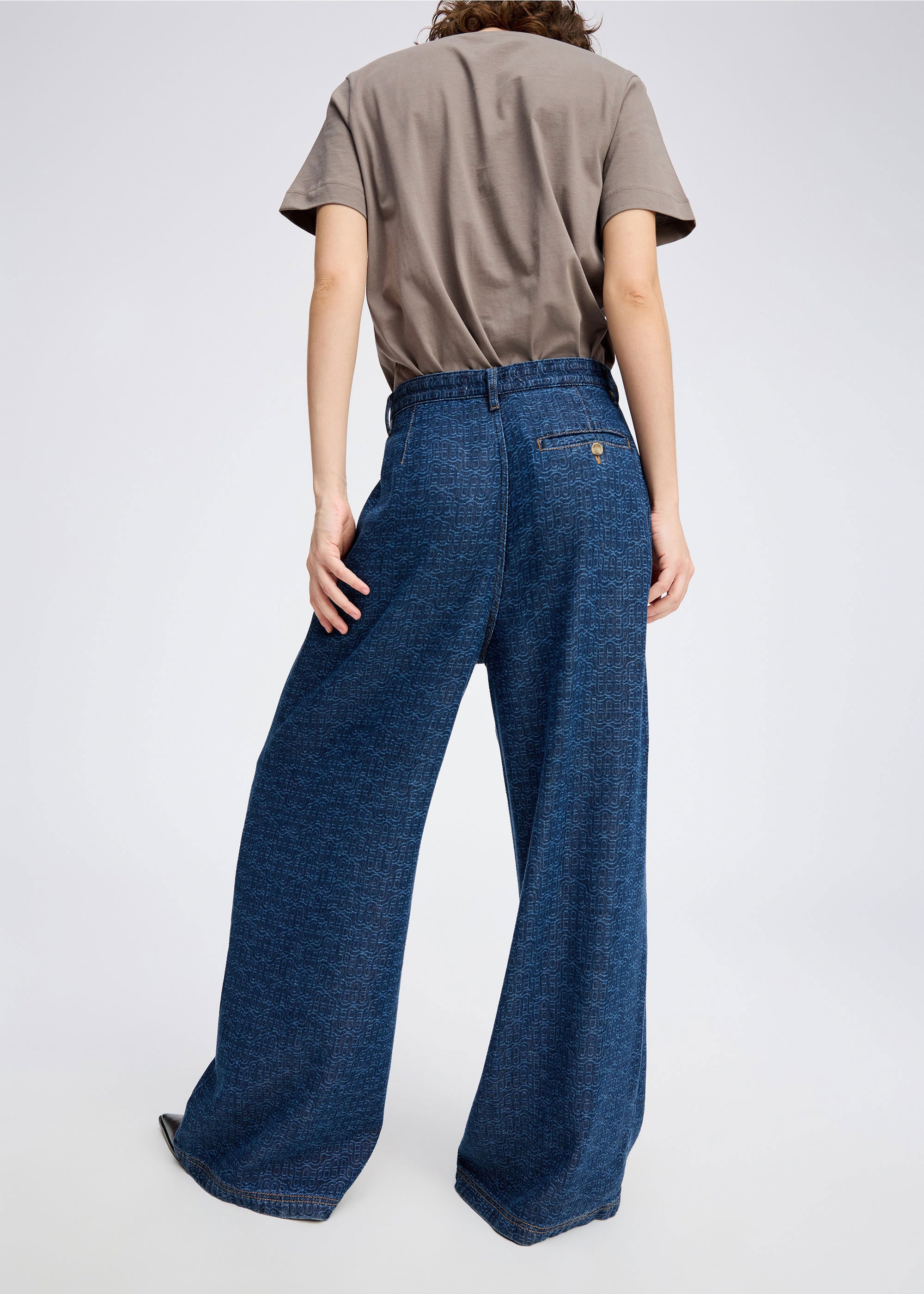 Jeans in soft denim with a subtle, woven MUNTHE emblem in matching blue tones. Designed with wide legs, a high waist, slanted pockets, and a classic button and zip closure.