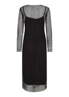 The KrystalCC Net Dress from Co'Couture is a long dress with long sleeves, crafted from sheer net fabric adorned with sparkling stones. A black slip dress under the dress creates a classy contrast. Glamorous, striking, and perfect for evening occasions.