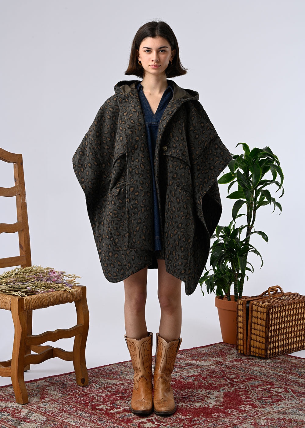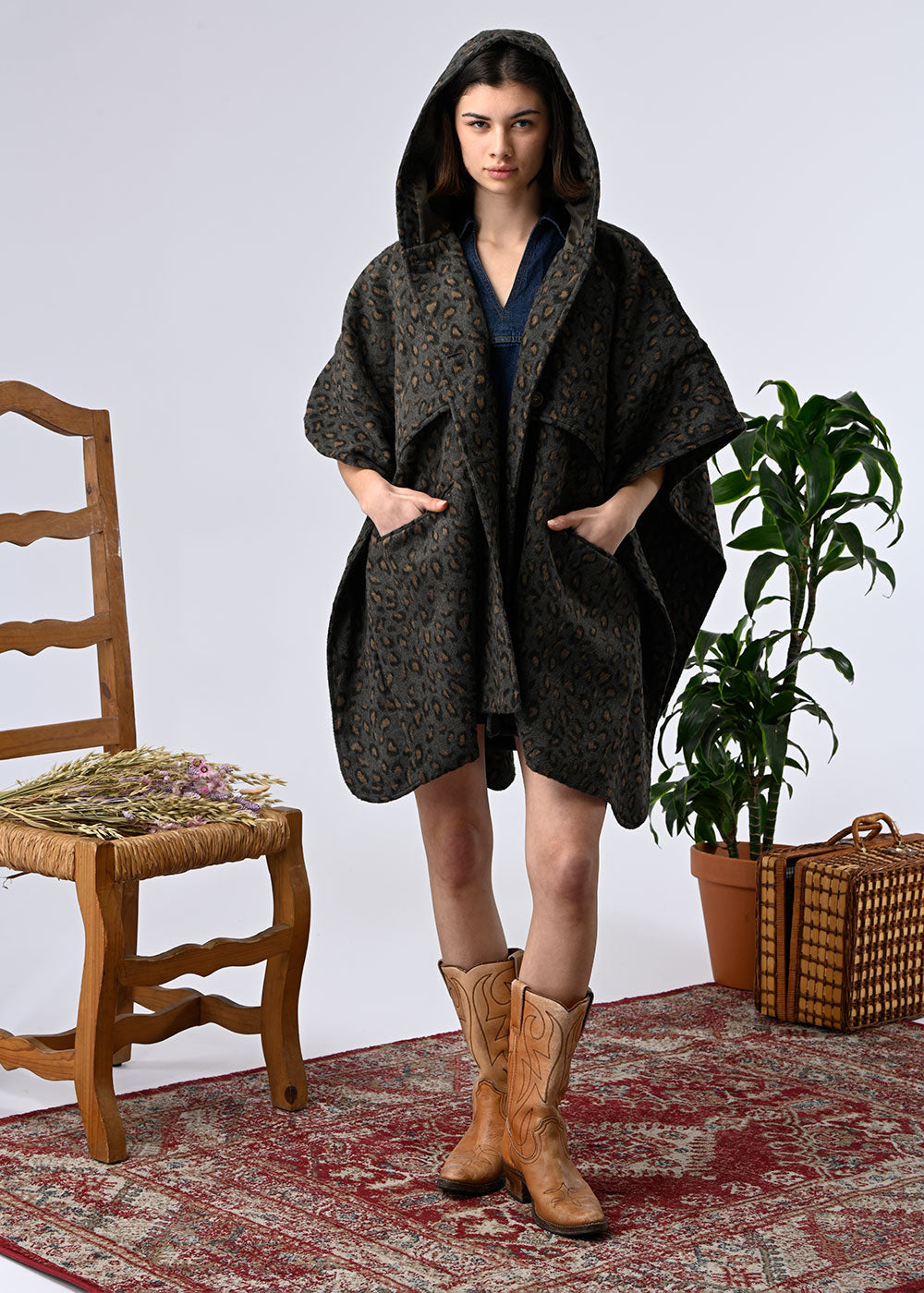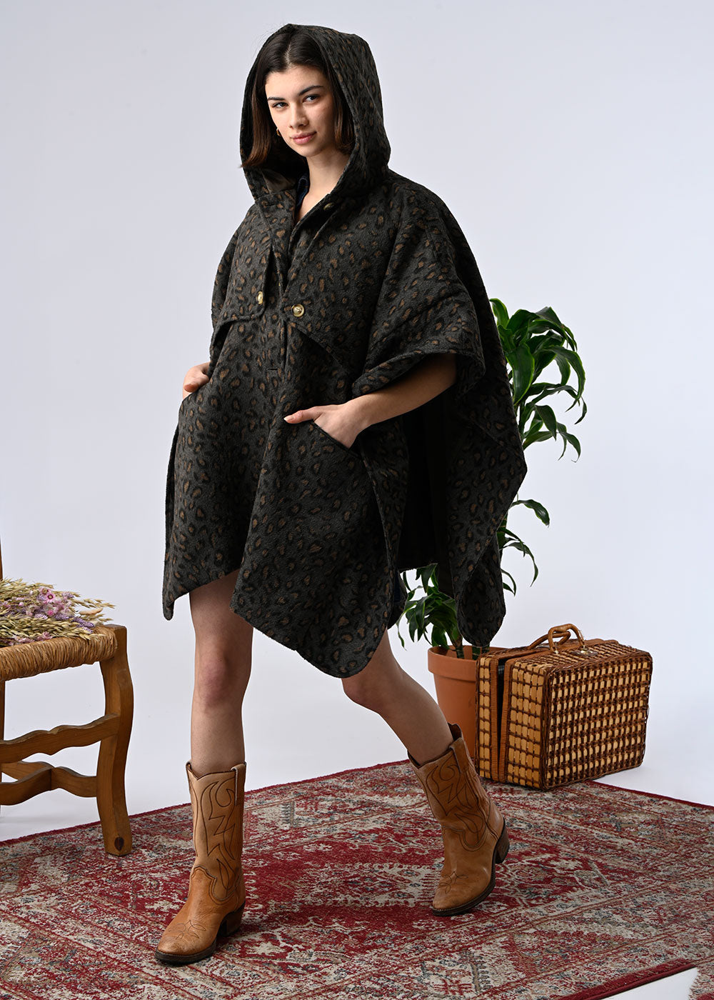A hooded cape-style coat, a statement piece that combines warmth and style. Its flowing, enveloping cut offers comfort and freedom of movement, while the wool adds softness and authenticity. Available in two versions: Leopard print, bold and fashionable, or beige check, more classic and elegant. A statement piece that dresses up on its own, ideal for winter.