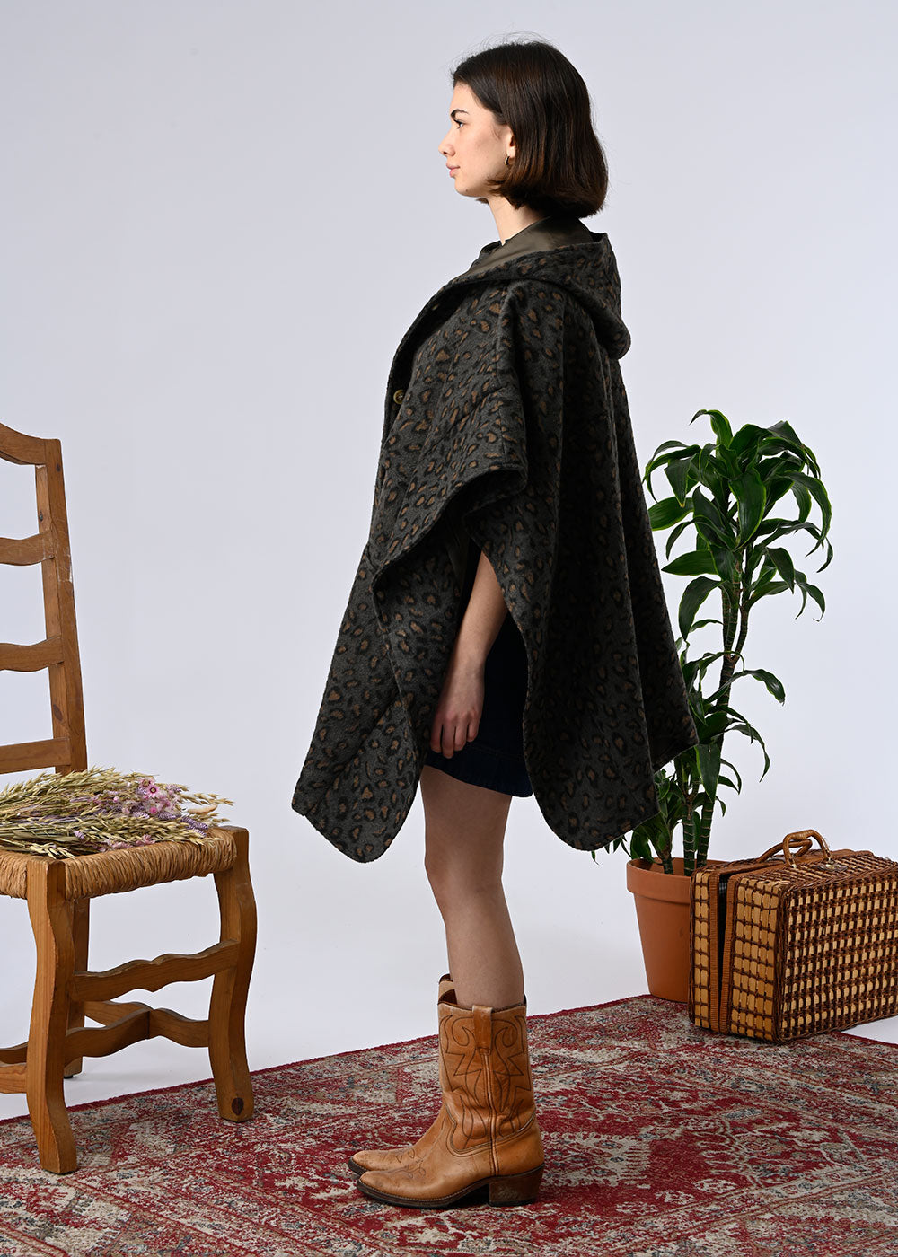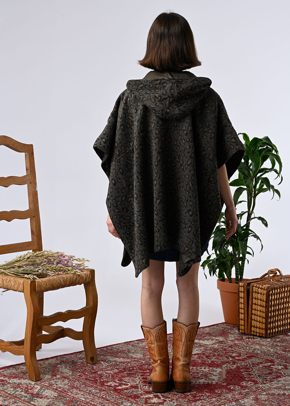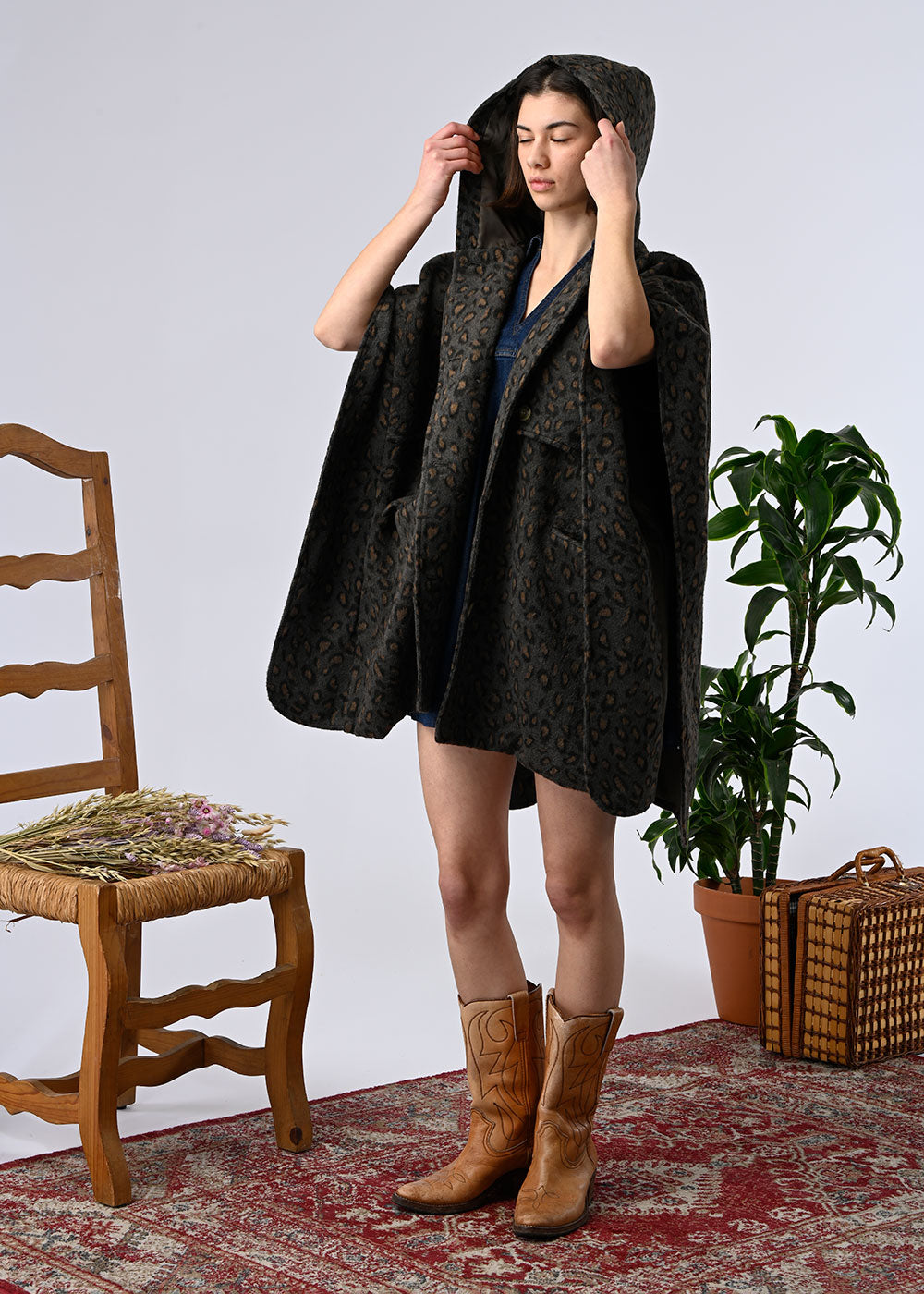 A hooded cape-style coat, a statement piece that combines warmth and style. Its flowing, enveloping cut offers comfort and freedom of movement, while the wool adds softness and authenticity. Available in two versions: Leopard print, bold and fashionable, or beige check, more classic and elegant. A statement piece that dresses up on its own, ideal for winter.