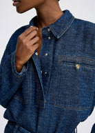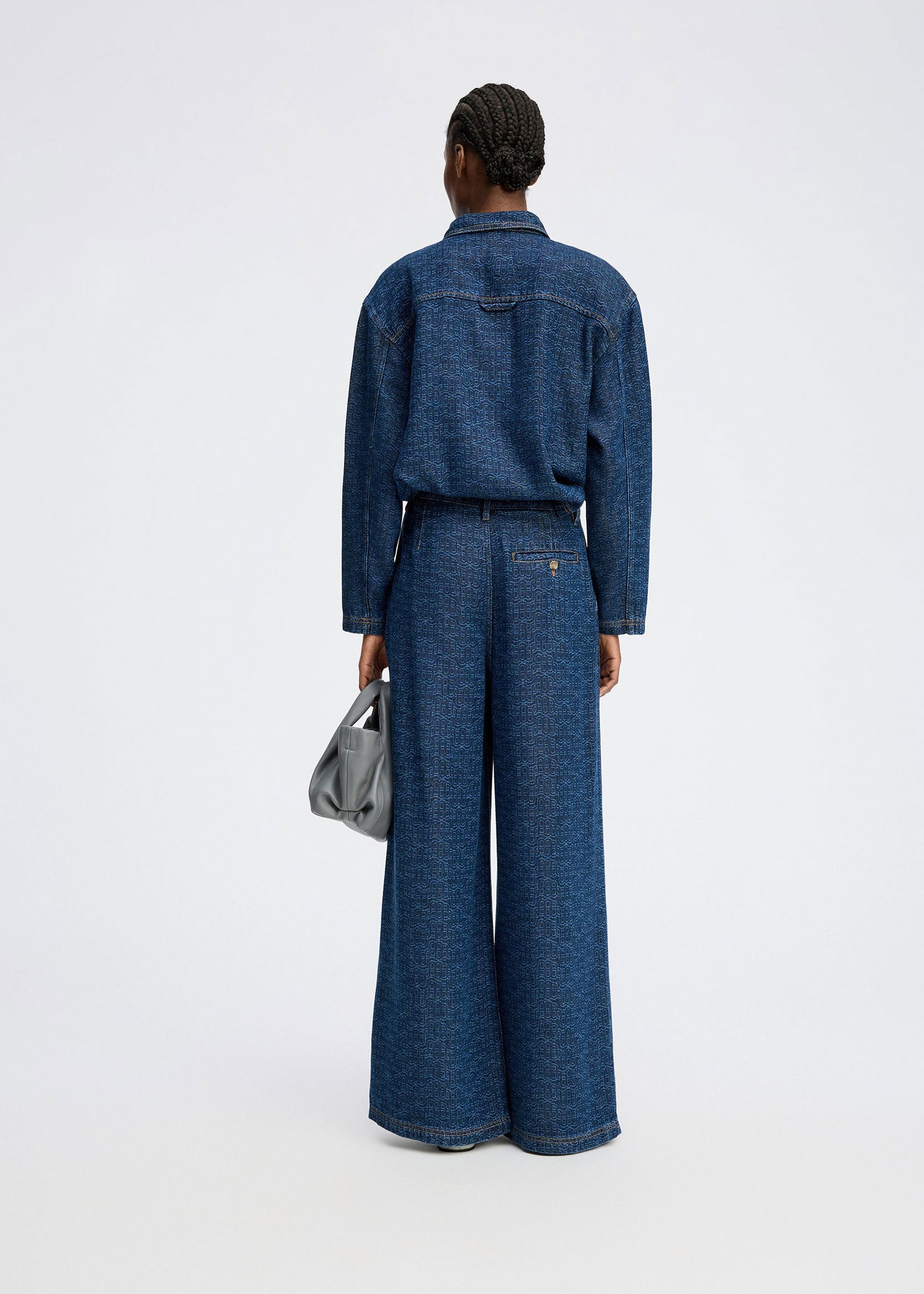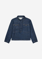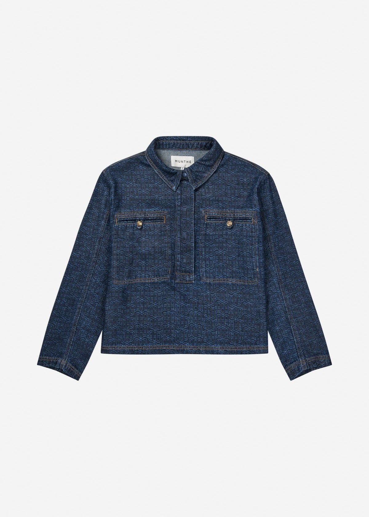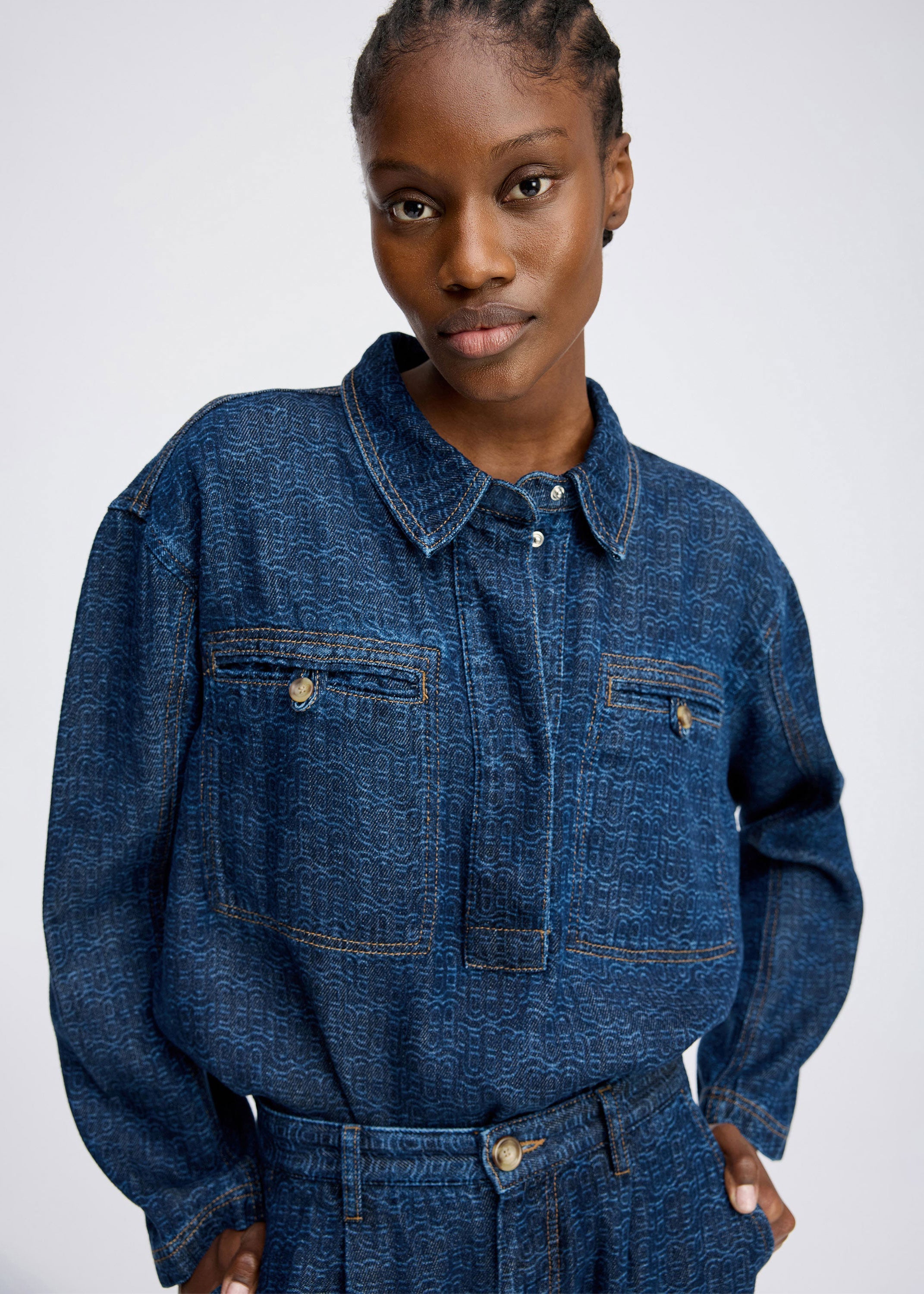 Beautiful denim blouse designed with a subtle logo pattern, hidden button closure, and chest pockets with buttons.