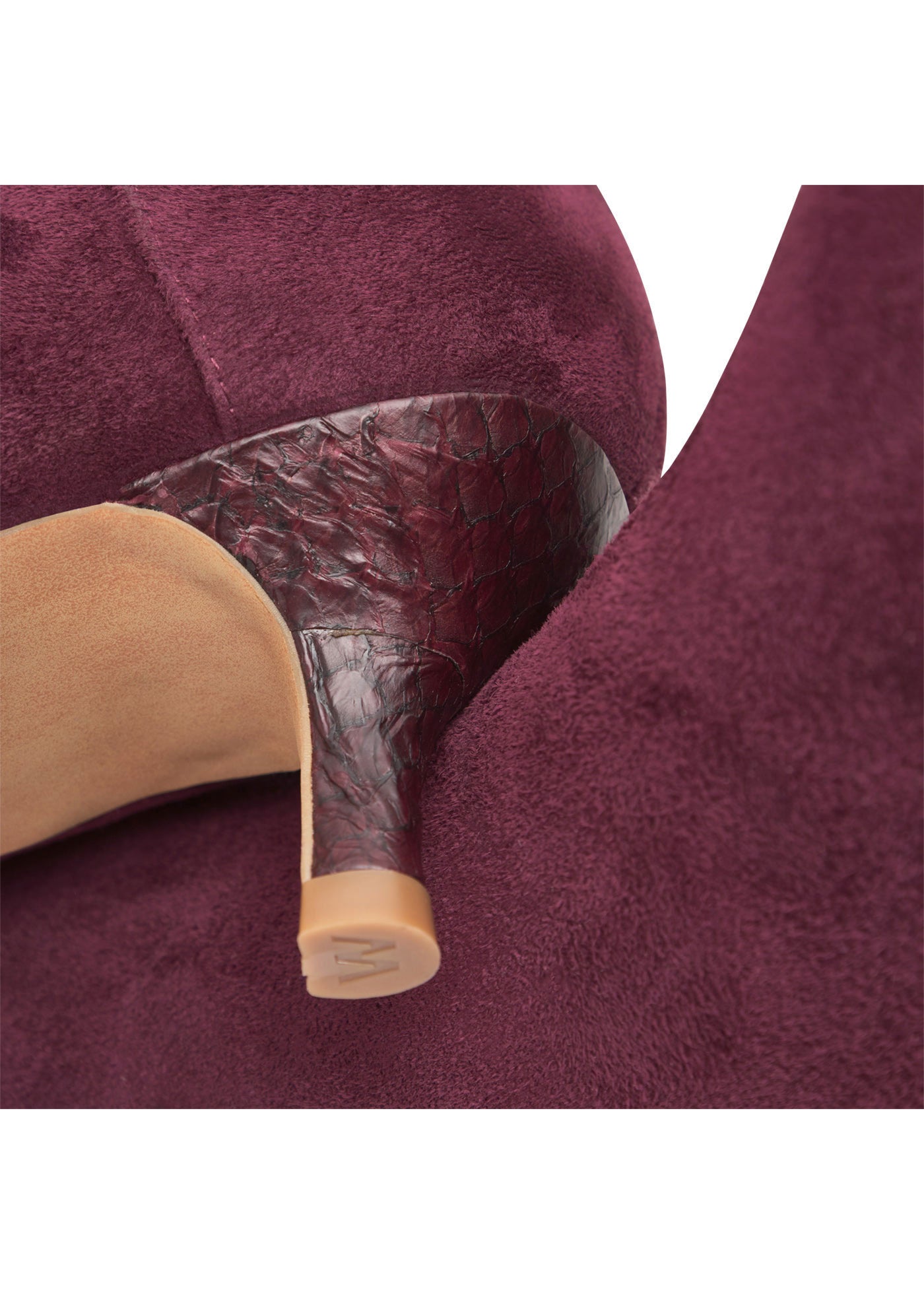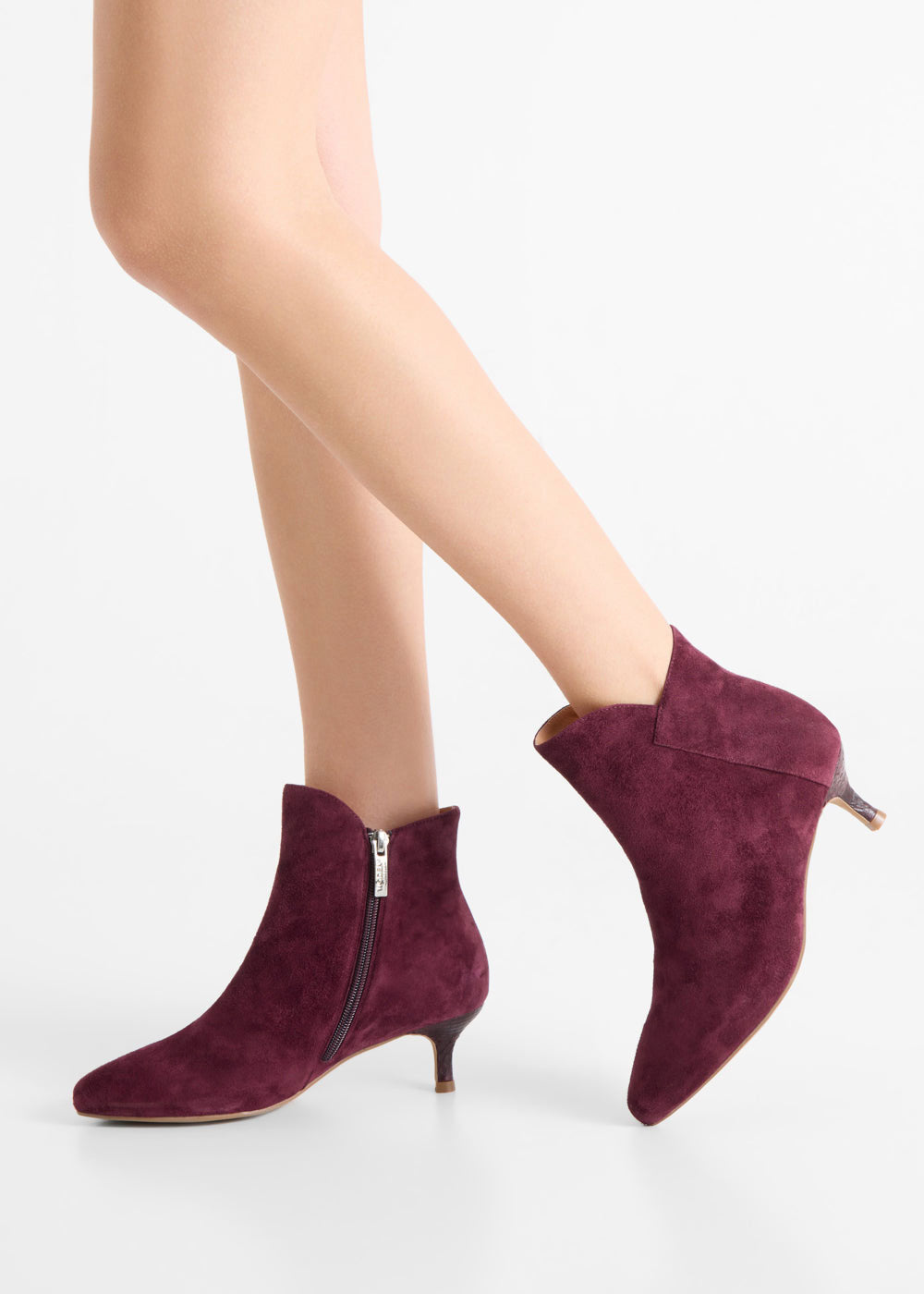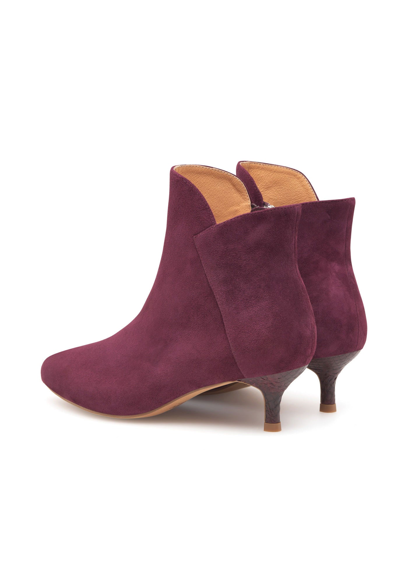 Saga. A feminine ankle bootie crafted from 100% LWG certified suede with ASC-certified fish leather details and practical zip design. Designed with a modern heel and a refined silhouette, this style features WODEN's Natural Soft Technology™ for added comfort, making it versatile for both day and evening wear.