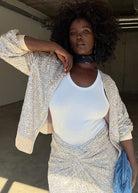 We're definitely bringing feel good dressing to your summer wardrobe with this jacket! Lathered in silver sequins that catch the sunlight like a disco ball, style down with a crisp white tank, or go bold in full sequin. Sequins lined with a weighty satin that feels like it slinks over your figure and ensures a comfortable and non-itchy feel.