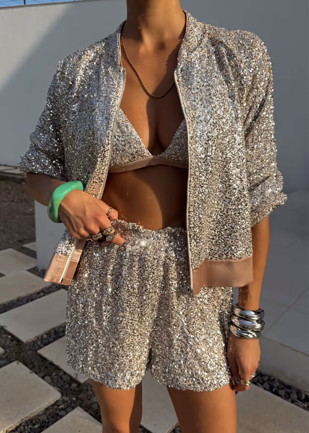 Drenched in silver toned sequins that shimmer in the sun, these statement shorts bring a touch of NFD sparkle to your wardrobe! In a relaxed fit with an elasticated waist, they're the perfect combination of chill/party vibes for a last minute night out look. Lined with a weighty satin that super comfy and gets rid of that scratchy feel, throw on with the matching sequin t-shirt for an effortless co-ord or tone down with a white miley.