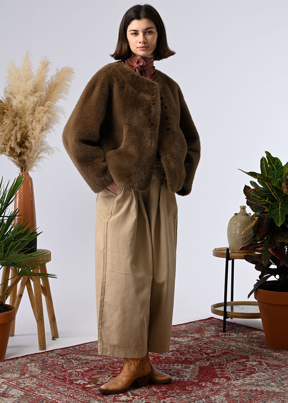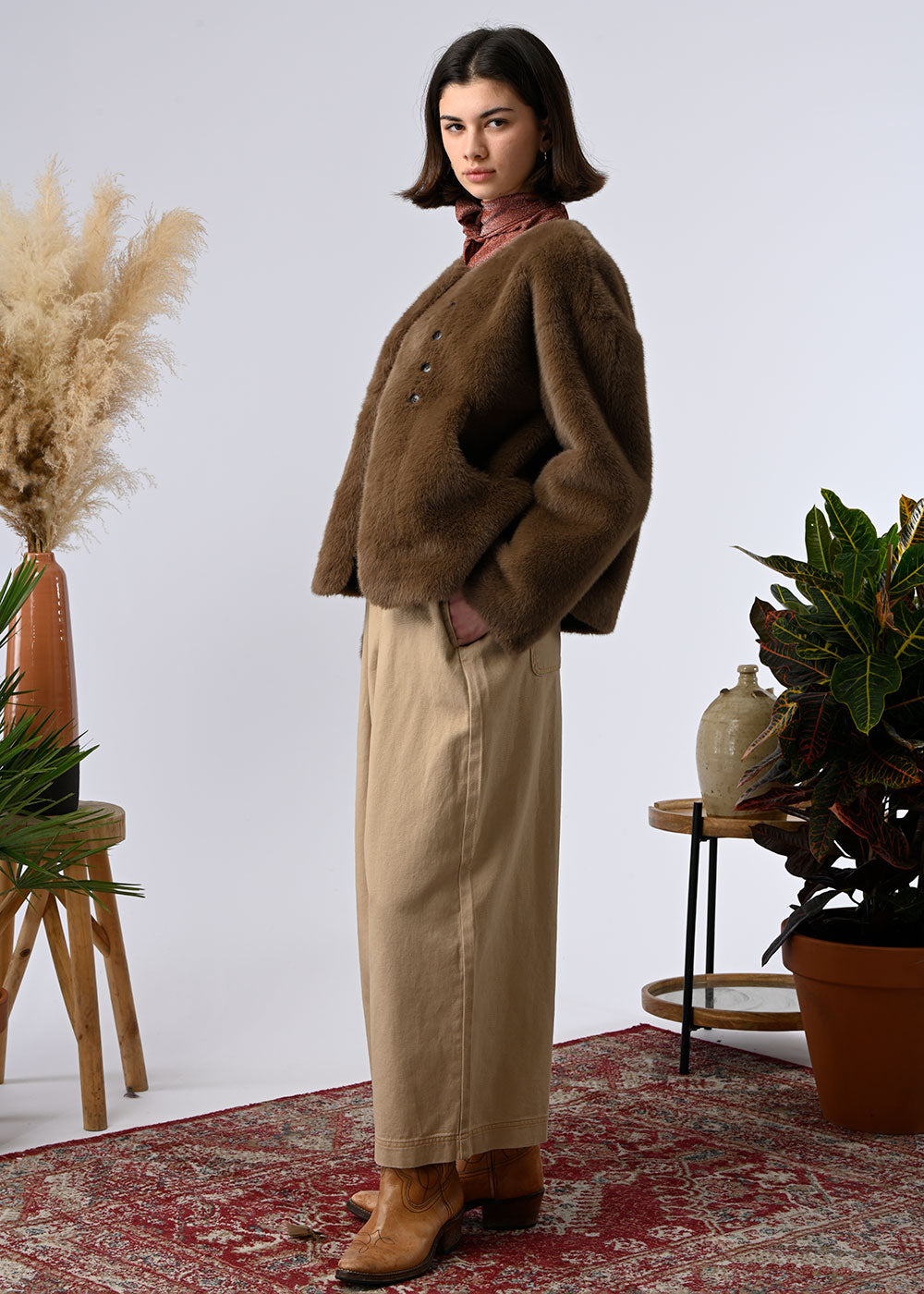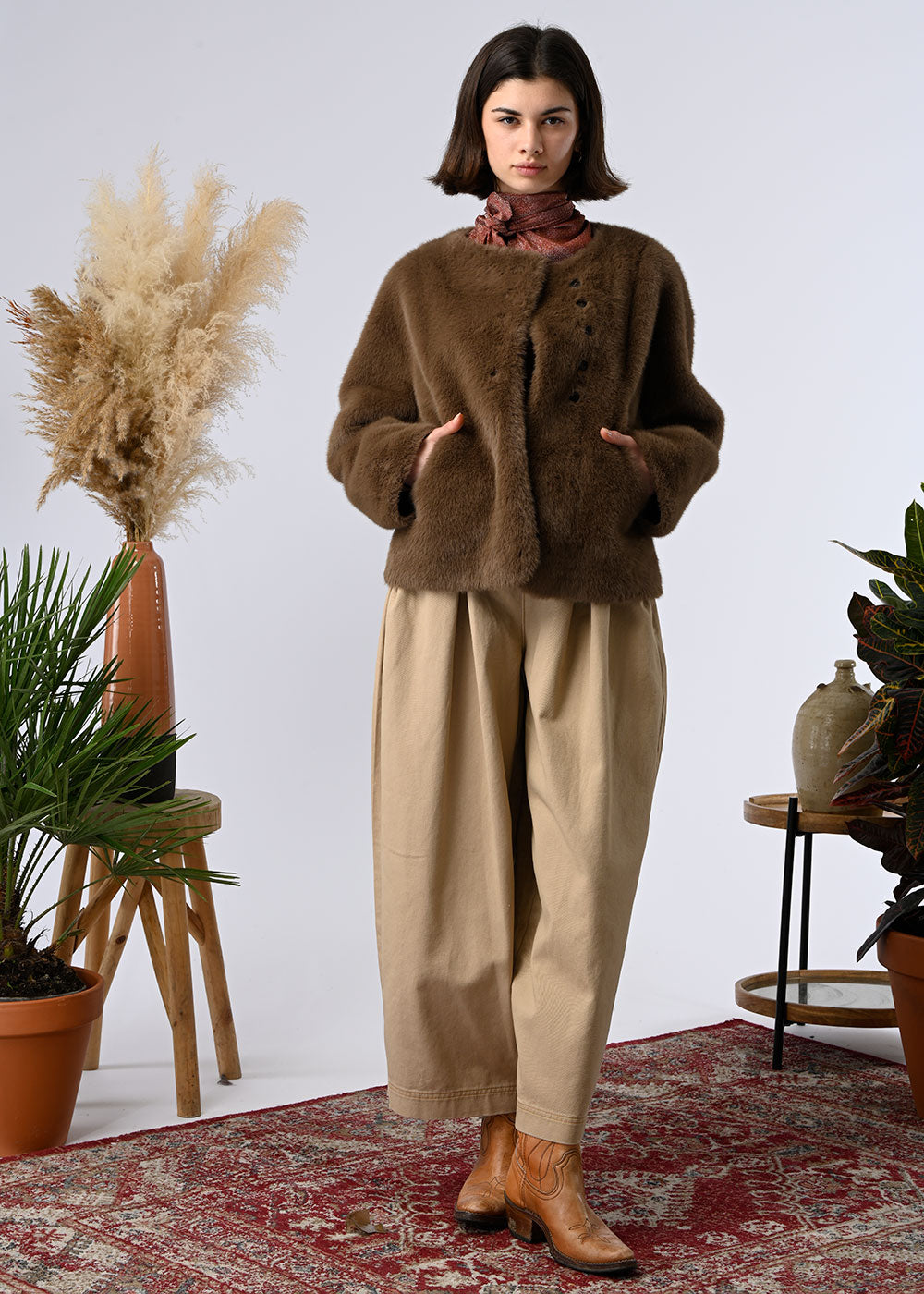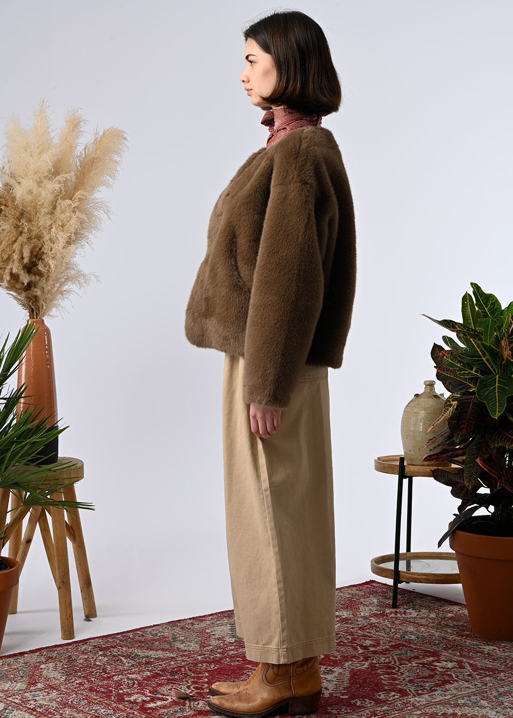 Short faux fur jacket. A soft and refined style with an elegant round neck. Its short cut gives it a modern look, easily paired with an urban or more formal look.