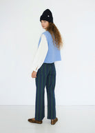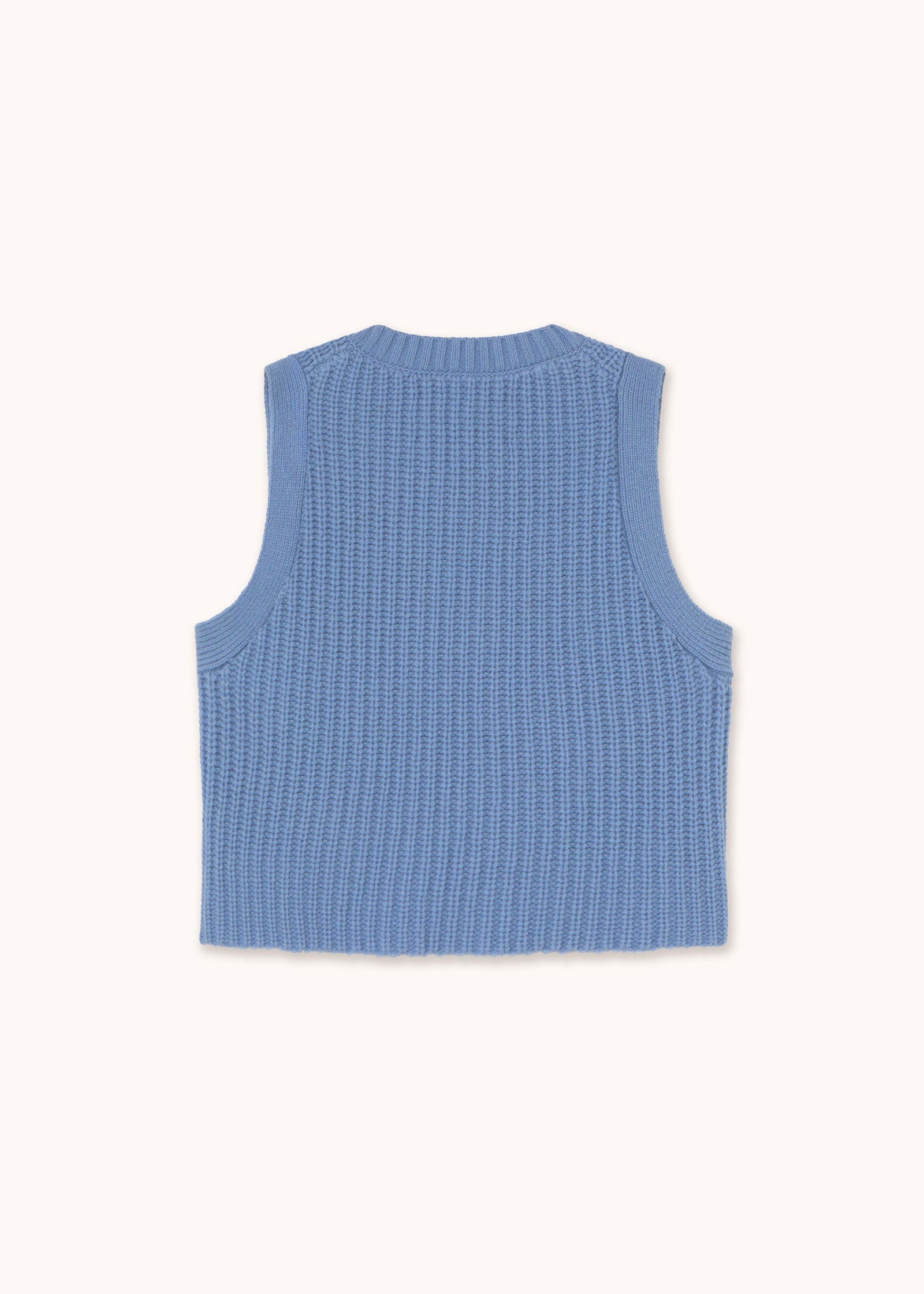 Denim blue merino wool vest with fisherman’s rib texture and lace-detail closure. A refined, textured piece for effortless winter layering.