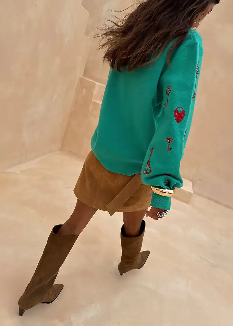 A knit we are truly proud of - a soft touch base, in a slightly boxy fit, that feels so weighty and luxe. A turquoise base with our new key and lock print, hand painted and inspired by intricate little charms found at Kempton market. Adding a touch of colour to your Autumn/Winter wardrobe, it's an NFD favourite!