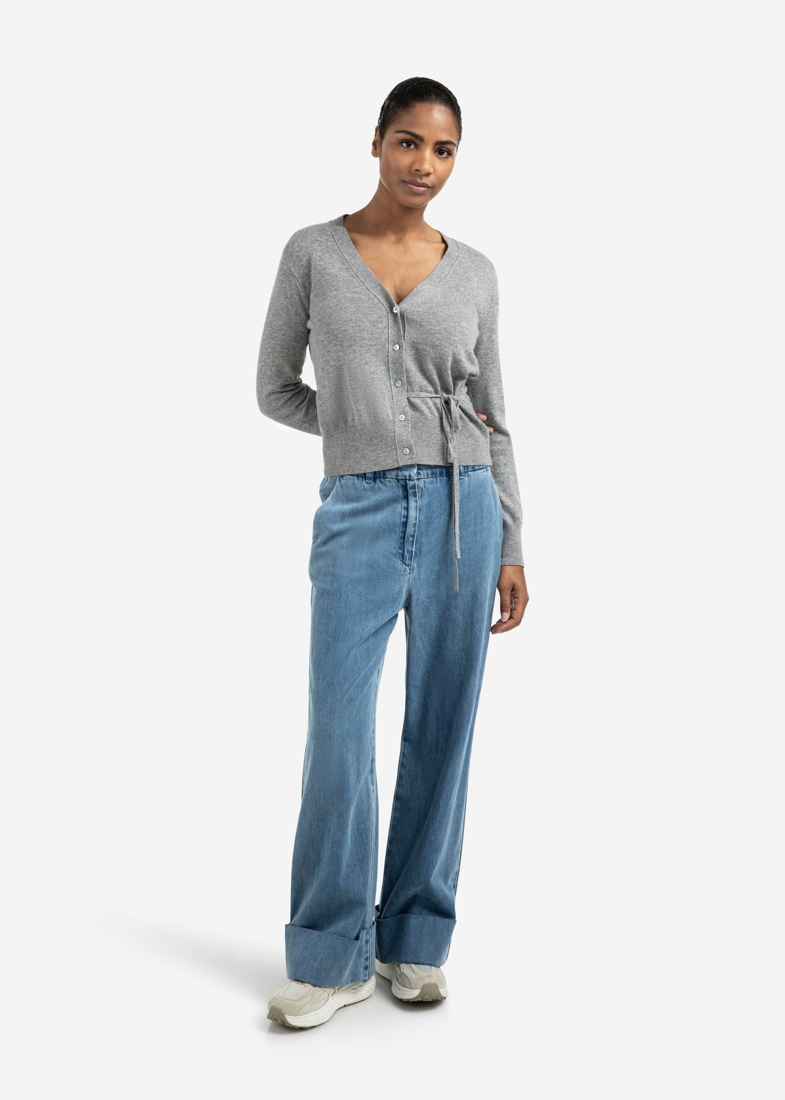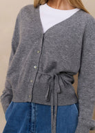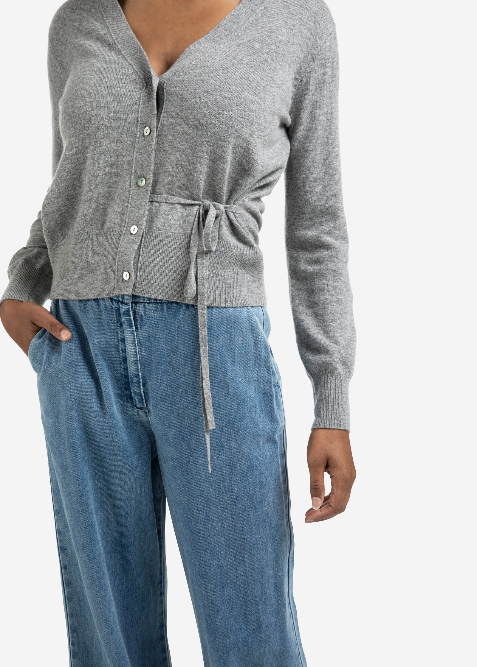 This soft knitted cardigan features a deep V-neckline, button closure and an elegant tie detail at the waist. Finished with long sleeves and ribbed trims for a comfortable, regular fit. A versatile piece that can be styled for both casual and more refined looks. The model is 175 cm and wears size S.